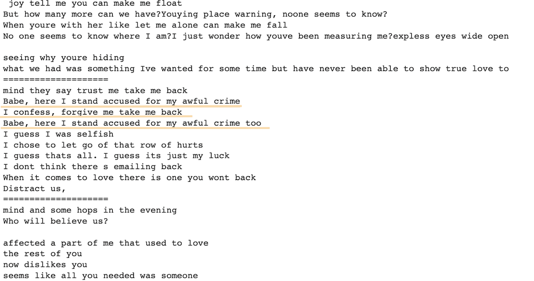 In Figure 1 one can see that the CLG is set to a temperature of 1.5, which one has the option to adjust. When it comes to this AI, temperature means how close to the reference word it is going to produce text. With a low temperature, the CLG will be more restrictive and will most likely have several lines of text that are direct copies of my already written lyrics. An example of this can be seen in Figure 2 below. The reference word to create this text was love, and the AI produced text related to the theme. However, because of the low temperature of 1.5, it created an almost direct copy of one of my already-released songs, Awful Crime. The lines are underlined in the photo. The released lyrics (Lyng, 2021) go like this: