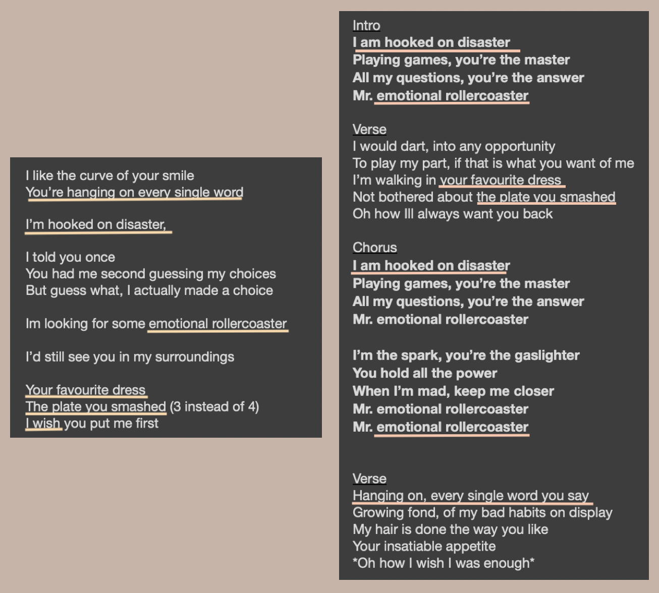 The process Rachel and I use whilst writing goes like this. We open the CLG to trigger inspiration to write a new song. By reading through the text that is generated, we pick out any lines that stand out to us. These lines are copied onto our DAW, which in this case is Logic Pro x. What you see to the left of Figure 3, is a selection of the many lines we found interesting. The sentences that are underlined, are the ones that made it onto the finished lyrics. After structuring these sentences and further developing the idea, the lyrics resulted in what one can see to the right in the photo. The sentences that are underlined here, are the lines that are inspired by what the CLG generated.
