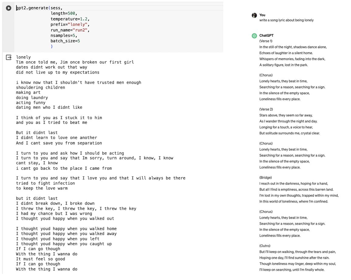 From 2016-2020 I lived in Liverpool, England, where I took my bachelor’s degree in Songwriting and Performance at Liverpool Institute for Performing Arts. During these years, I got to know songwriter and now research music creation specialist, Rachel Meddings, who later became one of my co-writing partners. After graduating, Meddings took her master’s degree in Songwriting, where she wrote a thesis called The AI Songwriter: Coding a Co-Writer (Meddings, 2022) about the audience perception of music made with different AIs. Amongst several AIs, she also created and used her partially homemade AI which is developed based on ChatGPT 2’s technology. The AI is limited to her back catalogue, meaning a collection of all her written lyrics. In that way, she has made an AI that writes lyrics similar to how she does. She called the generator “a machine learning lyric generator trained on 18,000 of my own lyrics”.