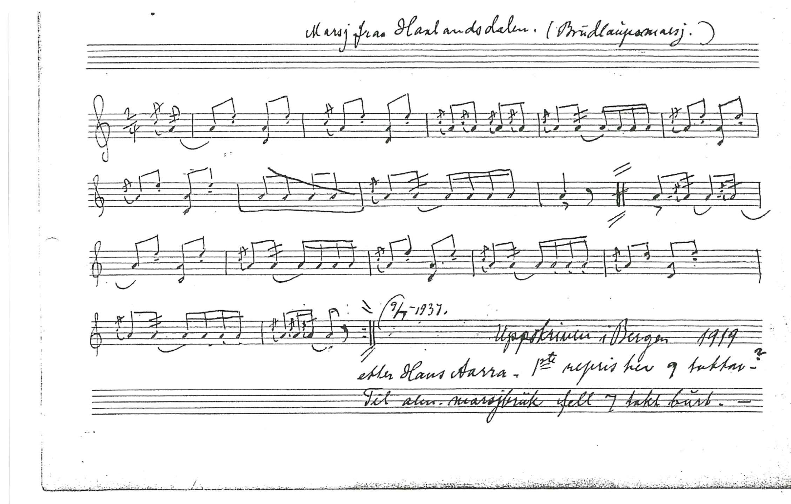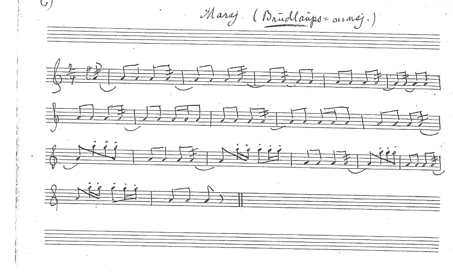 Trumba – Slaattar og Marsjar (J. Sundvor, u.å.j) er tittelen på et av Johannes Sundvors notehefter. Dette er et av mange eksempler på at Sundvor har et tydelig skille mellom slåtter og marsjer, som to ulike kategorier med musikk. Men at de skrives ned i samme notehefte viser at de også hører sammen, og at Sundvors kilder har spilt både slåtter og marsjer. I innledningskapitlet viste jeg til at slåtter lenge har blitt brukt i norske bryllup, og at de ofte kalles bryllupsslåtter. Sundvor betegner også noen av marsjene han skriver ned som bryllupsmarsjer: