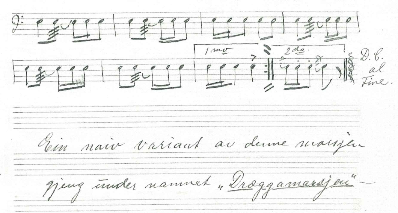 For å vise at tradering av marsjer ikke bare finnes på Vestlandet vil jeg komme med et eksempel på en marsj fra egen barndom. Denne trommemarsjen brukte vi under marsjering i korpset Langesund Skolemusikk. Marsjen har røtter fra Mehamn i Gamvik kommune og Langesund i Bamble kommune, og jeg lærte den av Ståle Sorter. Den har flere varianter, og jeg endrer ofte på små detaljer når jeg spiller den.