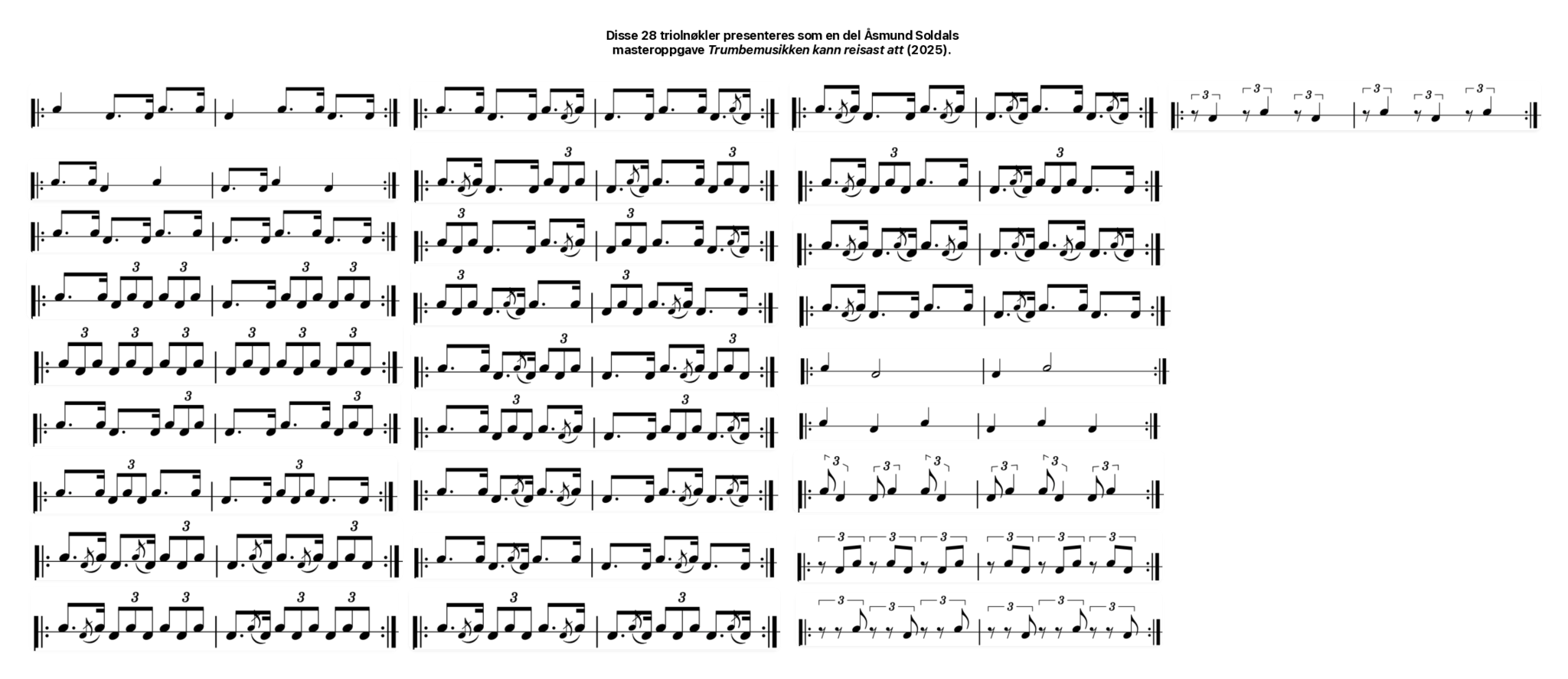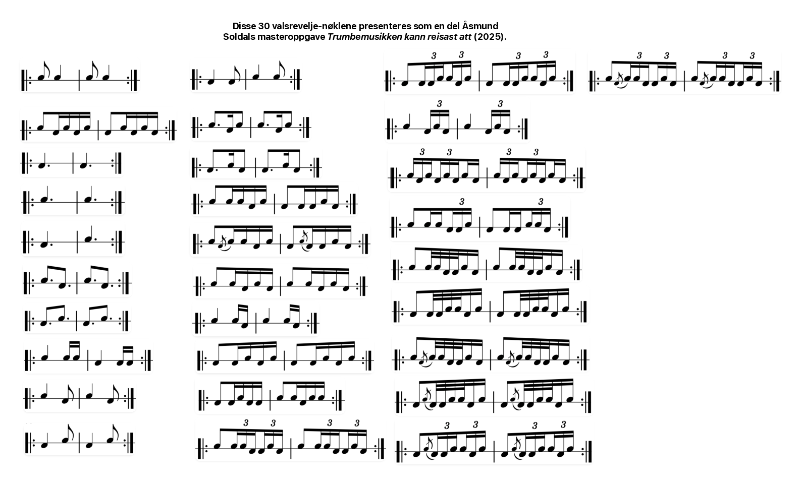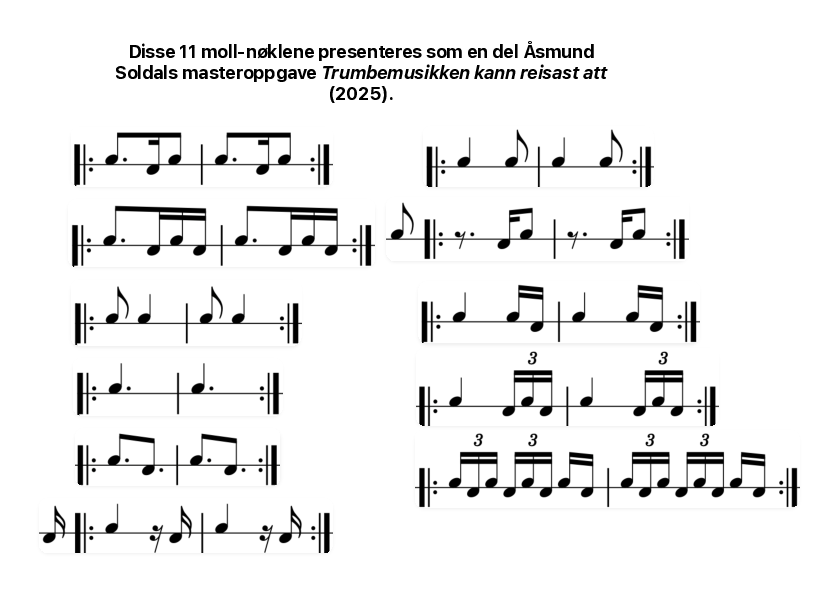 Jeg har delt nøklene inn i kategorier, og disse baserer seg på samme kategorier som i kapittel 3. Det er altså musikken som avgjør hvilke slåtter som havner i samme kategori. Noen nøkler havner i flere kategorier fordi de brukes i flere slåttekategorier. Et eksempel på dette er basismotivet i revelje i moll, som både er en mollnøkkel og en valsrevelje-nøkkel. En nøye lesing av de ulike skjemaene med nøkler vil dermed kunne vise graden av slektskap mellom trommeslåttkategoriene. Alle bildene under kan klikkes på for å forstørres.