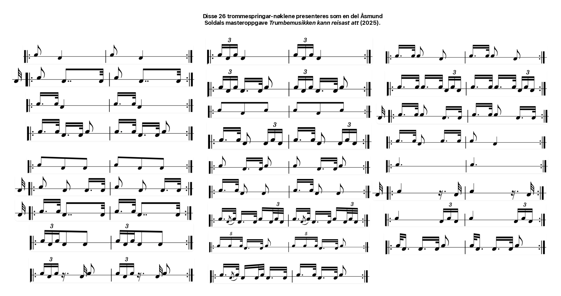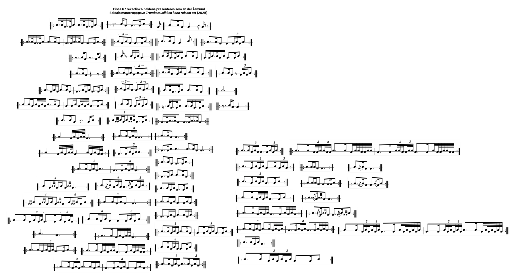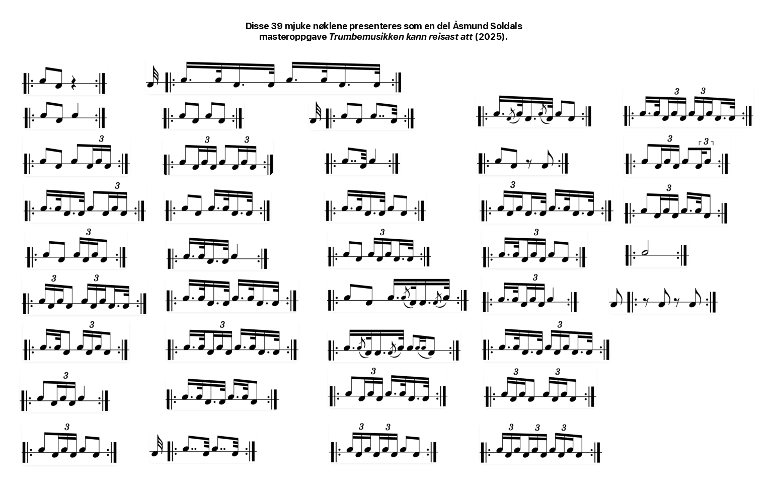 Jeg har identifisert 67 reksolinks-nøkler. I mengde er dette altså den klart største kategorien. En viktig årsak til at denne kategorien inneholder så mange nøkler er at Johannes Sundvor har laga mange reksolinks-øvelser som utvider kategorien. Nøklene som Sundvor har laga er ofte veldig vanskelige å spille, og virker å utforske grensene for mulig trommeslåtteknikk. Interessant er det også at noen av reksolinks-nøklene grenser mot trommespringar-nøkler. Nøklene er som følger: