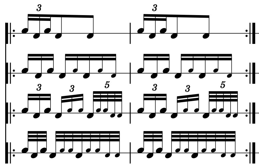 Under følger et eksempel på hvor vanskelig det kan være å notere den underliggende virvelen på en tilfredsstillende måte. Den øverste linja viser måten Sundvor ofte skriver denne spesifikke nøkkelen. Neste linje viser en håndsetting-notasjon som viser armenes bevegelser. Tredje linje viser en måte å notere virvelen så den stemmer overens med Sundvors notasjon. Fjerde linje gir lik lengde til alle slag.