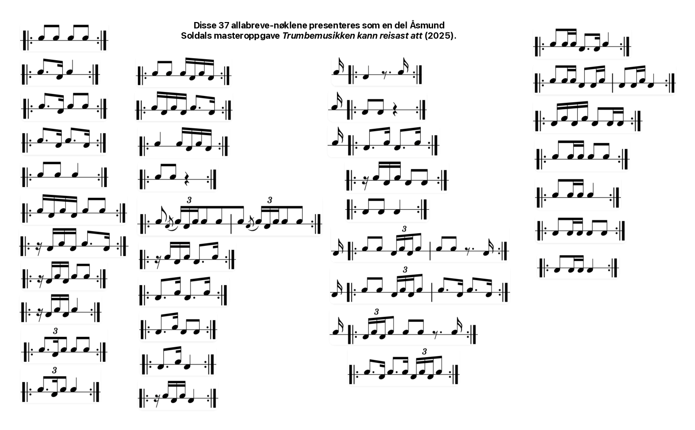 Jeg har identifisert 37 allabreve-nøkler. I tillegg til de typiske nøklene fra for eksempel «Engelsk» revelje og Høylandslåtten har jeg har også tatt med noen nøkler fra Sjuspringen og fra et par slåtter som i utgangspunktet er vanskelige å tolke, men som jeg har kommet fram til at tilhører denne kategorien. Nøklene er som følger:
