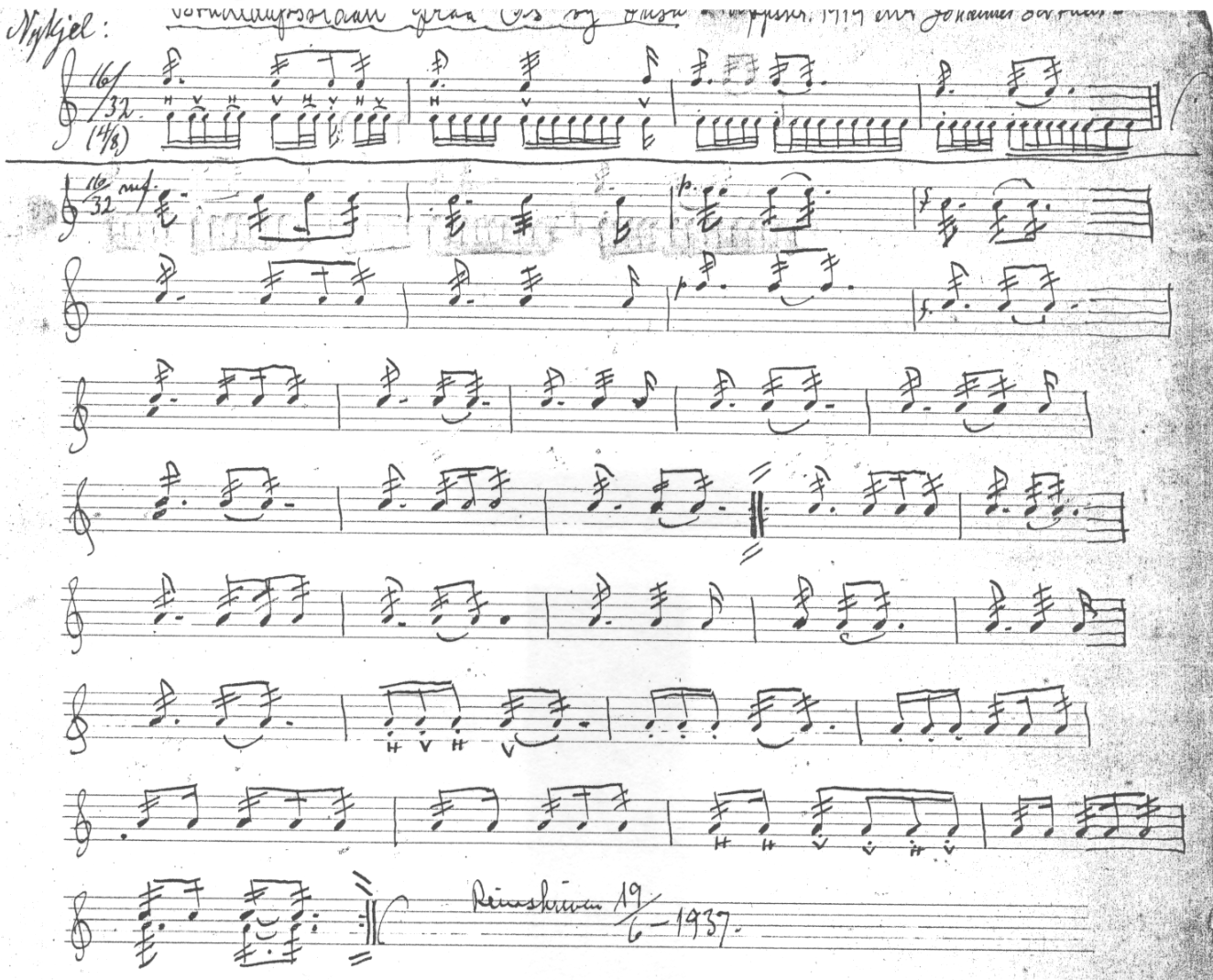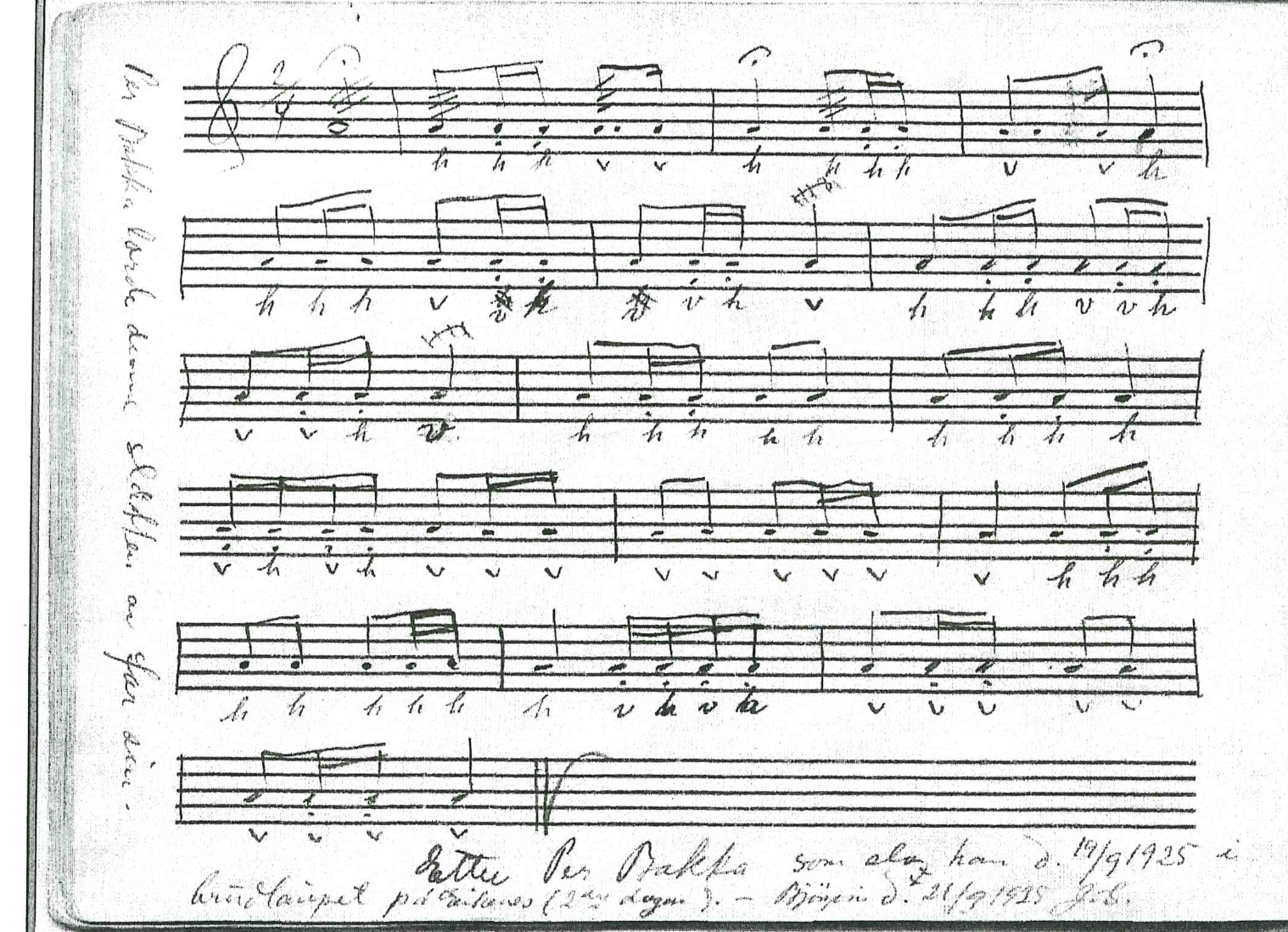 I likhet med majoriteten av Johannes Sundvors noter har jeg valgt å kun skrive melodislaga, og ikke tatt med alle virvelslaga. For en leser som er vant med å lese trommeslåttnoter vil ikke dette være noe problem, og heller gjøre notene lettere å lese. En annen grunn til at jeg har endt opp med å kun ta med melodislaga er at det er vanskelig å notere virvelslaga nøyaktig, spesielt siden disse heller ikke utføres på samme måte fra gang til gang.