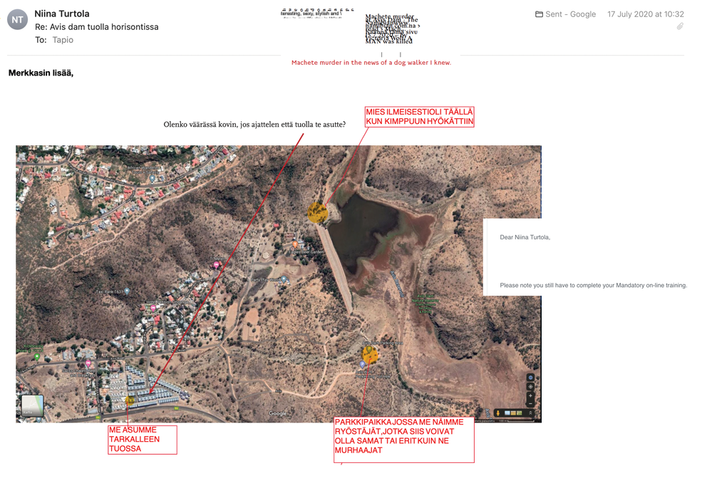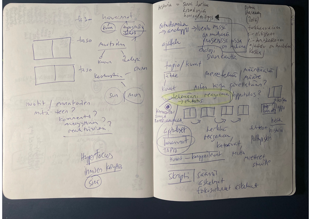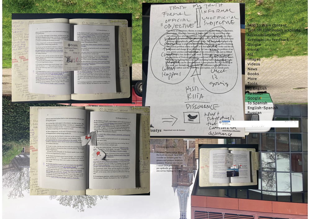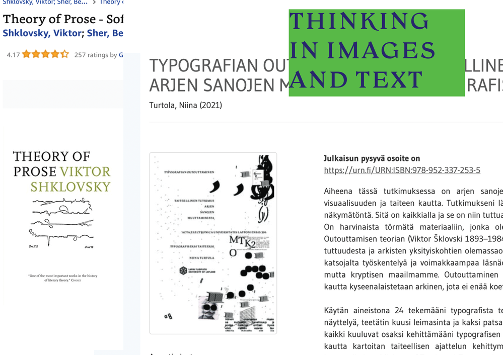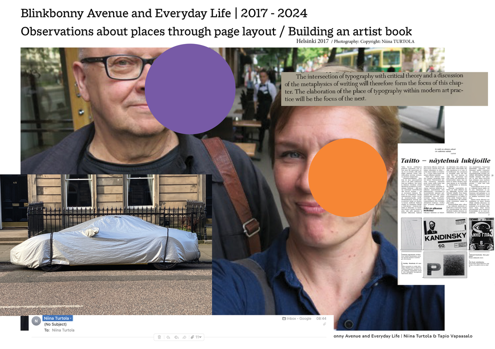 This is a research project into building an artist book that uses typographic devices and page layout in construction a multilayered narrative. Everyday life and actual events are part of of the narrative backbone and this is mostly photographic material. Another layer consists on dialogues (verbal, email, etc) between 2015- and ongoing between the two researchers involved in the project. This is language-based written material. Third layer is the thematic context in building the actual book which happens in the academic presentations, performances and knowledge disseminations.