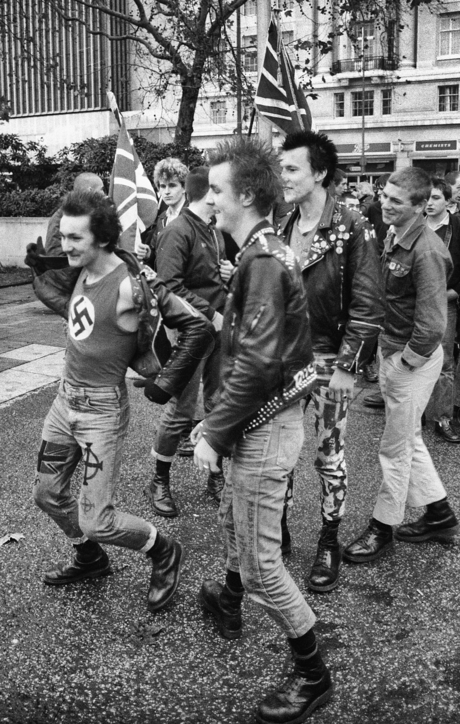 The first Skinheads were non-political. However, affronted with economic upheaval and social tensions that defined the 1980s, many were soon drawn into extreme Nationalism, especially anti-immigration groups. Far-right organisations harnessed the power of the Skinhead image, some were recruited by Neo-Nazi organisations, the movement became increasingly politicised. Demonstrating their fierce patriotism through the participation in right wing marches and rallies, they became ‘social pariahs.’ Racism was expressed through music, fashion and street violence. All Skinheads were tarnished as mindless, violent and racist. As the media failed to differentiation the divide in the subculture, the outfit was a threat in-itself.