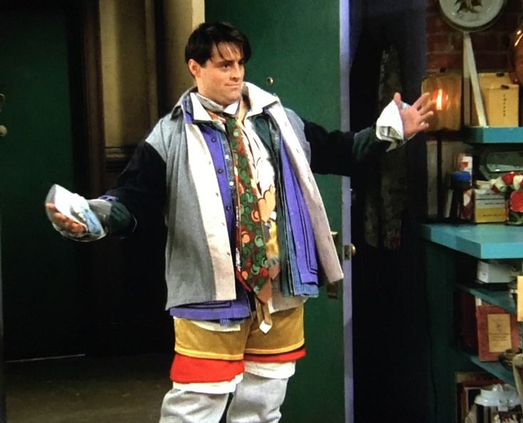 The layering trend can be seen in one episode of a very popular TV show called “Friends”, where the character Joey Tribbiani wears all of his friends Chandler's clothes on. Surprisingly, that outfit is the most remembered fashion moment even though it shows the layering trend in a very obnoxious way