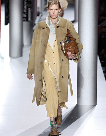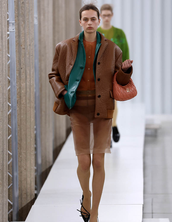 It has been also brought back by Miuccia Prada in the Miu Miu 2023 AW collection with several leather jackets layered on top of each other paired with a sheer skirt where you can see two pairs of tights and underwear showing through. The layering trend has also been seen at the SS24 show with several coats and shirts over each other making all of the different collars visible. The layering was not only focused on the outfit but was also visible in the accessories. The models bag is overfilled and nearly spilling a shoe out of the bag.