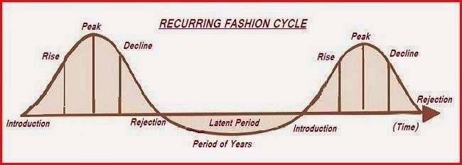 Before, a trend used to reemerge every 20 years. The different parts of the cycle being: Introduction, Rise, Peak, Decline and Rejection and this specific fashion trend would repeat every 20 years. After more media was introduced like magazines, Tvs and the internet the 20 year cycle became a 5 to 10-year cycle. Currently, something can become extremely trendy very quickly and after a couple of months and sometimes even weeks people declare that the trend has gone to far and falls out of style again.