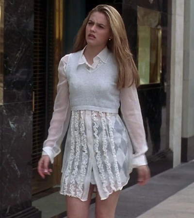 Still, until this day some of the most iconic movies with the styling of the characters were made during that period, so, of course, some of those movies are “clueless”. The main protagonist Cher Horowitz has a very distinguished style of clothes. She looks chic and preppy and often even layers colors over each other. Cher can be seen wearing shirts under sweater vests, turtlenecks under dresses, different kinds of cropped cardigans or jackets over shirts, and of course in the famous P.E. scene she has layered a black tank top over a white T-shirt. Cher's outfits remain iconic and timeless, and they influence many people to recreate them, even Bella Hadid has been spotted wearing a very similar outfit with a striking similarity to Cher’s P.E. outfit with even the colors being the same.