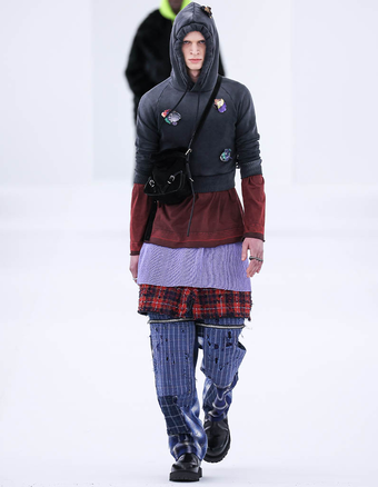 The layering trend has been shown in menswear at Balenciagas AW18 or the Givenchy AW23 collection and it is completely different. The layers are shown in a nearly comical and obnoxious way, striking a resemblance with Joey Tribiainis over the over-the-top layered outfit. There are hoodies over several shirts paired with layered plaid skirts over pants and every single piece of clothing has a different texture, pattern, and color. Has layered 5 coats jackets and hoodies over each other but paired it surprisingly with plain pants and elegant shoes.