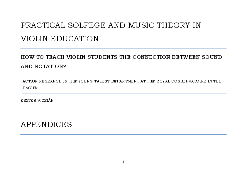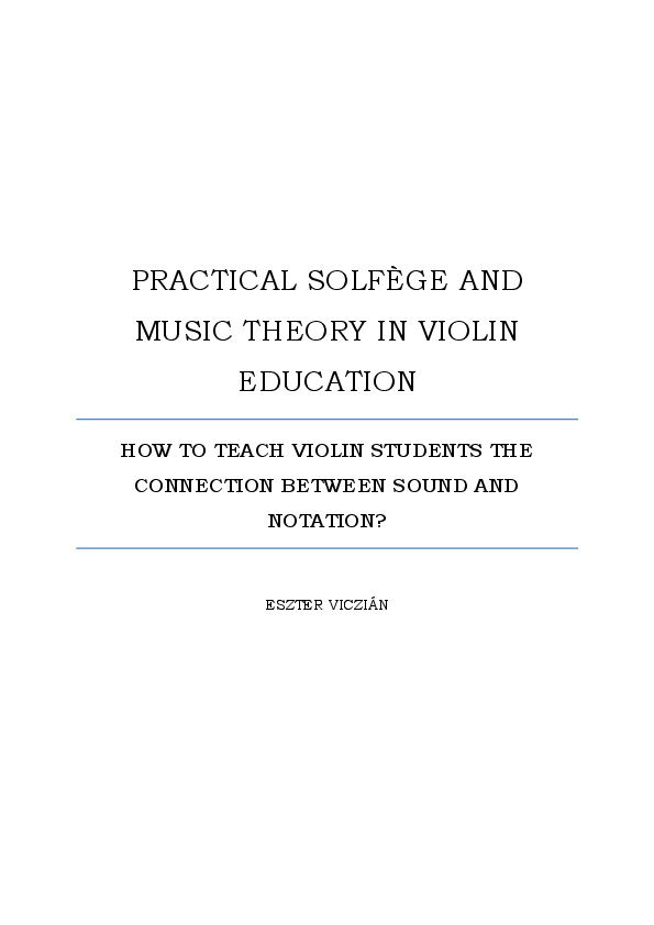 Nowadays, violin students in conservatoires often learn solfège and music theory by singing and using the piano. For some instruments it is difficult to apply the acquired knowledge because it needs to be ‘translated’ into a different context. The main goal of this study is to get more information of working with an approach where violin playing is integrated into the teaching of solfège and music theory. At the beginning of the research a literature study was done to consider music learning theories and to analyse violin methods. Then an action research was conducted to take into account the ways in which solfège and music theory can be taught in a group violin lesson context. The lessons took place in the Young Talent Department at the Royal Conservatoire in The Hague among 7- to 17-year-old students. The action research consisted of three cycles. The findings are that students in general had no difficulty with playing by ear and singing with relative sol-fa names. Results from the analysis of the transposition, note naming and writing exercises indicated that students’ knowledge of absolute pitch letter names and the tone- semitone relationships between neighbouring notes were not at the same level. During the evaluation process of students’ answers to these exercises, some violin and theory teachers presumed that the difficulties could emerge partly from the fact that in most violin schools the first note reading exercises are not in C major but in G, D or A major. Hence students easily get confused when they become familiar with some augmented notes (e. g. f sharp, c sharp, g sharp) before they learn how to play and read their natural versions. My conclusions are that playing by ear and singing with relative sol-fa names can be good basis for teaching the connection between sound and notation. When introducing absolute pitch names it is advisable that violin and solfège teachers compose the content of the lessons together. Transposition exercises from the very early stages using just two-note melodies give good opportunities for applying knowledge into violin playing. For illustrating the tone- semitone relations between the notes Lego models can be used. Singing with ABC or sol-fa names while playing and subsequently notating these transposed notes gives a multimodal experience for students.
