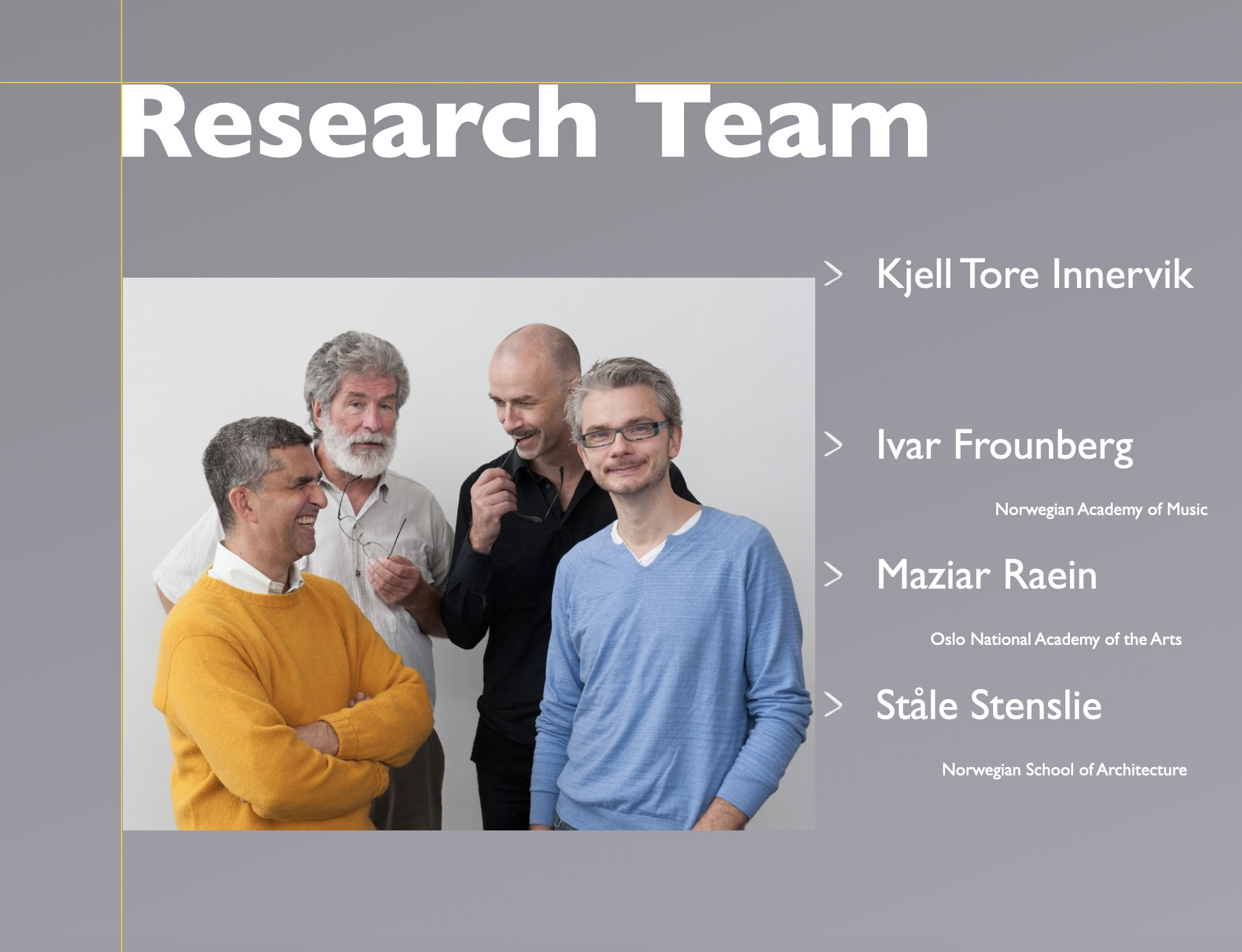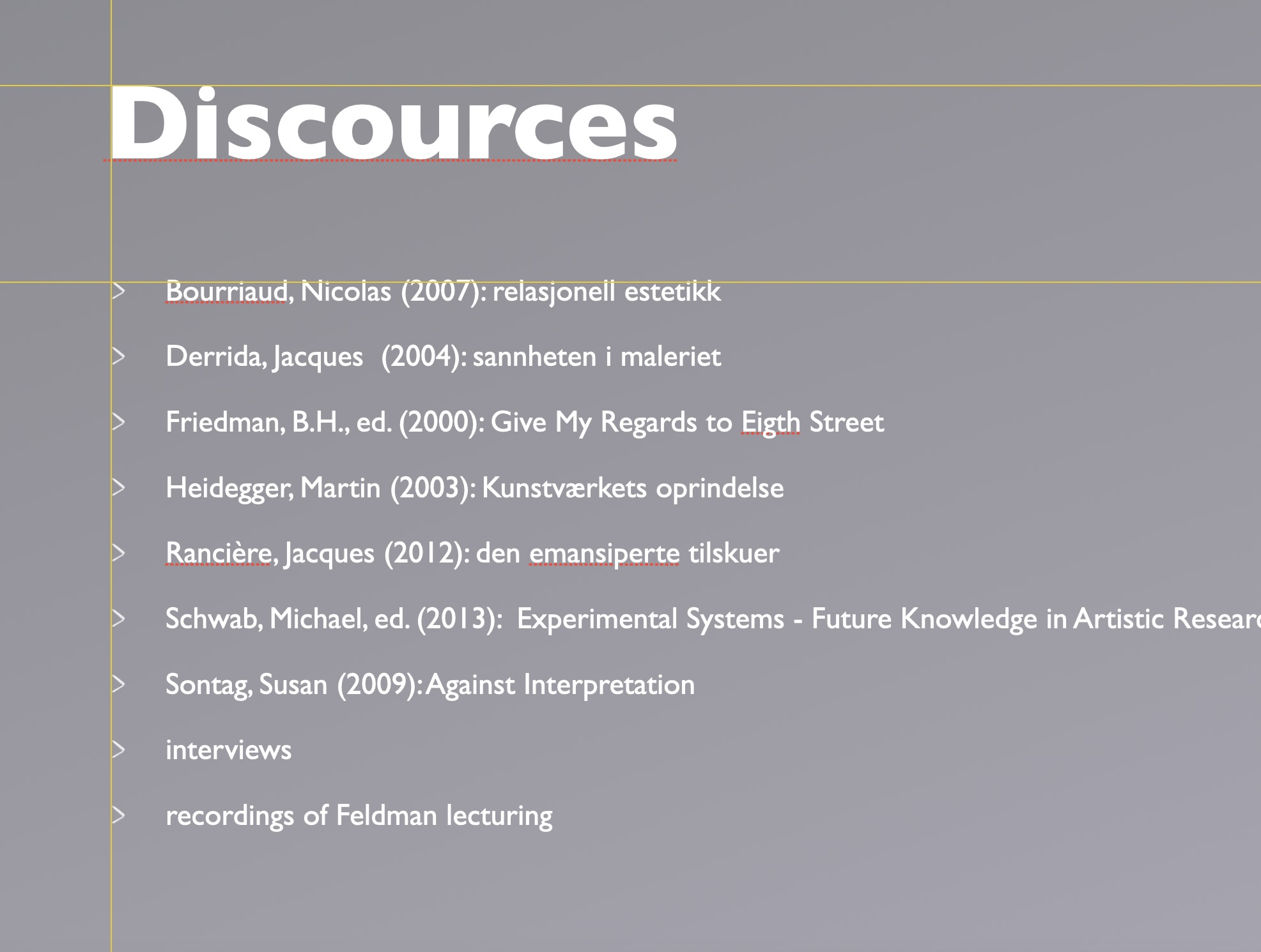 Discourses employed in this project (this is a selection of the readings undertaken) were wide ranging and enabled the musicians and designers to develop a shared perspective in order to; develop the artistic elements of the project as well as reflecting on the nature of artistic reseach projects, and methodlogies of research employed.