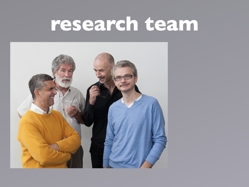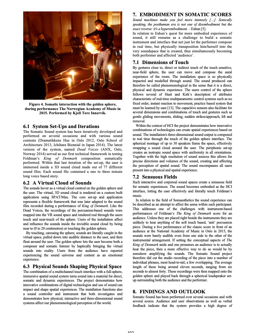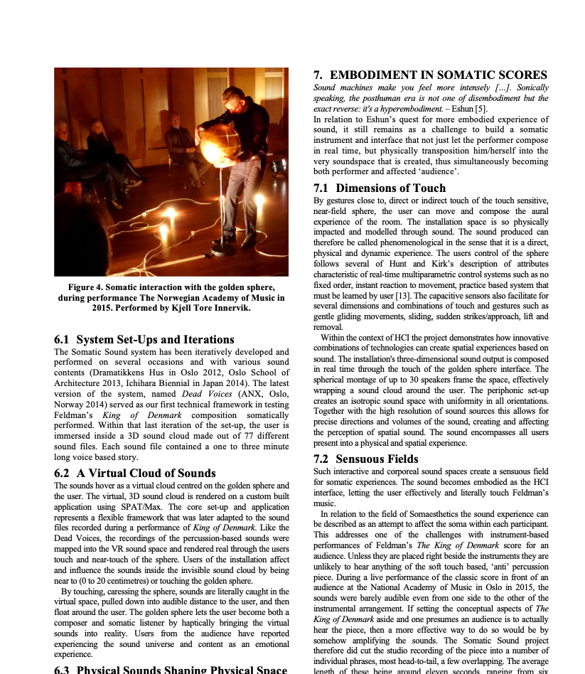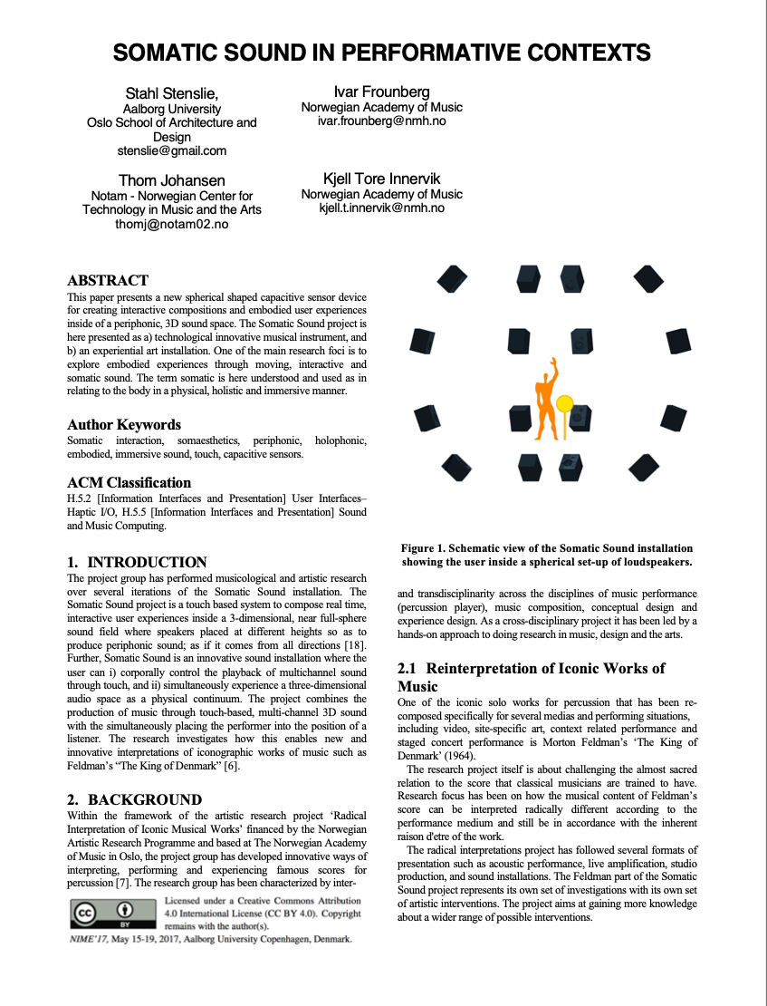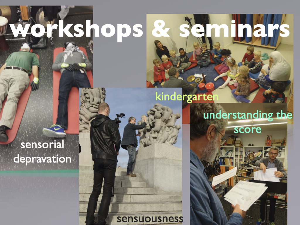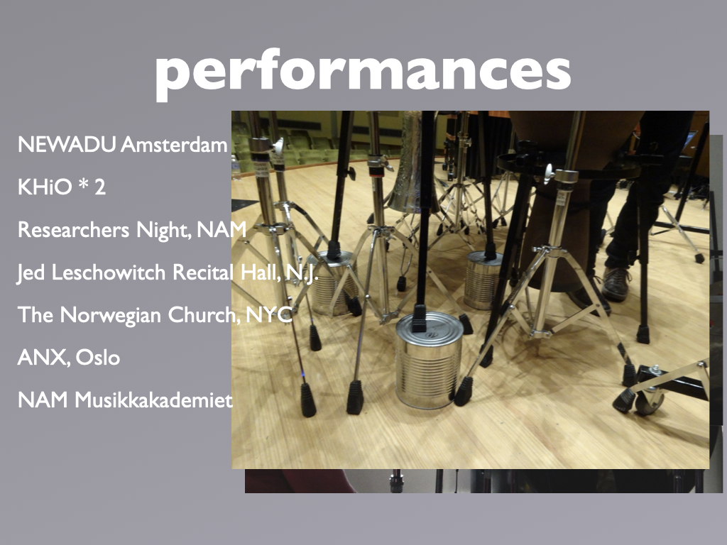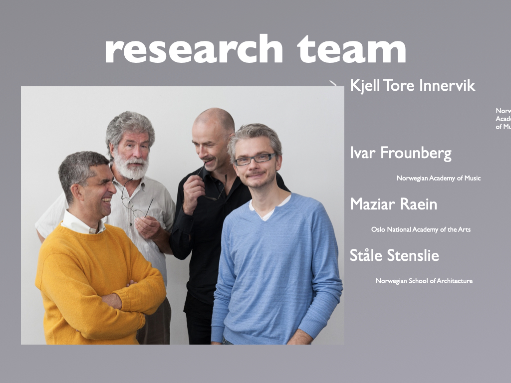 Participants: percussionist Kjell Tore Innervik, Norwegian Academy of Music (NMH), composer Ivar Frounberg, NMH, designer Maziar Raein, Oslo National Academy of the Arts, experience designer Ståle Stenslie, The Oslo School of Architecture and Design, and music recording producer Morten Lindberg.