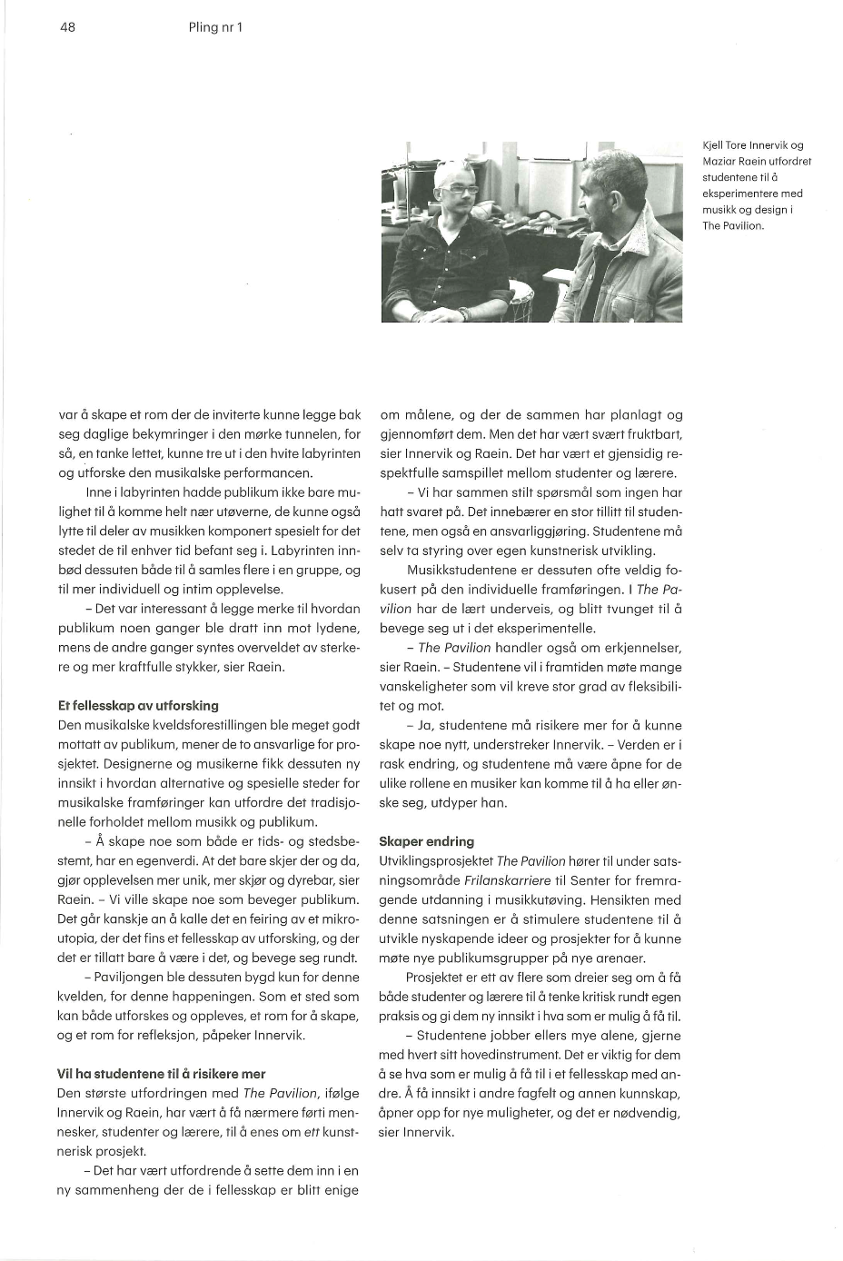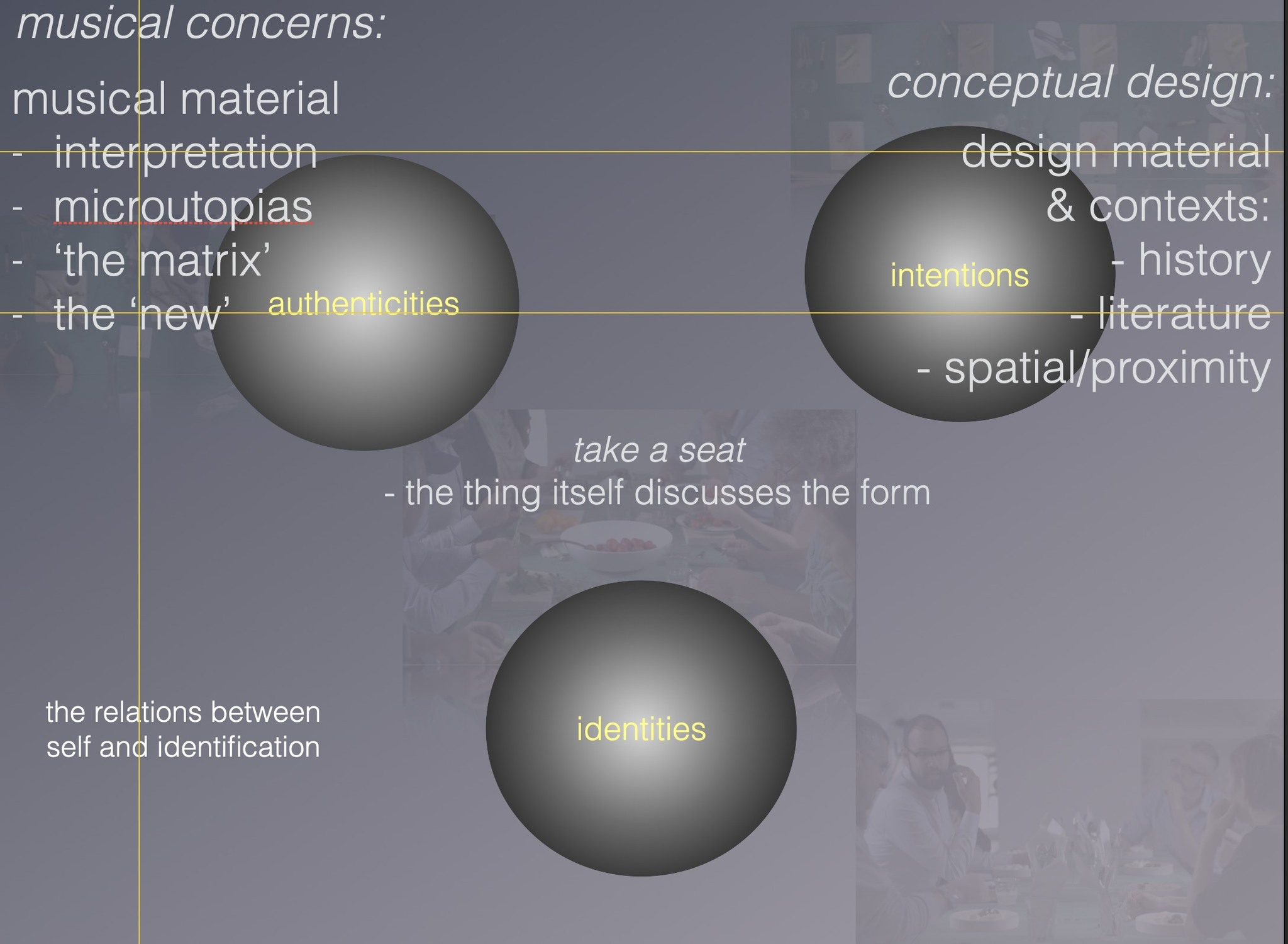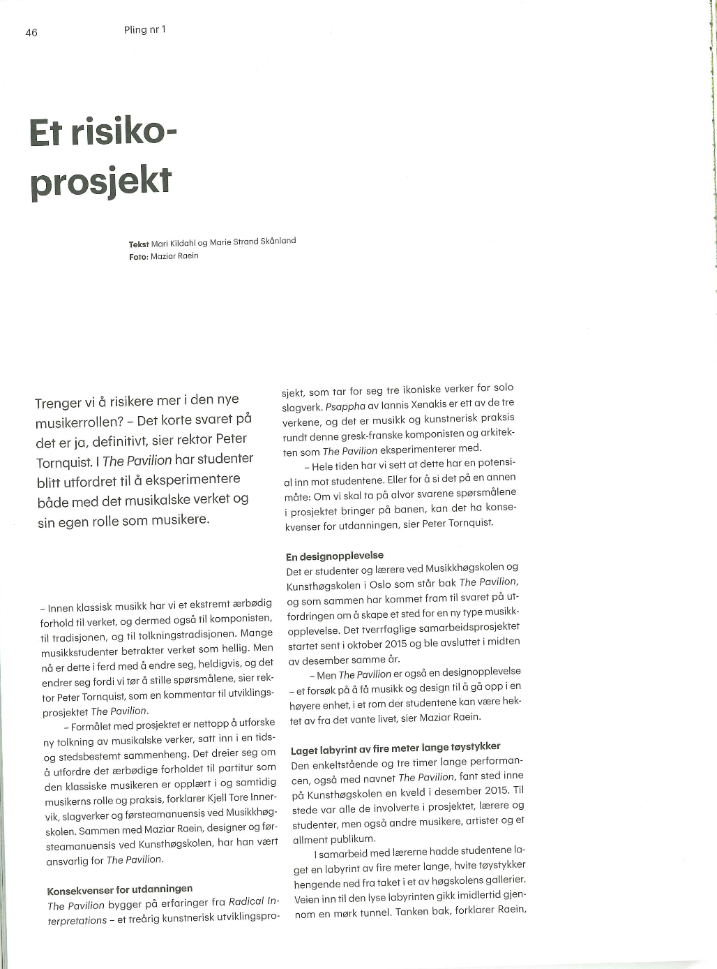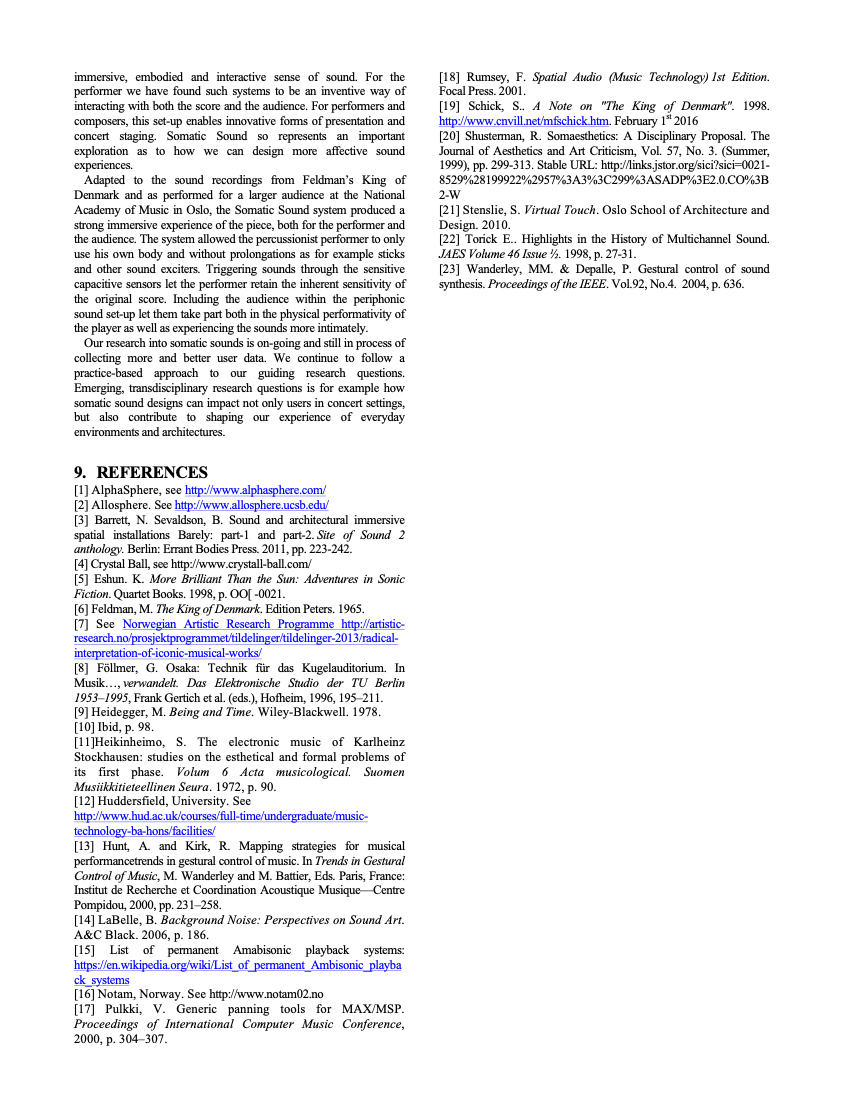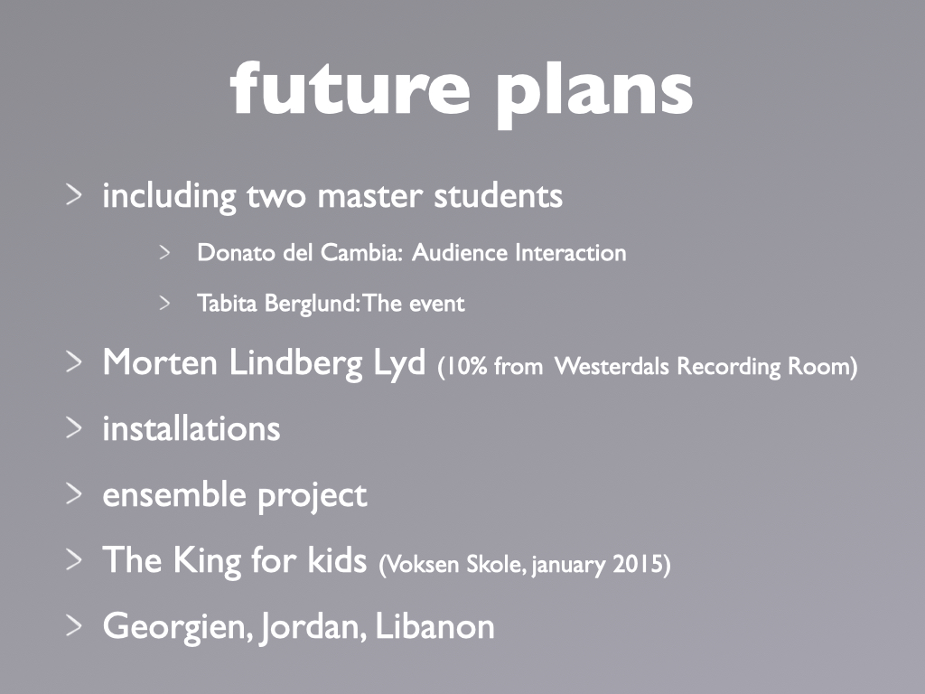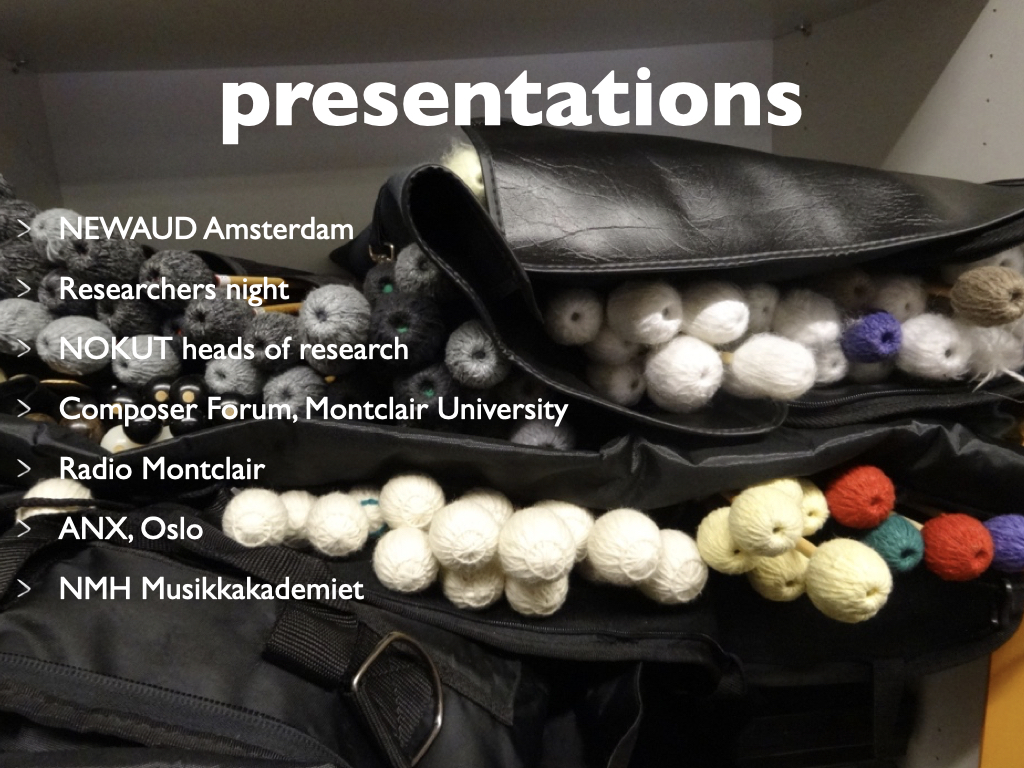 Participants: percussionist Kjell Tore Innervik, Norwegian Academy of Music (NMH), composer Ivar Frounberg, NMH, designer Maziar Raein, Oslo National Academy of the Arts, experience designer Ståle Stenslie, The Oslo School of Architecture and Design, and music recording producer Morten Lindberg.