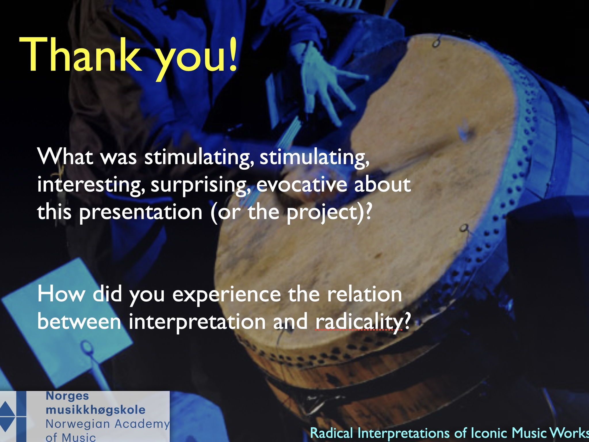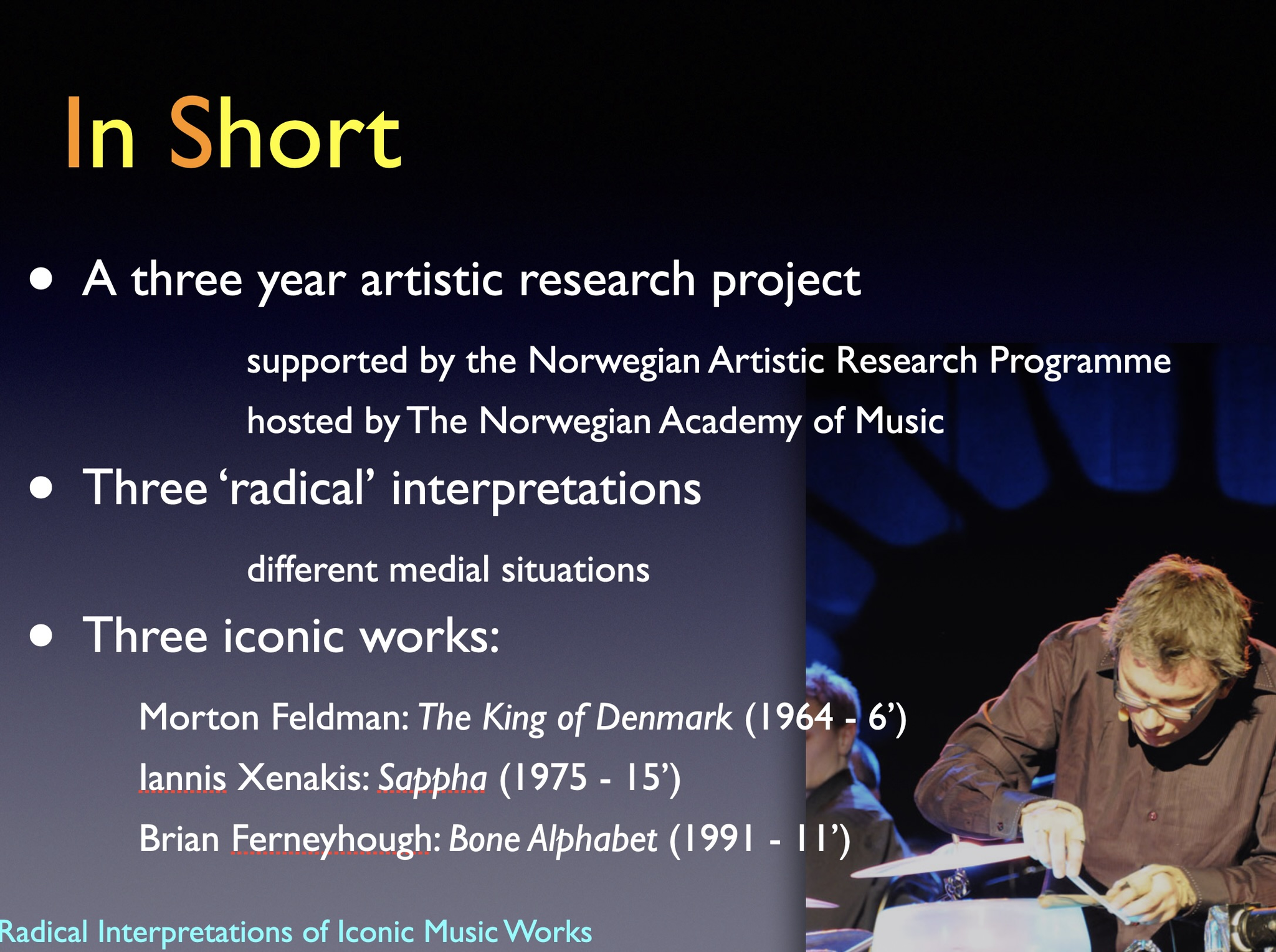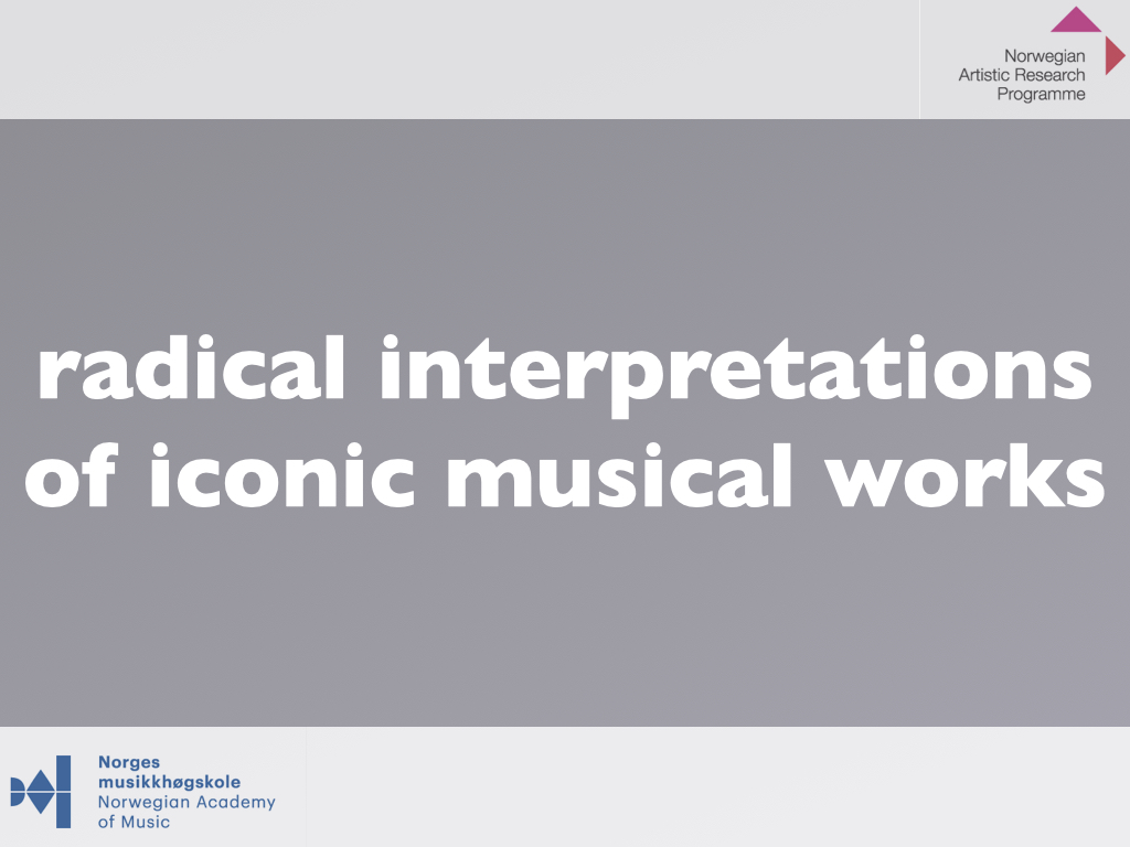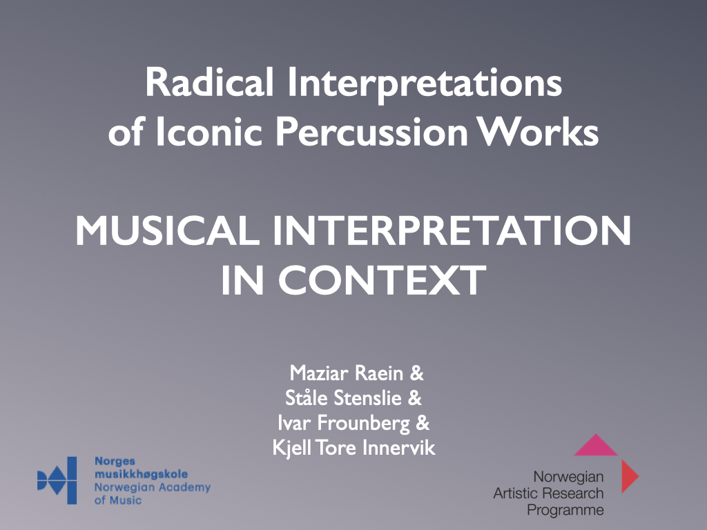 The artistic development project Radical Interpretations investigates two iconic works for solo percussion and re-composes these. The goal of the project was to develop new creative and transdisciplinary research in interpretation of musical works.