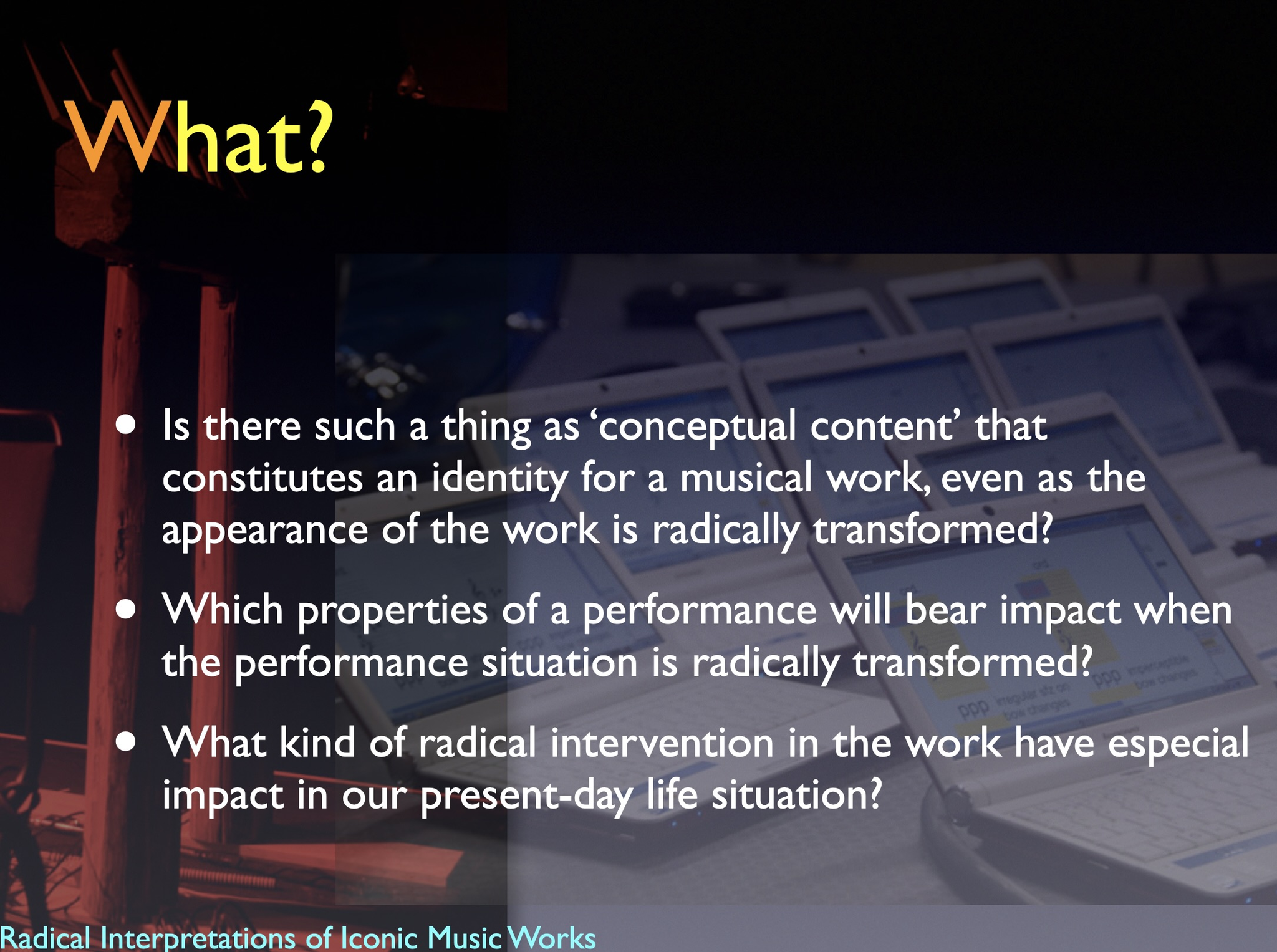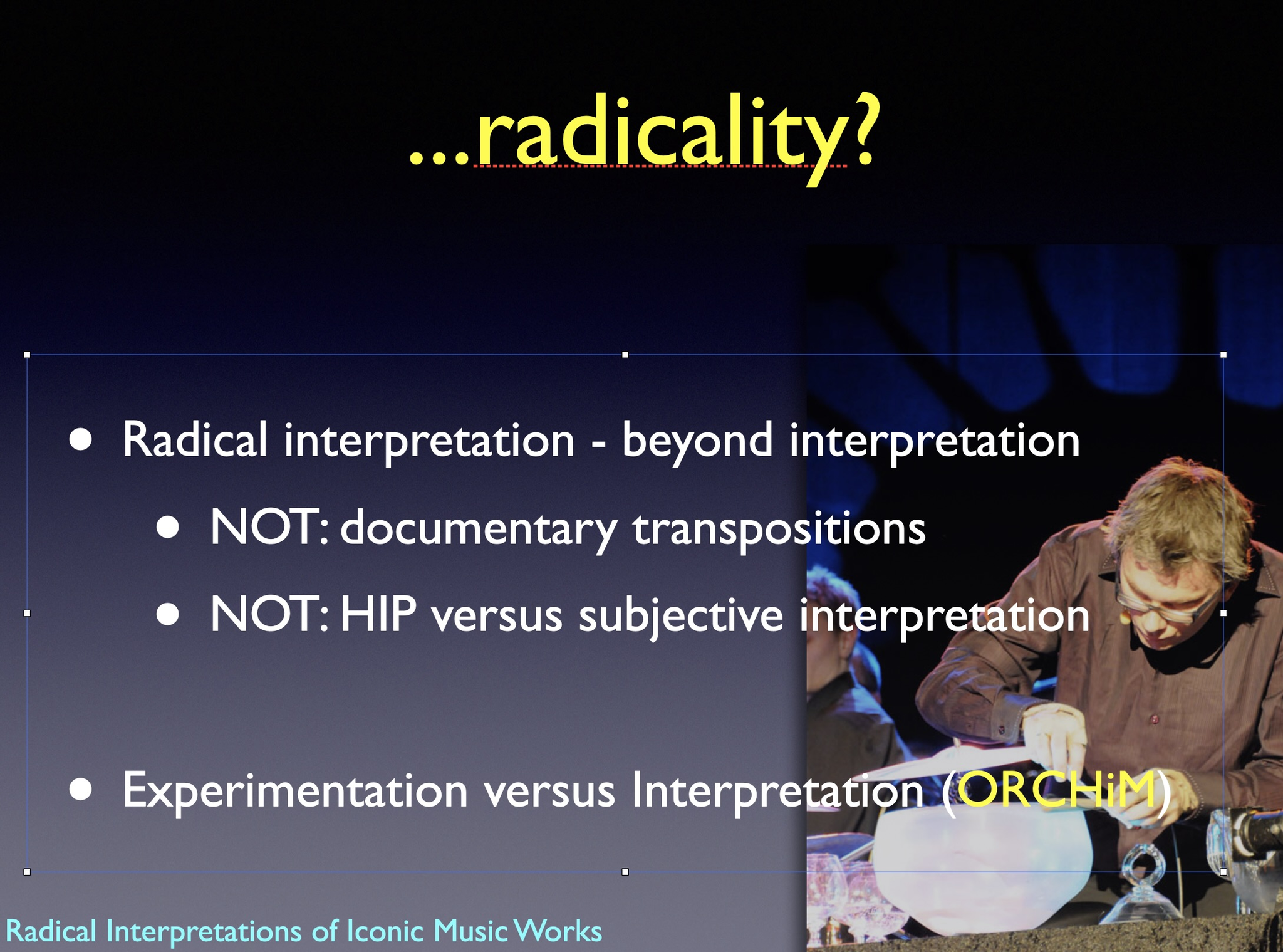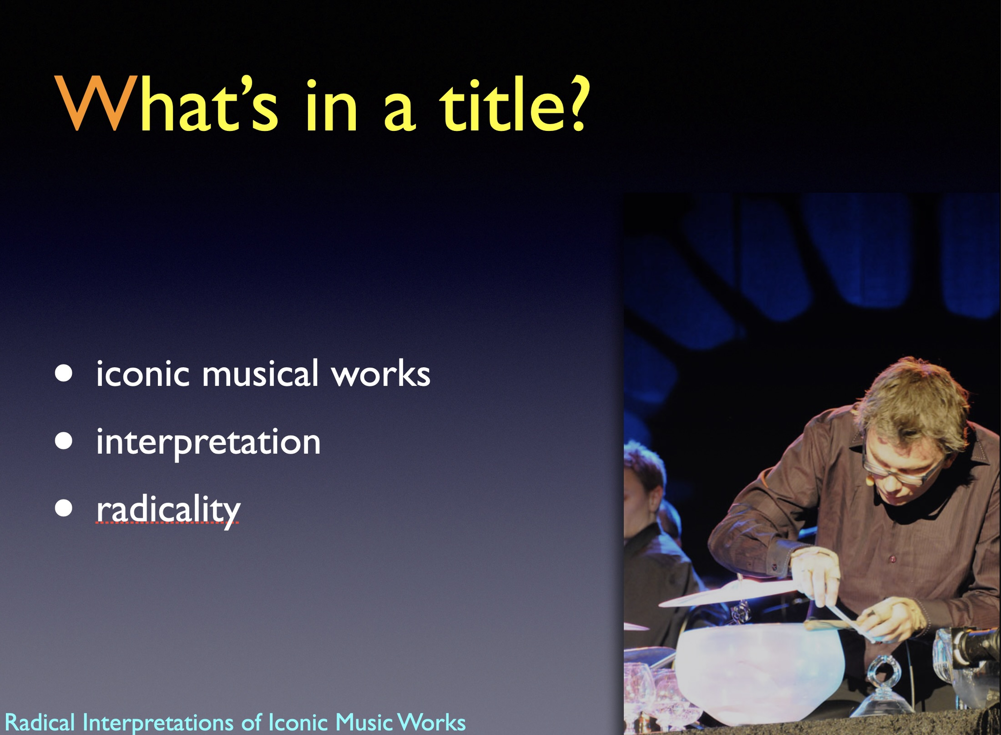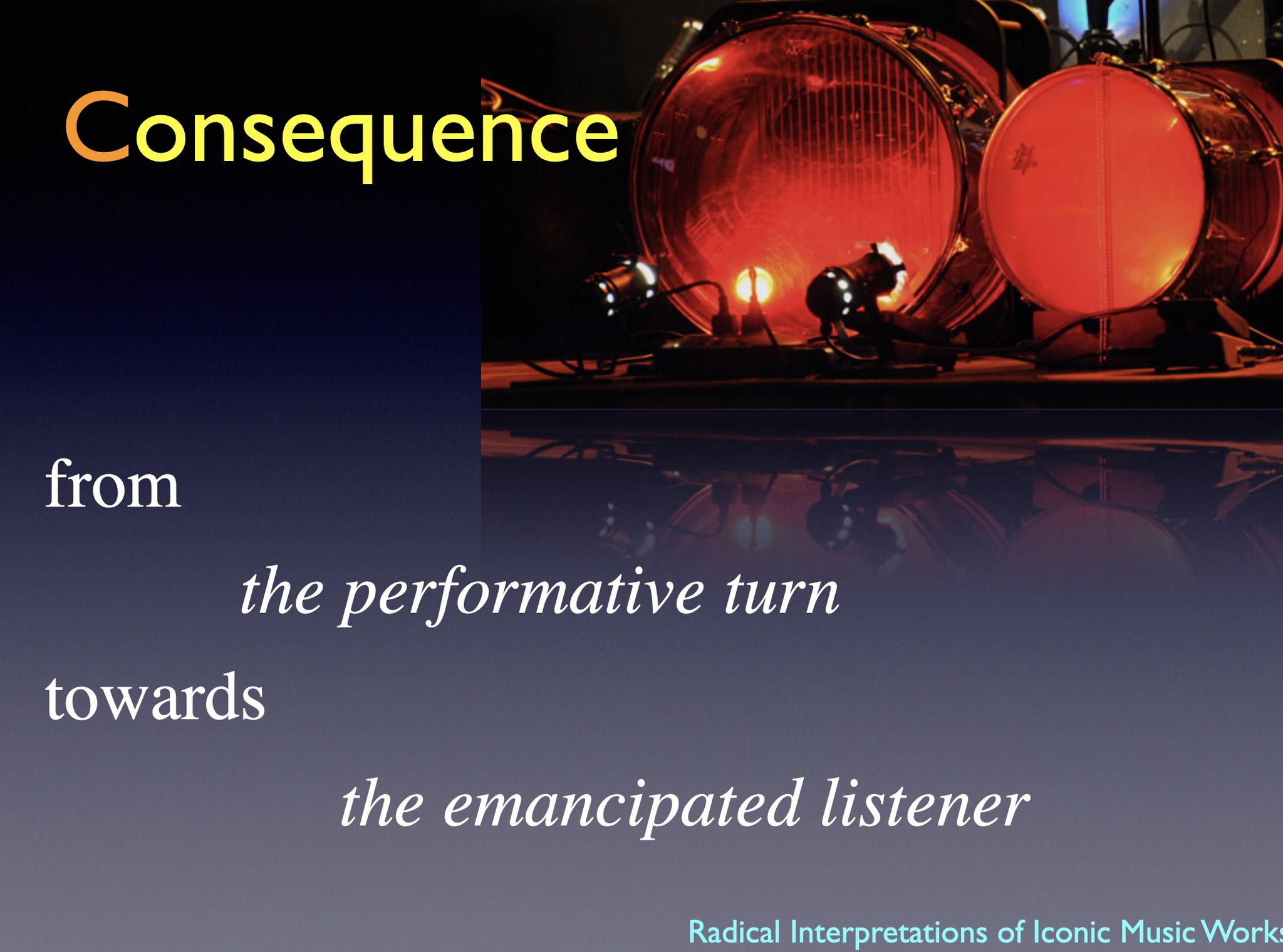 The artistic development project Radical Interpretations investigates two iconic works for solo percussion and re-composes these. The goal of the project was to develop new creative and transdisciplinary research in interpretation of musical works.