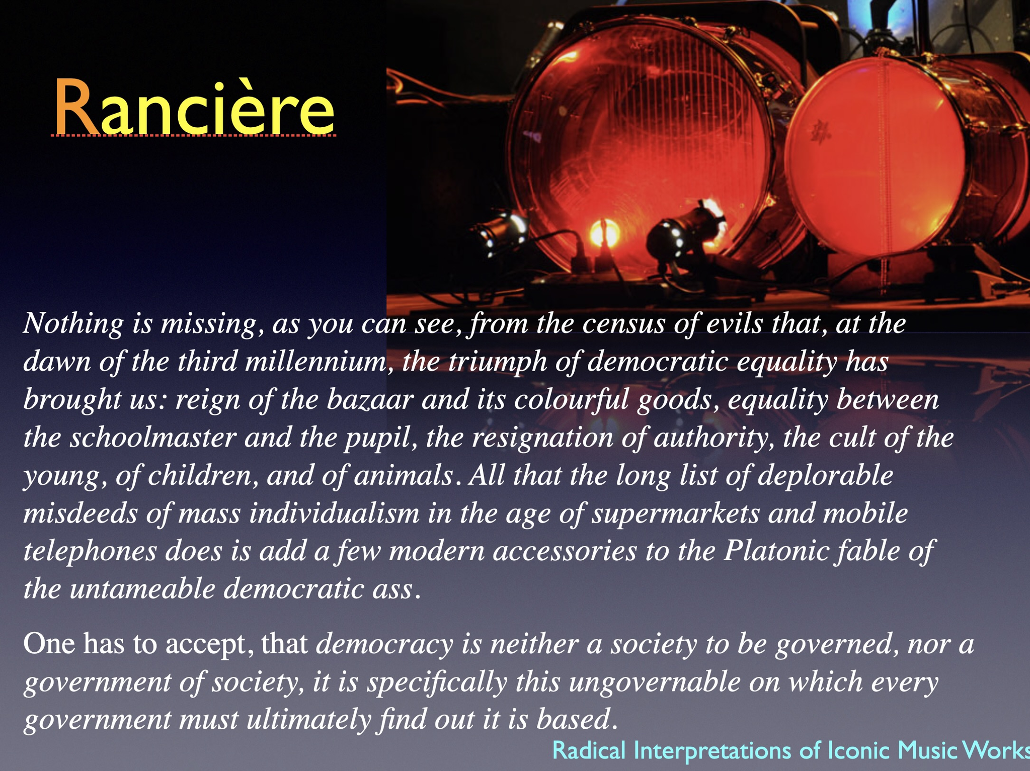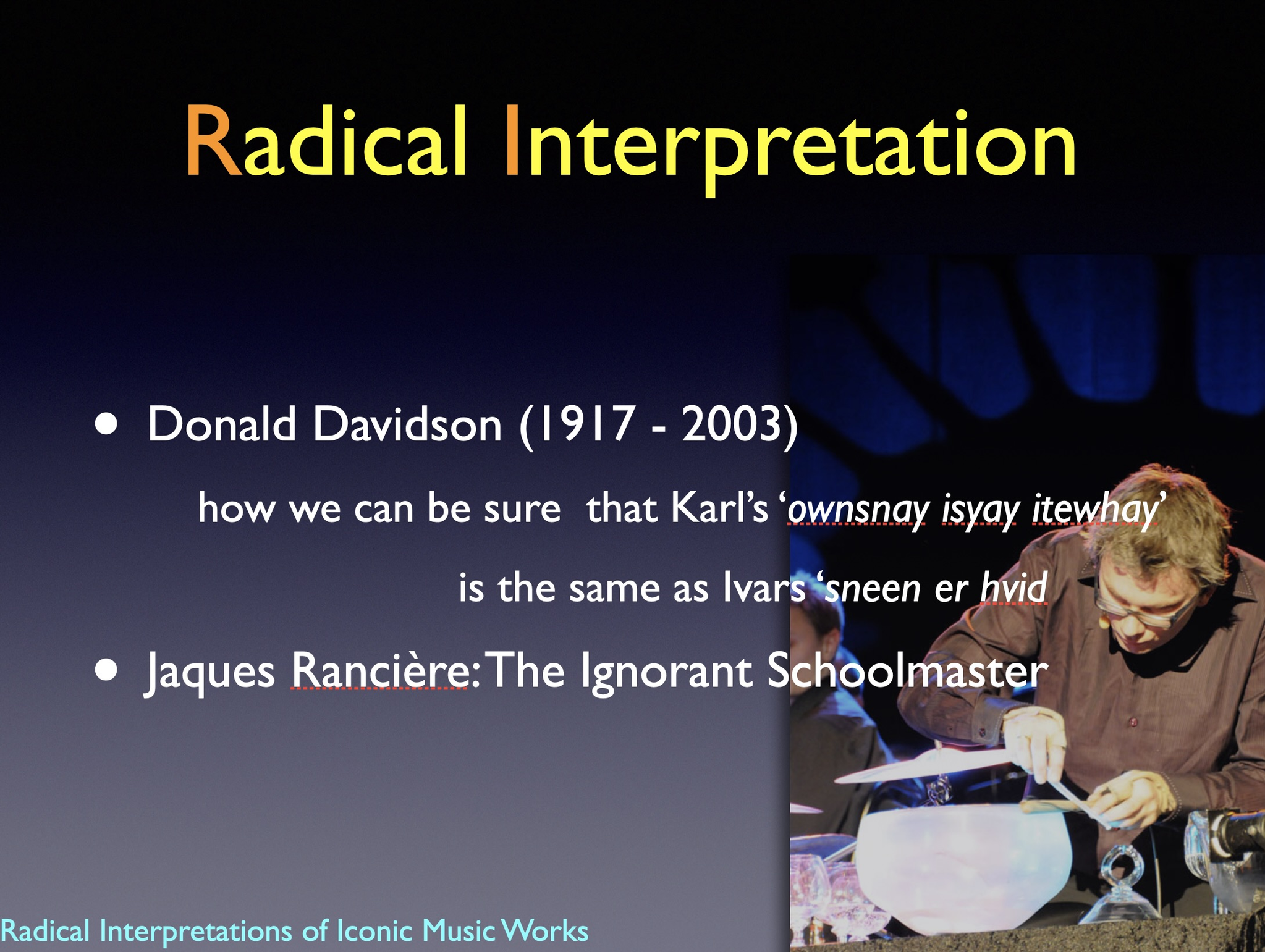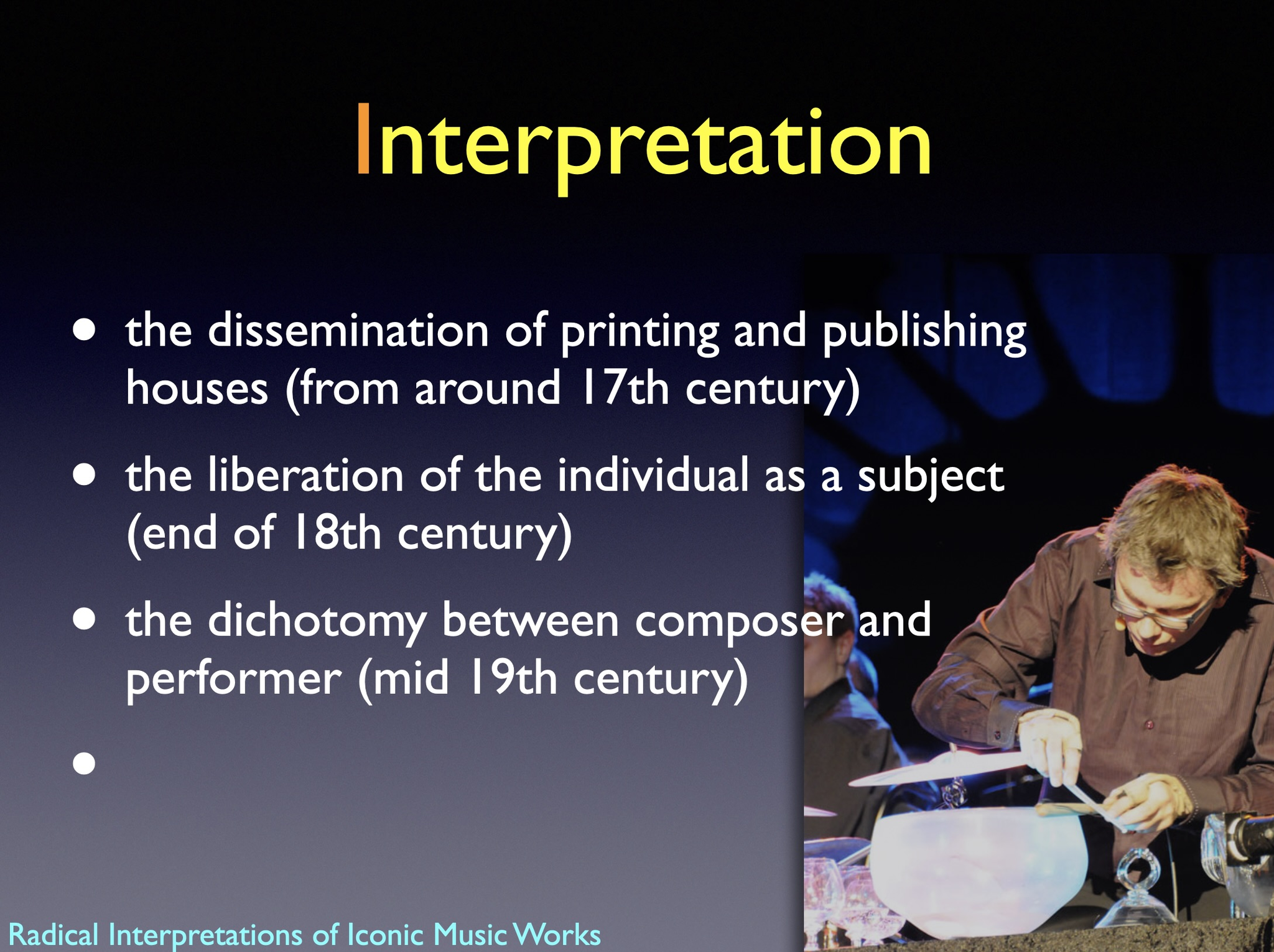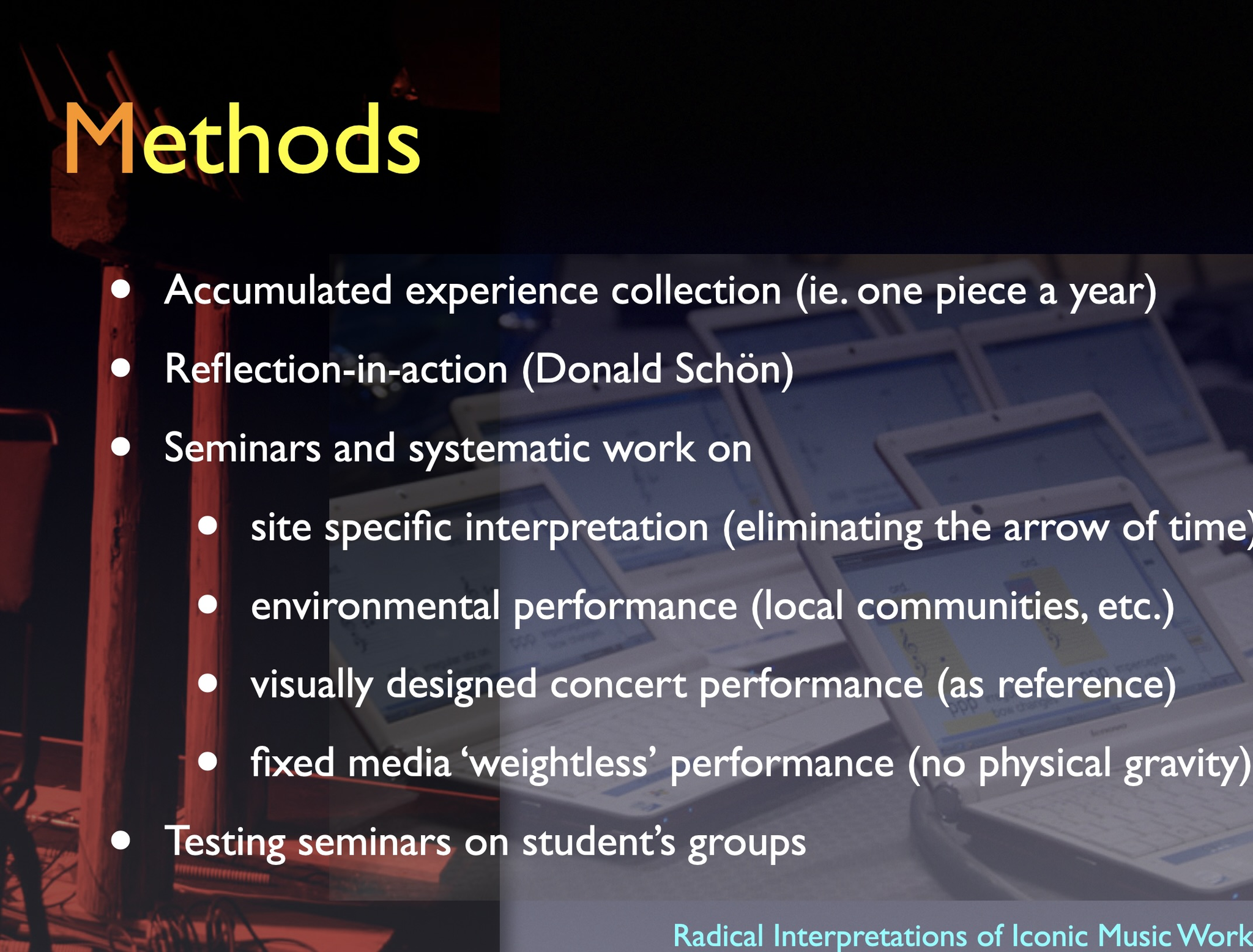 The artistic development project Radical Interpretations investigates two iconic works for solo percussion and re-composes these. The goal of the project was to develop new creative and transdisciplinary research in interpretation of musical works.