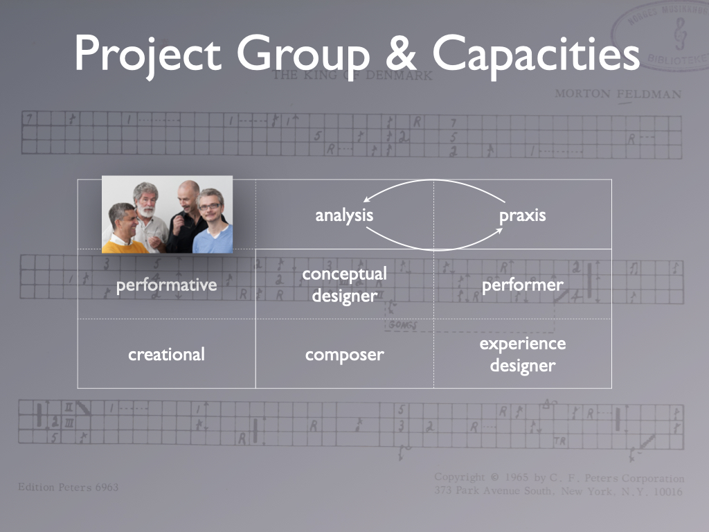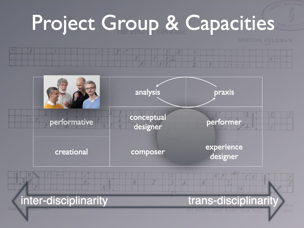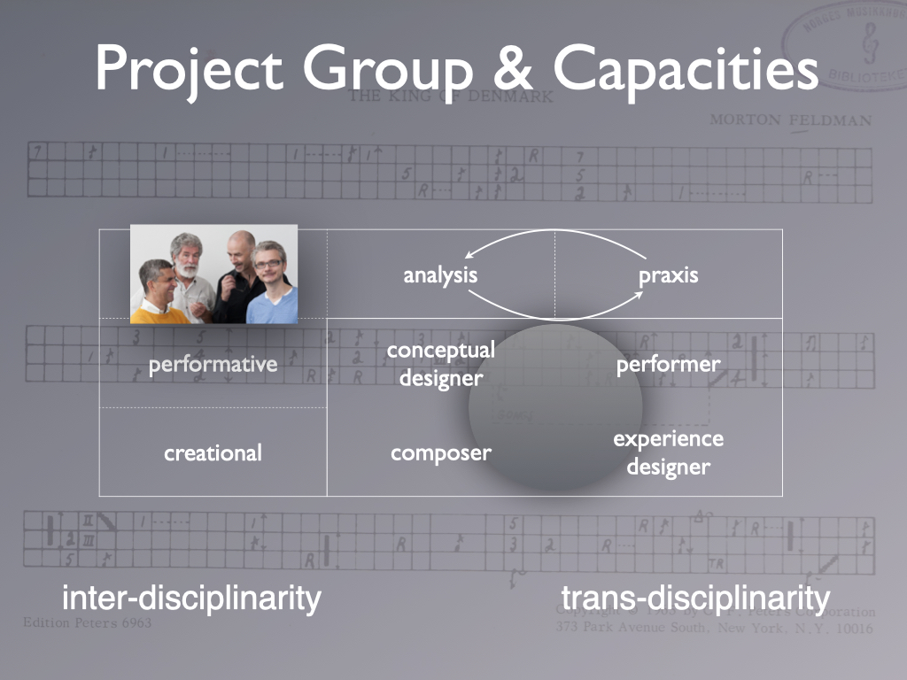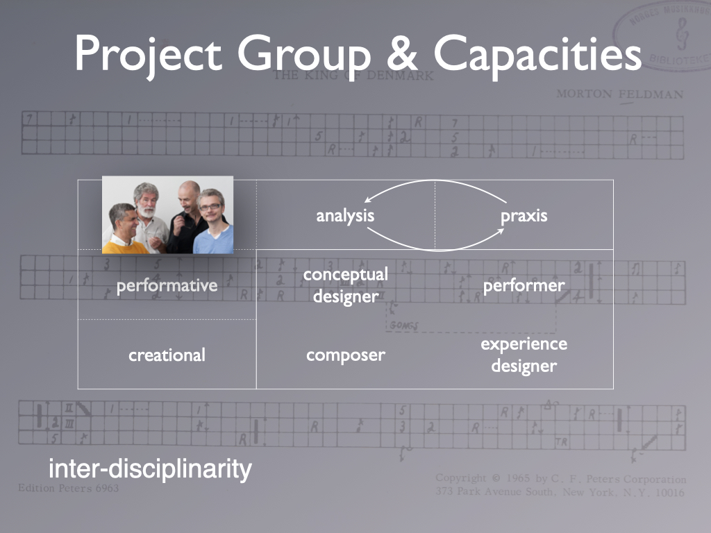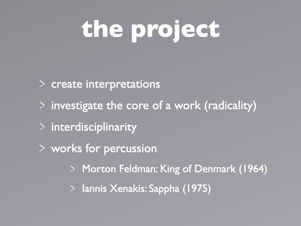 During the 3 years project, the team engaged with the music of Morton Feldman and Iannis Xenakis. The solo percussion pieces The King of Denmark and Psappha were the point of departure.
