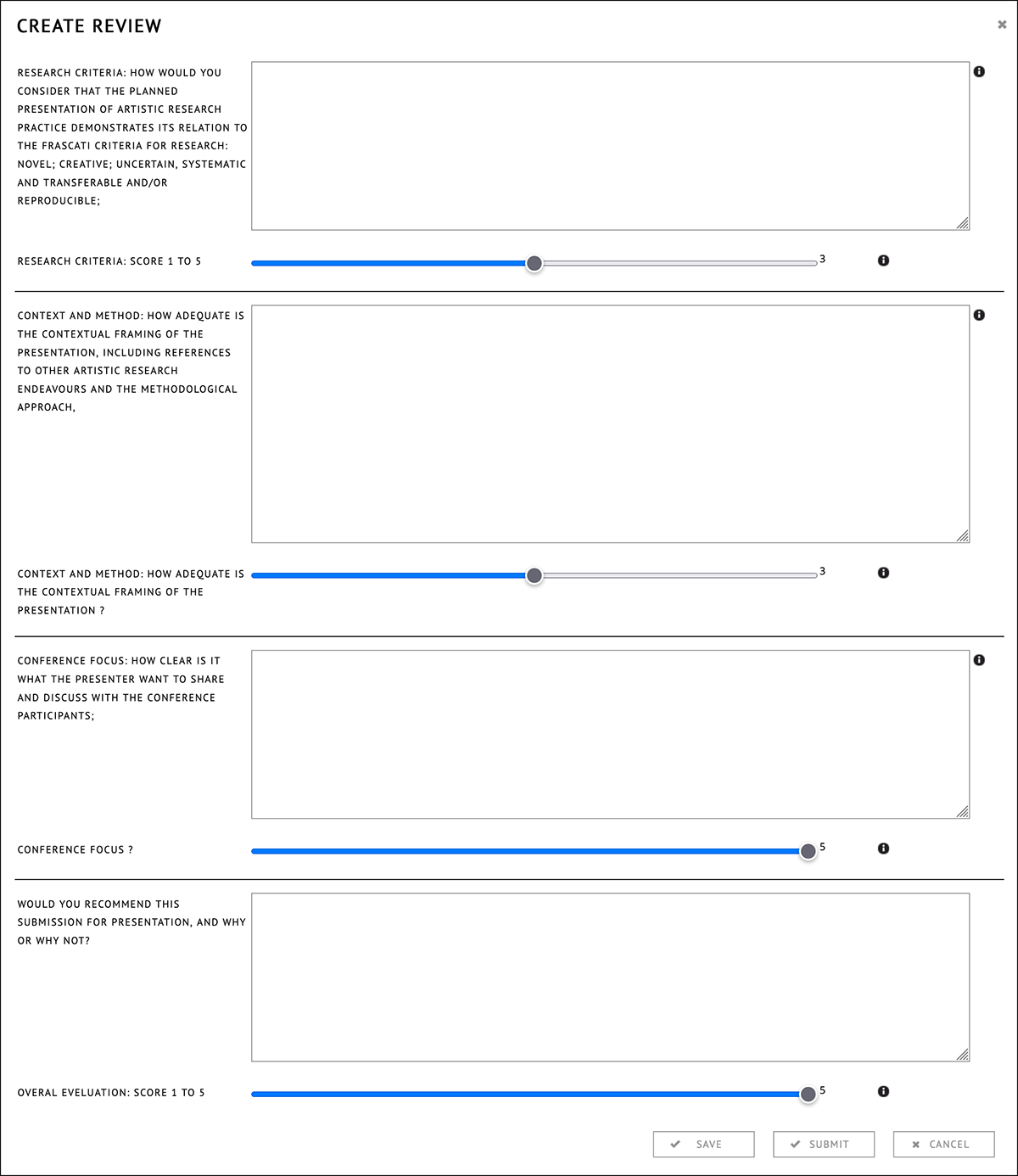 These questions are the basis of the form used to submit proposals –– in addition to the actual proposal that is supposed to be available in the form of an exposition in the Research Catalogue.