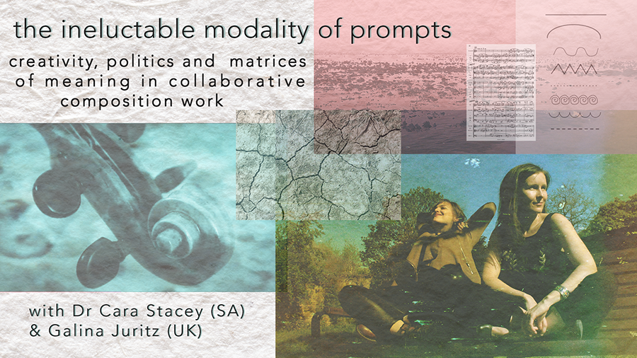Tracing back through two decades of collaboration, in this paper Cara in South Africa and Galina in the UK reflect on their expanding arsenal of prompt-based sound experiments, the metamorphosis of their understanding of collaborative composition and the meeting points of their current research and how they may be mutually illuminating. As their working relationship adapted to geographical distance, Cara and Galina’s collaborative musical process itself moved away from traditionally scored ABAB band song structures, to long-distance word-based prompts, to inviting others to resample live material in the spirit of overturning and reinterpreting their own creative associations. Today, working in both filmmaking and music, Galina and Cara endeavour to broaden and reorder the chain of events in the workflow of their respective practices, and in doing so embrace experimental systems and the ‘chronically undetermined’ (Rheinberger 2008:14´30˝) nature of epistemic things that come to light.