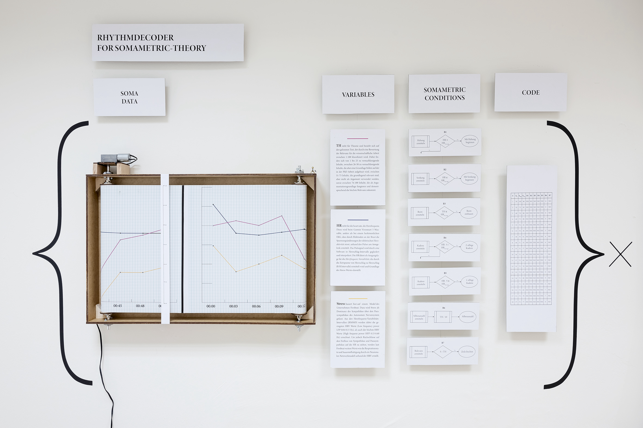 With the “Rhythmdecoder for Somametric-Theory”, using sensor supported wearable technology like the Muse Headband i.e., I do not only try to resonate to technological developments and discuss the concepts of emotion and affect inscribed in the programs, but also want to negotiate the functioning of computing machines and the underlying mathematical concepts within the framework of a critique of algorithmic rationality. Based on the wearable, which generates data on the mental and emotional state of the wearer, the question of the meaning and nature of emotion and, subsequently, of cognition unfolds, which is negotiated through a relational perspective as embodied and formed as such through constant exchange with the surrounding milieu, i.e. by constantly drawing new boundaries (enactivism). Through the artistic transfer of mathematical concepts of logic, set theory, stochastics and arithmetic, on which formal systems are based, apparatuses are developed and built on which the production of the artistic text is based. Apparatus building, data generating, and artistic writing are all part of a performative act.