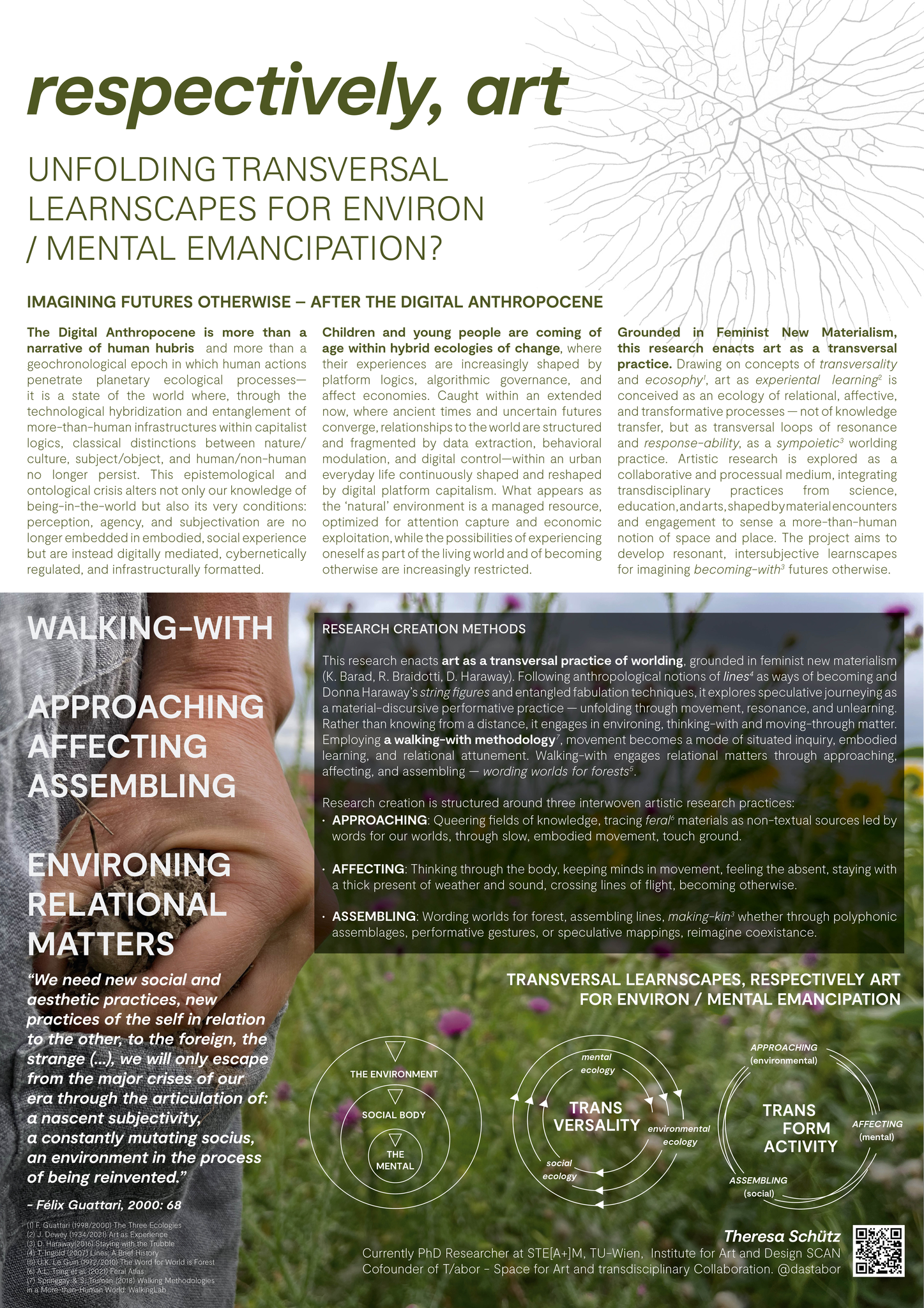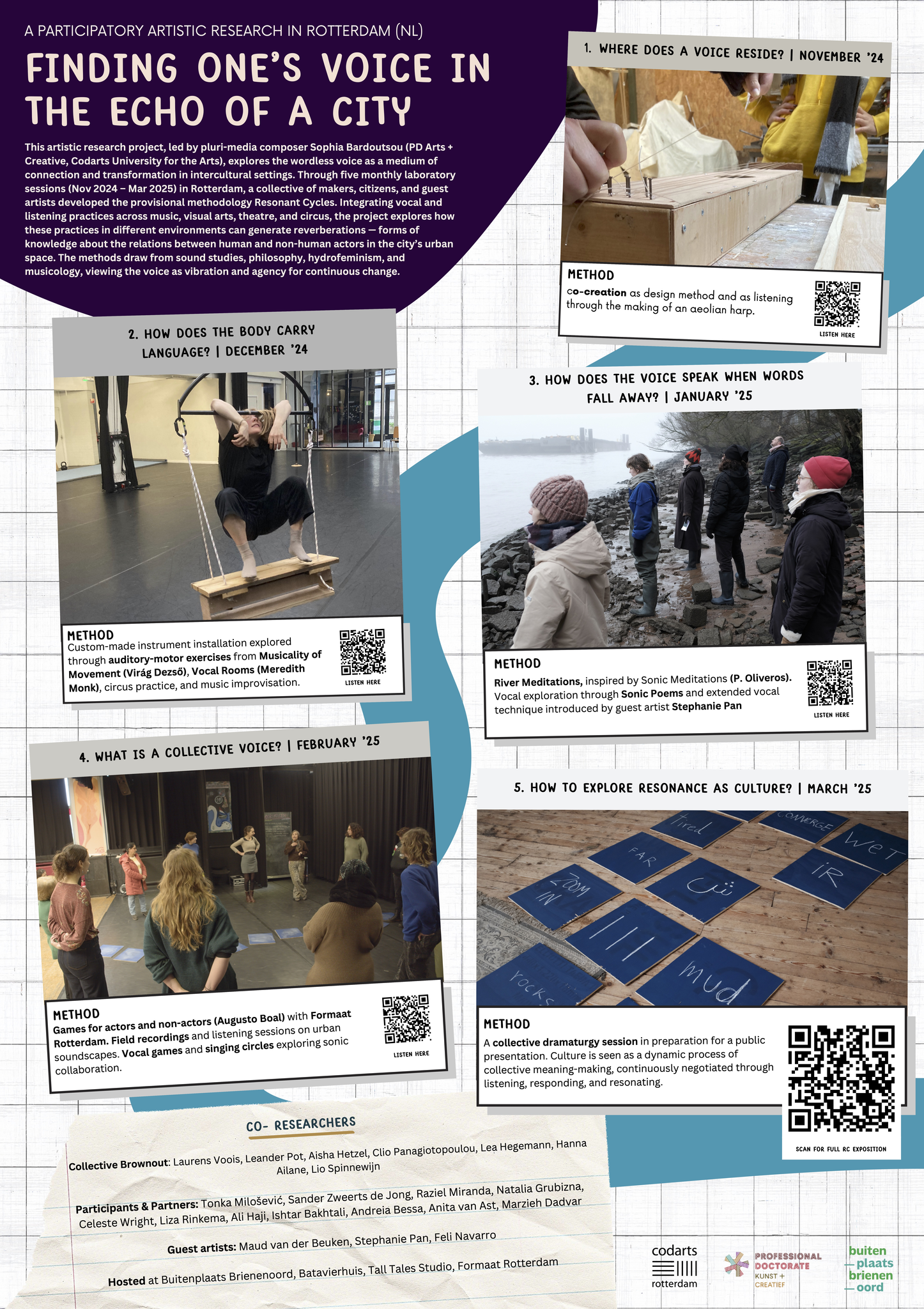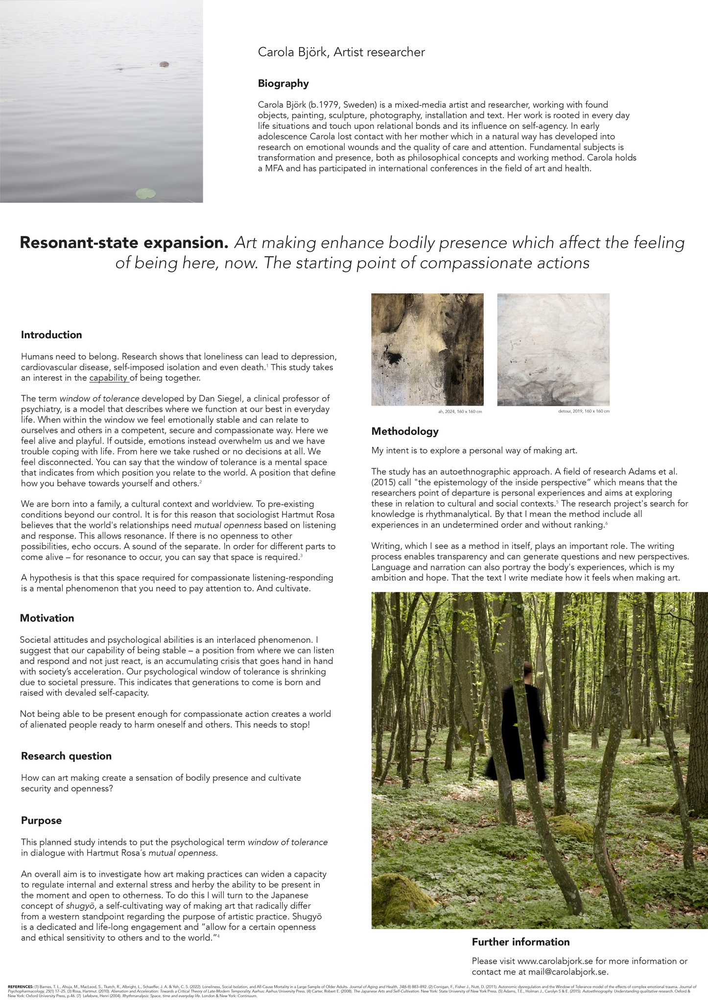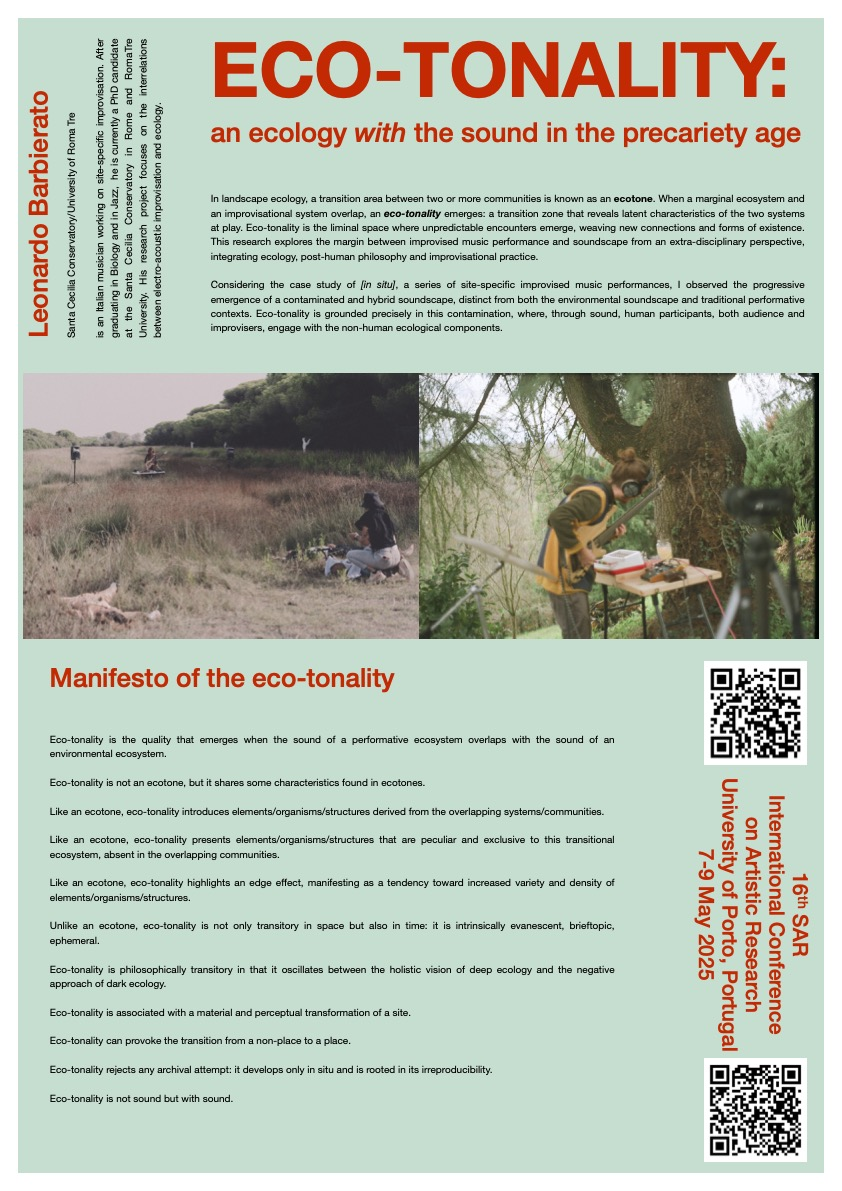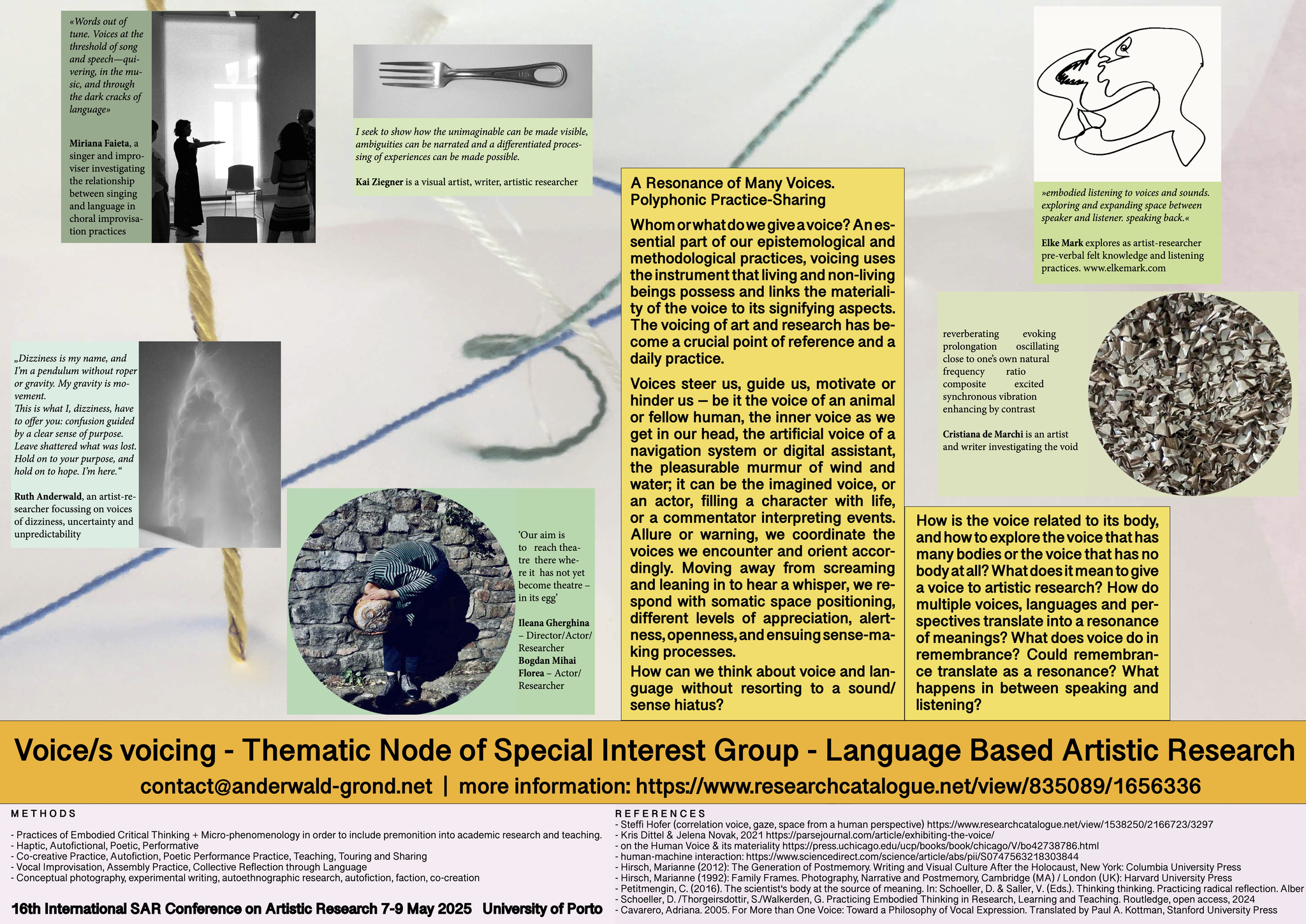 Resonance: The past decade witnessed the appearance of new debating spaces in artistic research. At a time when art and culture, local and global policies, and events are haunted by societal challenges as vast as they are unpredictable, what can artistic researchers offer in response to these concerns? How can artistic research resonate beyond its specific contexts and disciplinary borders? Resonance is a prompt to address the transformative nature of artistic research as a connective element that evokes a response and qualifies our experiences as meaningful. However, it can also be understood as a critical tool characterizedcharacterised by reciprocity and mutual transformation. Resonance is a response to personal and societal challenges both poetically and through modes of political imagination and transformative meeting spaces. Getting into resonance is to create a relation between artistic research and the world that requires questioning and answering, but also the ability to change and be changed.
