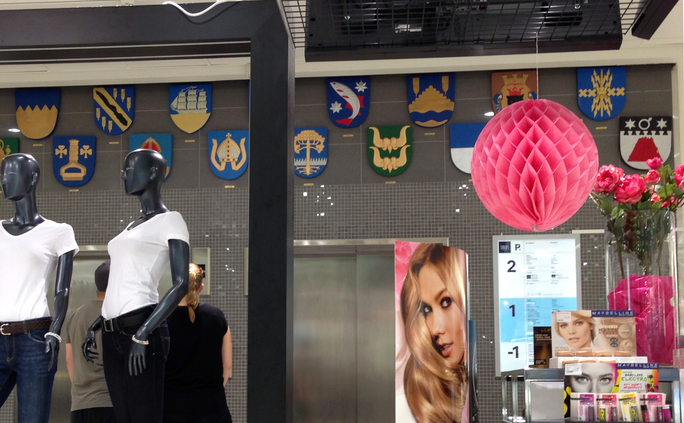 Starting point of the research intervention: Coats of arms of the province of Satakunta on a wall above the elevators at the cosmetics section of the 40 year old Sokos department store in Pori, Finland
