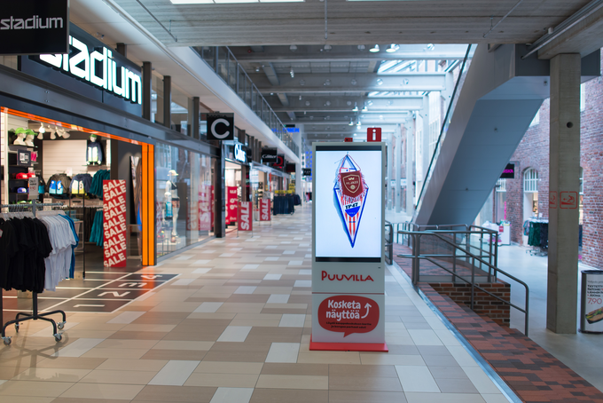 The location of my intervention was a new shopping mall in Pori, the Puuvilla shopping mall, newly opened at the end of 2014. There are lots of stores in the Puuvilla mall that sell sportswear and supplies for outdoor living. One highly visible thing in the mall is that it has four giant screens and numerous smaller, standing “totem” screens that display continuous moving image advertising.