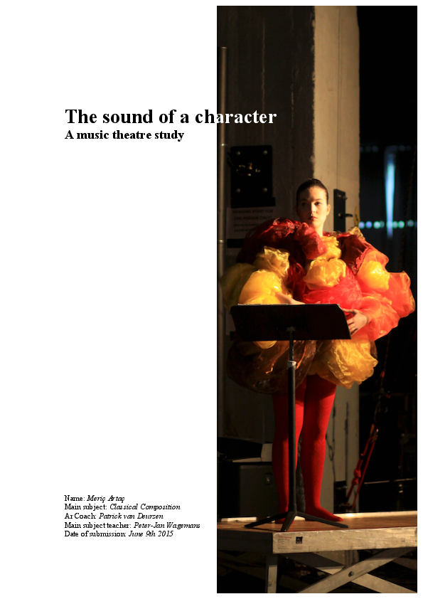 Art branches have nourished and affected each other for centuries. They formed common disciplines and evolved into new formats. Interdisciplinary relationships have offered the artist enrichment of artistic expressions. Music Theater is a concept that brings together music and theater disciplines, and during it’s history it evolved into different forms. Composers’ goal to merge their compositions with performing arts formed a basis for forms like Opera, Singspiel, Operetta and Musical. Argentinian composer Mauricio Kagel introduced the term “New Music theatre” for new forms of music theatre that are different than the before mentioned traditional forms. These musical genres, involve stories, various characters, and dramatic situations. For a composer who incorporates visual art, the score is most of the time related to the story and its characters. The composer who is also the stage director builds a bridge between two art forms and creates a world of sound in which she connects music and theater. The particular sound world of a visual aspect has changed through the centuries within art movements, and each composer presented to the audience their own adaptation of a story and the sound of their characters in different forms. This study explores a composer who incorporates visual art’ formed of music, and how this incorporation is staged. Unifying two strong art disciplines like theatre and music, the strength of this combination, and the idea that each theater character carries out a different color and sound increased my desire to improve myself in this field. I was introduced to this world which combines theatrical and musical elements during my Master studies, and It was my ambition to write the story of my pieces, develop the characters as well as the music.