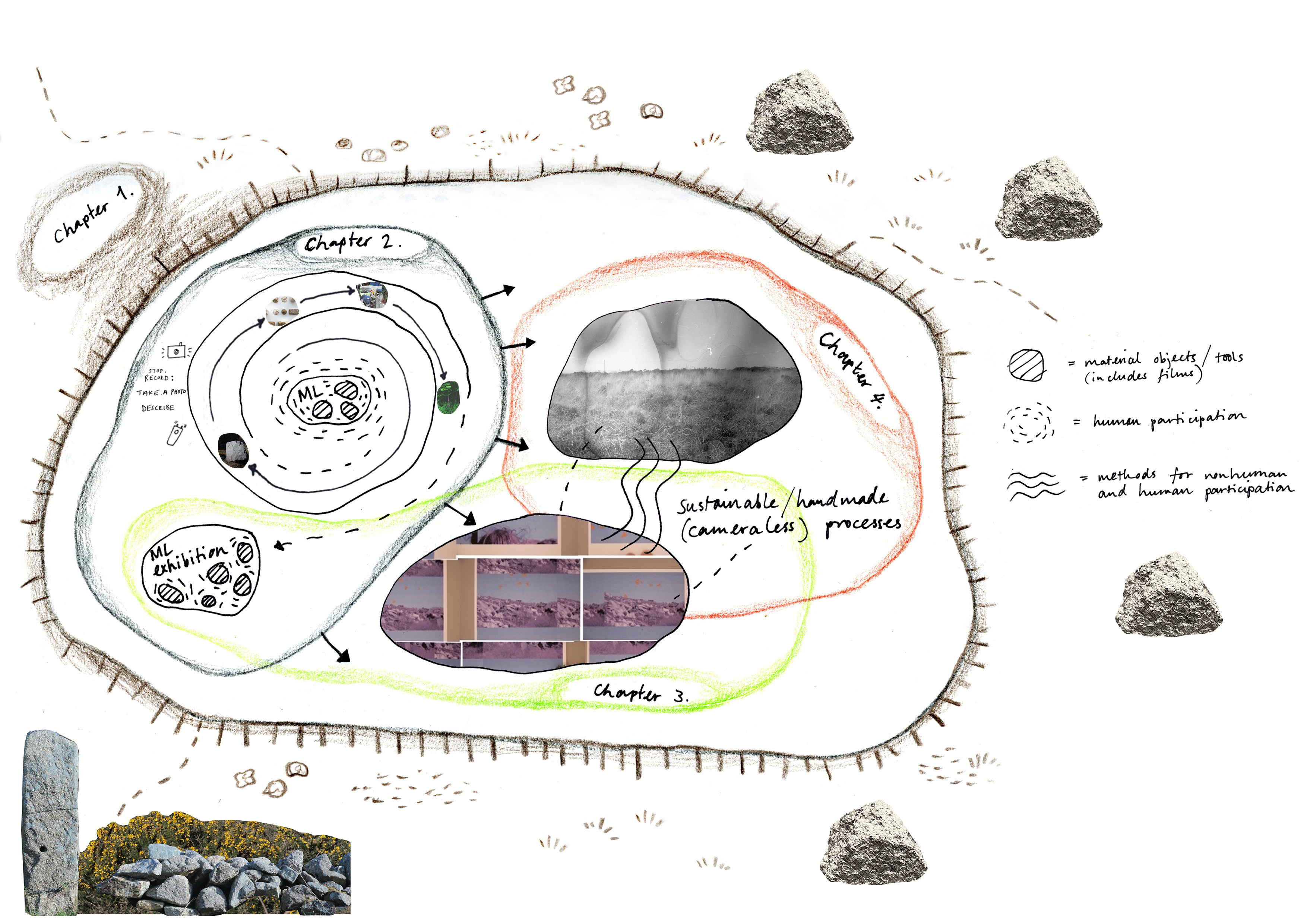 This doctoral research project applies experimental materialist filmmaking strategies to explore creative ways of working in landscapes with human and nonhuman participants. The research defines landscapes as multi-vocal gatherings of experiences and assemblages that interact in unfinished stories and therefore applies a ‘landscape-based approach’. Comprising filmmaking projects carried out during the PhD, the thesis demonstrates how embodied experimental and material methodologies that focus on process and participation can offer insights into filmmaking-as-research and the researcher-participant relationship. It illustrates how diagrams, handmade approaches and experimental techniques are dynamic methodological tools. An ongoing emergent research practice is communicated using still and moving images, diagrams, collage and writings, all undergone in the spirit of considering ways of being in landscapes, experimentation and curiosity.