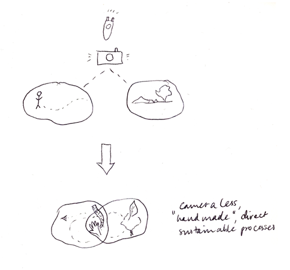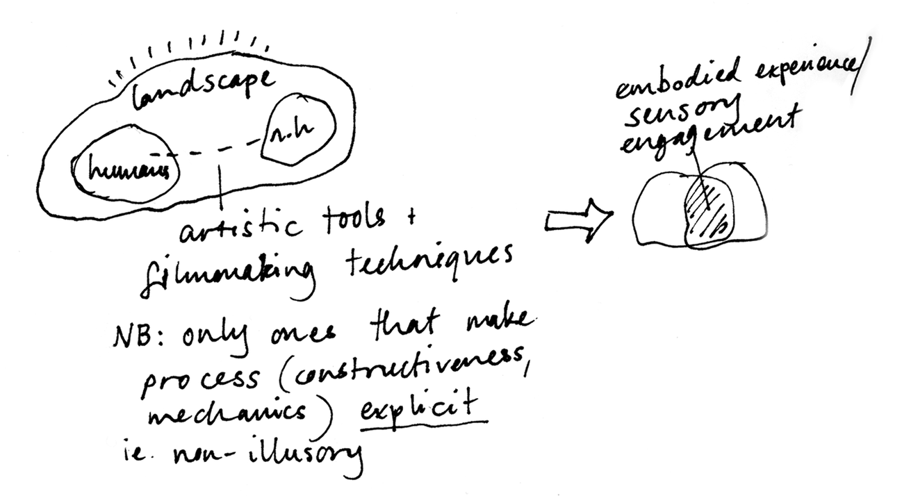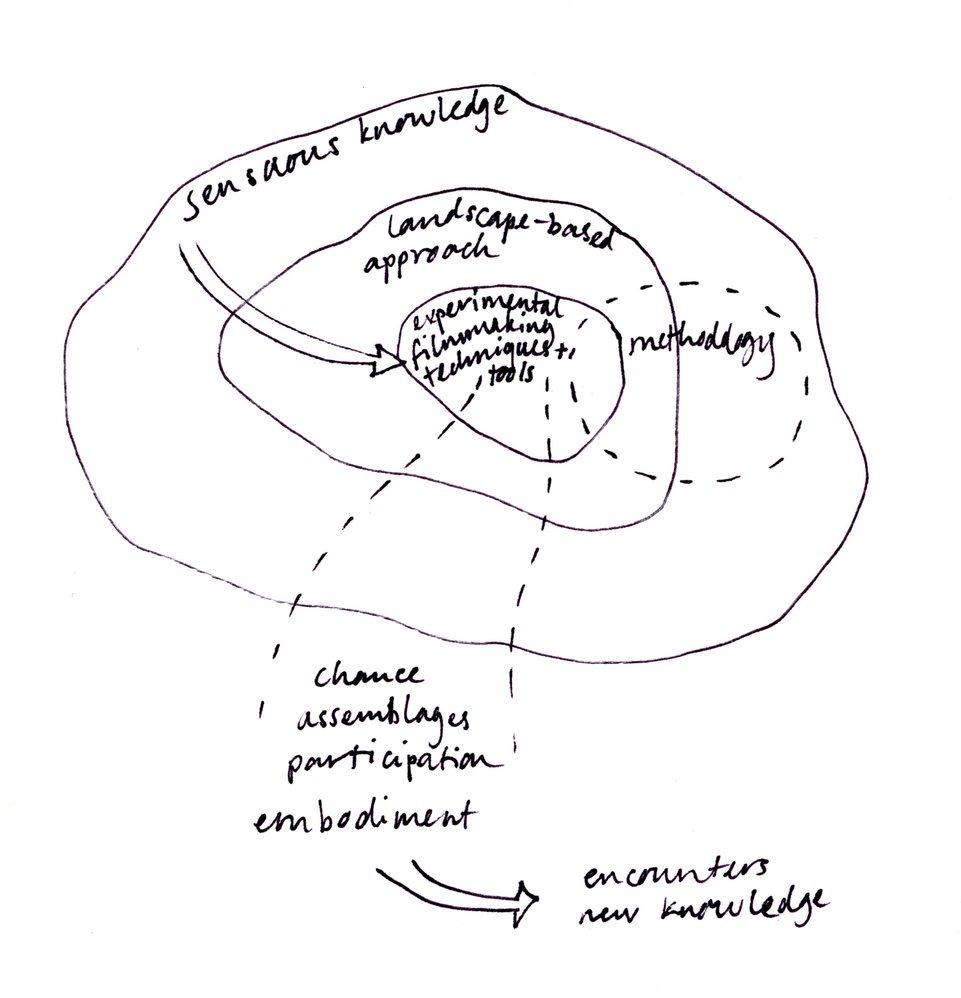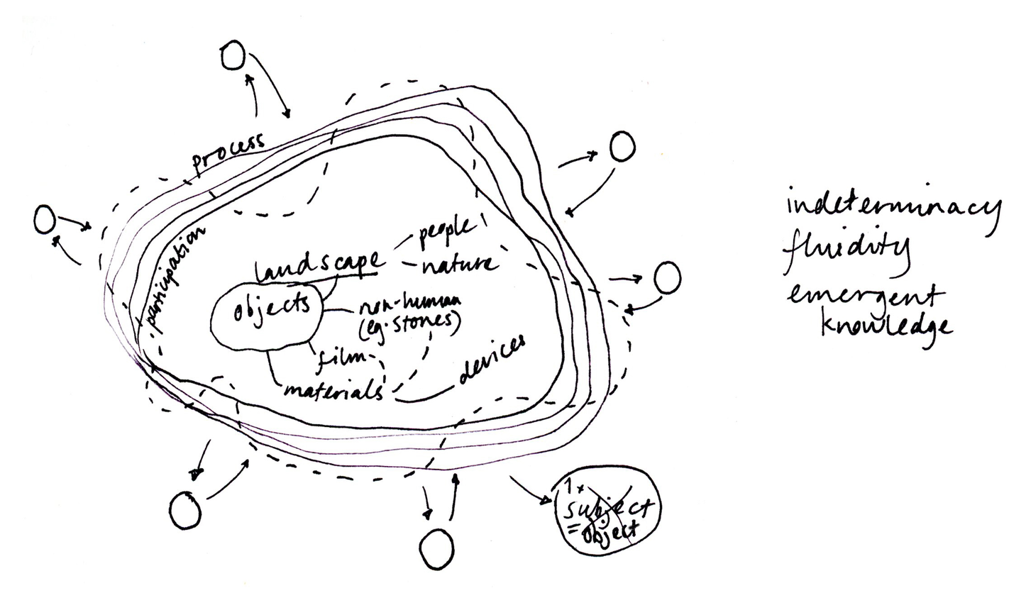 The idea that the focus on materials and artistic tools can remove structural bias and assert agency is central to my research practice. The folding in of process and material to encourage embodied sensuous knowing away from dominant human-centred understandings of the world is completely relevant to my own research concerns. However, where it differs in practice is that I am interested in opening up the experiential part of the filmmaking process to include other participant voices so that engagement happens while making and subsequent viewing.