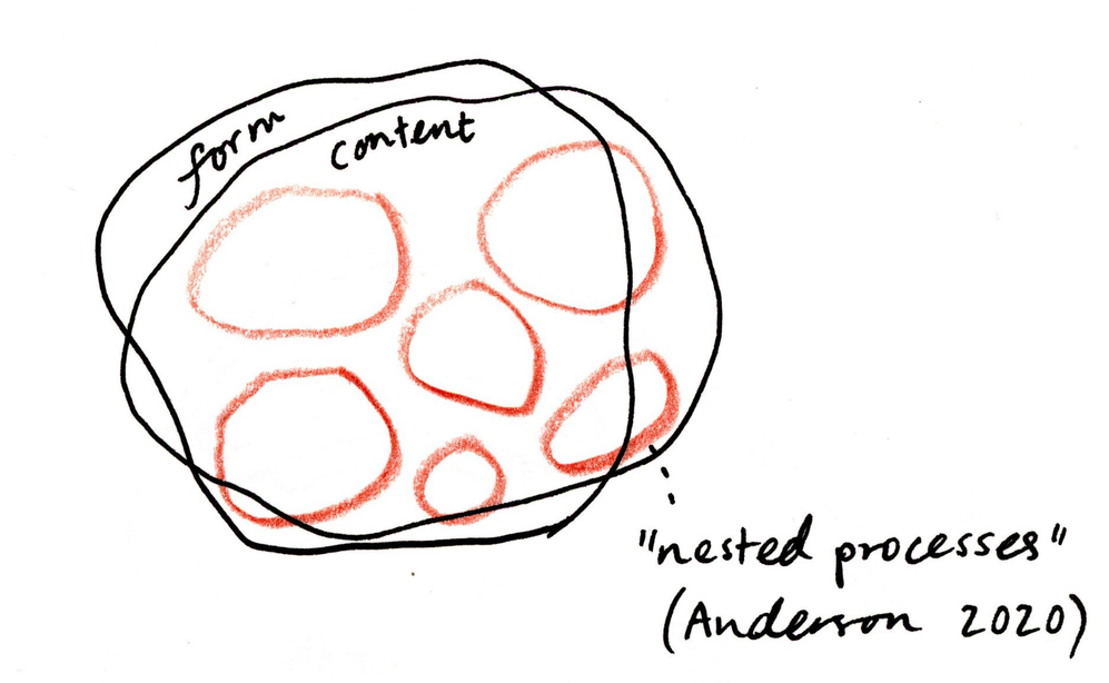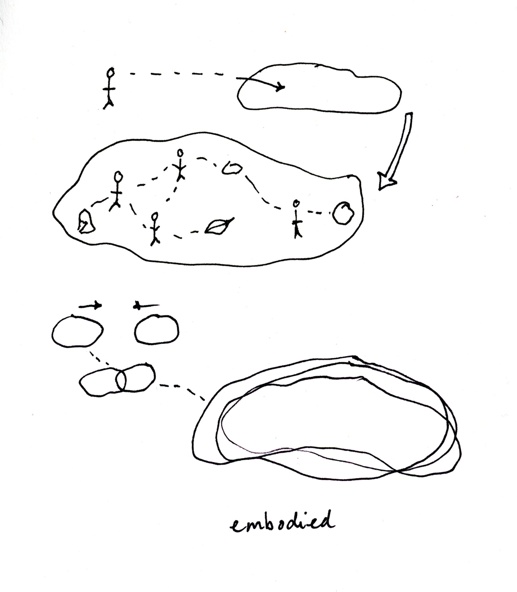 The diagram is an apt tool for embodying form and content as, rather than merely representing, it produces meaning and can aid communication beyond a single human-centred viewpoint. The diagram can describe an embodied landscape experience, interacting with other bodies. My embodied approach to knowing is expressed by amorphous shapes that can indicate shifting states and movement. They can be bodies (human / nonhuman), concepts or landscapes.