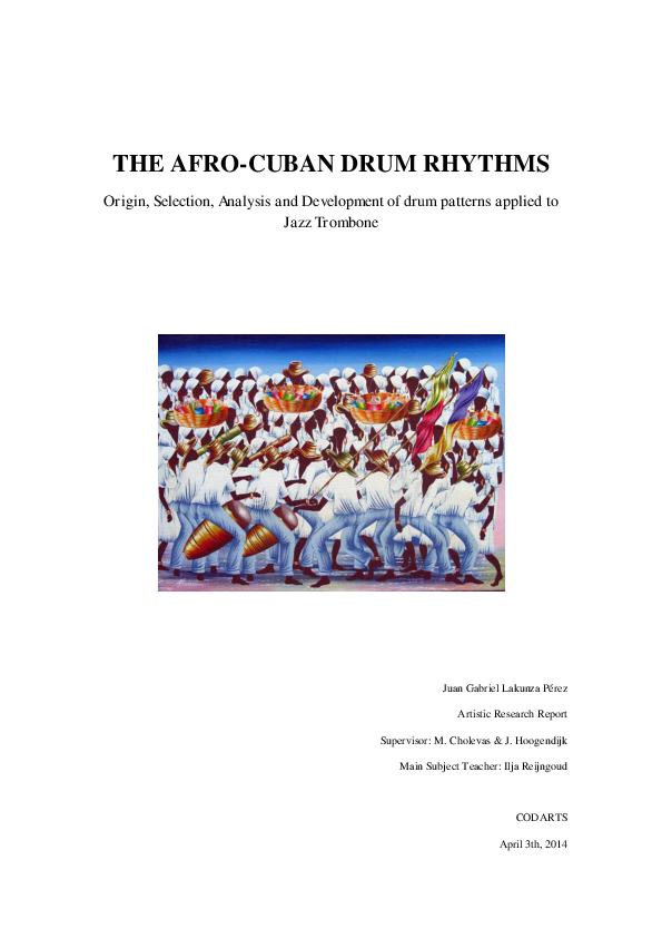 My intention with this Artistic Research was to learn more about the afro-Cuban rhythms that I consider one of the bases on which a lot of modern music is built. As a trombonist, I don´t consider myself only as a jazzman, sincerely I would like to be the most complete musician that I can. Of course, to study jazz gave me many tools for being more comfortable in other styles, but rhythmically, the Latin-American music has still a lot to say. The compilation of the information for the development of this research report, has allowed me to discover an exciting world to which I am truly attracted. Since I was a child I have been fascinated and captivated by the percussion. Music is magic, but if there is something more magical than the music itself , that is the sound of the drum. Since ancient times the drum has been a sacred element in many cultures. The present Western society, with its great technological development, is forgetting the basics of human spirituality. I sincerely believe that the drum will have an important role in the future, as a healing member of society. Every musician should be percussionist before playing his own instrument.