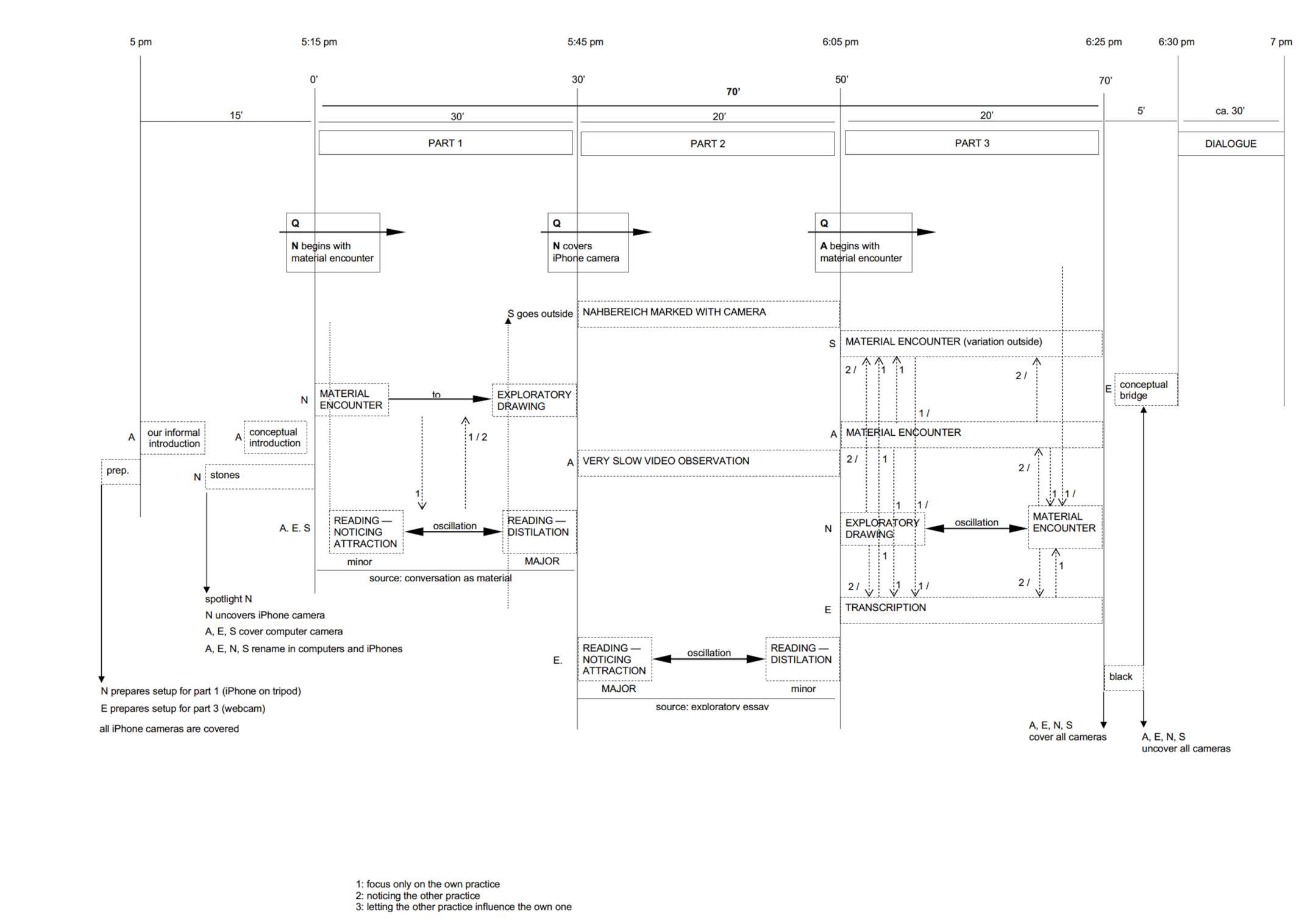 Two different attempts at or approaches towards diagramming the Ecology in Action that we activated during the Aesthetik und Erkenntnis (Aesthetics and Knowledge) conference hosted by Zurich University of the Arts (13 – 15 July 2021). At this stage in the evolution of our Ecologies in Action, we were still choreographing the transitions between practices and 'parts' of an Ecology through precise time cues. The recording of our Ecology in Action, along with our introduction and the following discussion can be encountered here.