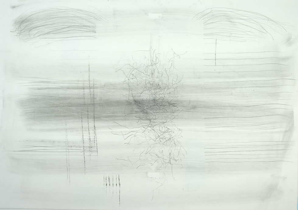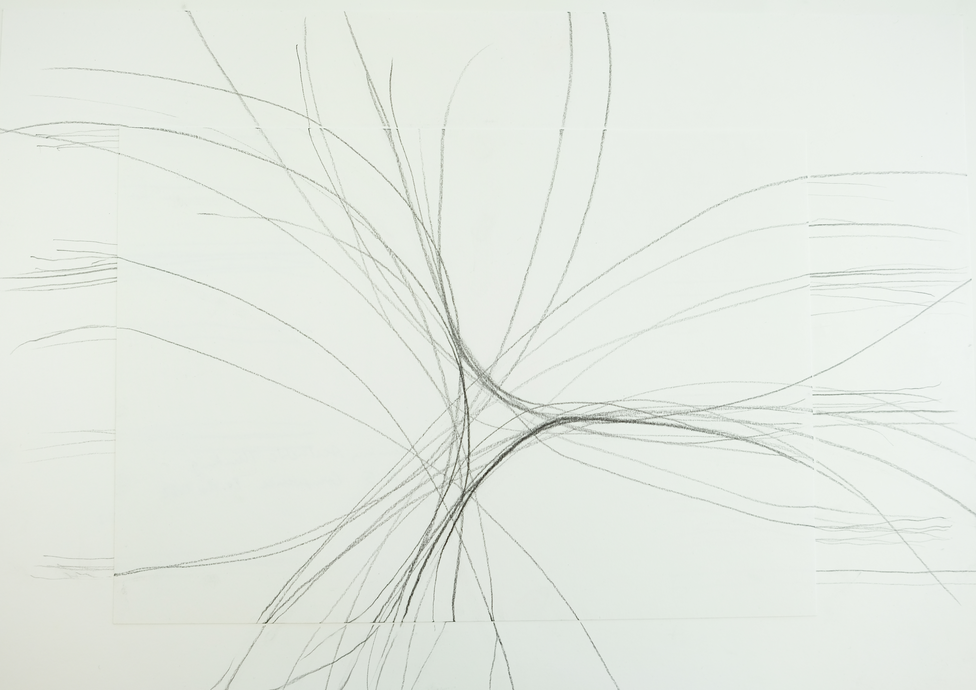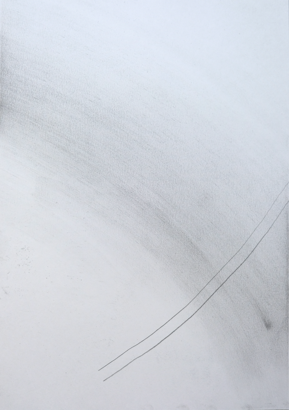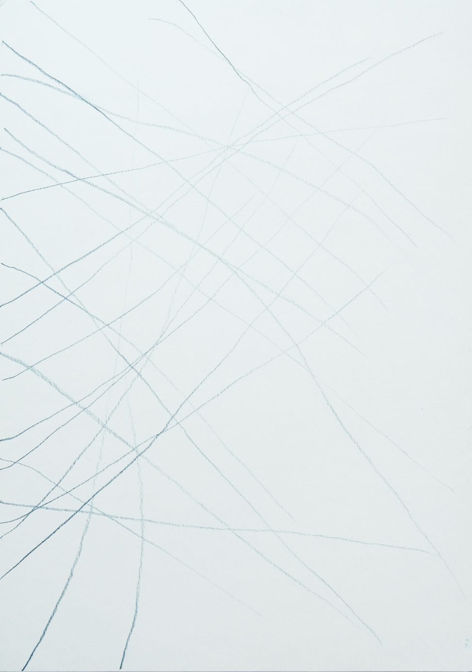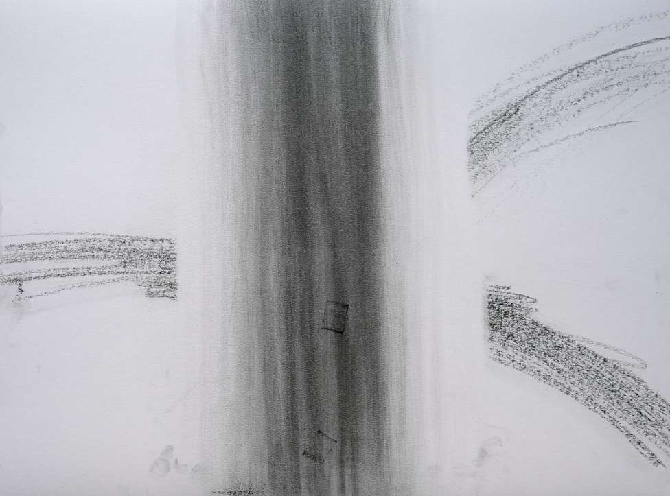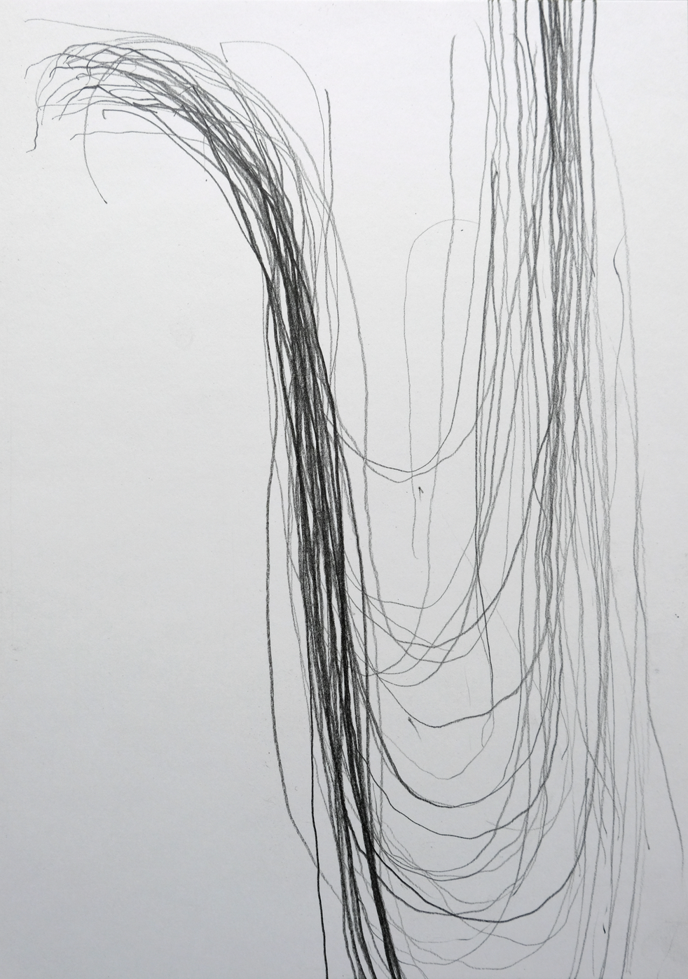 IV. Possible crystallisations of meaning. An extension of the non-verbal, expanding. No hurry. Not yet. Not yet. Inhaling, exhaling. Drawing into and drawing out. A remembered experience – there it has to develop. A decision in multiple touch, in touch with multiple surfaces. A sense of recognising. This play of momentums. Realising resonance. Sinking. Sensible boundaries, or rather changes in curvature. Constantly breathing in and out. Concurrency intervening, just appearing. Coming back to time, realising. Letting. Listening. Wondering, intermingling. This bleed of the present, opening and closing, constantly deciding. There is a call there. Drawing in and drawing out. Conditions changing, sensorially open. Edges sharpen, an indeterminate beyond. A line, a line shimmers and falls back. Airing. Trembling. Blurring. Pulsing. Wavering. Pressing. Pulsing. In touch, of surface, of line, of hand, of edge. Soft letting, leaning. Turning elsewhere. A liminal space between seeing and touching. These shifts in register, turning. Changes of angle, of perspective. A reorientation of the page. In the blankness, an opening. Invitation, for some intervention. Crystallisations of meaning, concurrency intervening. Concurrency as a way of proceeding. Trusting, trusting, following the trusting. Drop of expectation, to be surprised again. Changing, yet maintaining slowness. Sensorially open, this shifts of register and perspective. Deactivating the willing, a change in mode might feel necessary. Barely perceptible reorganisation of possibilities. A decision is revealed – yet not cut is made, to de-cision. Fluid, disappearing. The space between sense and the coming to be of sense. Landscapes, edges, curvatures of sense. To stop and observe these edges, shifting. Shifts, observing, not focusing on anything else. Expansion. Blur of form expanding. Trembling. Disorientation, reorientation, reimagining. Reconnection of the lines, breaking. Expanding. A closer connection. Reconnection. The touch of unexpected line or edge. Testing. Nearness. Wavering line, occluding. Revealing, unveiling. Touching, meeting. Departing. Edging. Edging towards. Edging away from. Moving into. Into stillness, a slowness. Disappearance. How to wait for the other? Not about. Disappearing. Seeing. Transfer the focus, the impulse. A small blank space. Extension of the non-verbal, expanding. It has to develop. Letting. Observing. A quality of in-between-ness. Letting as a different kind of decision unfolding, oscillating, not forcing. This sense of movement, this happening.
