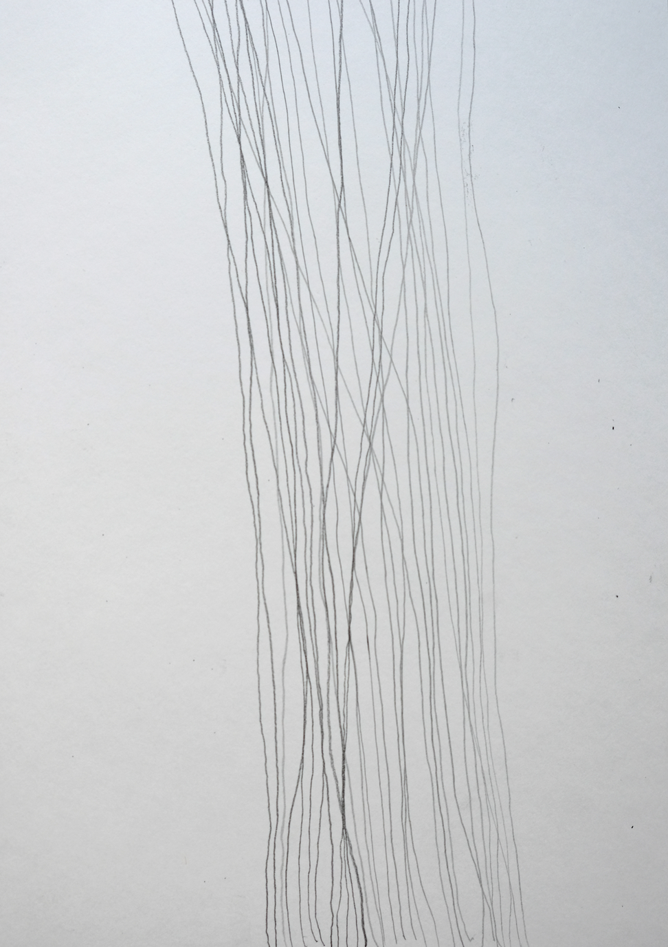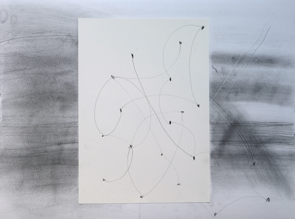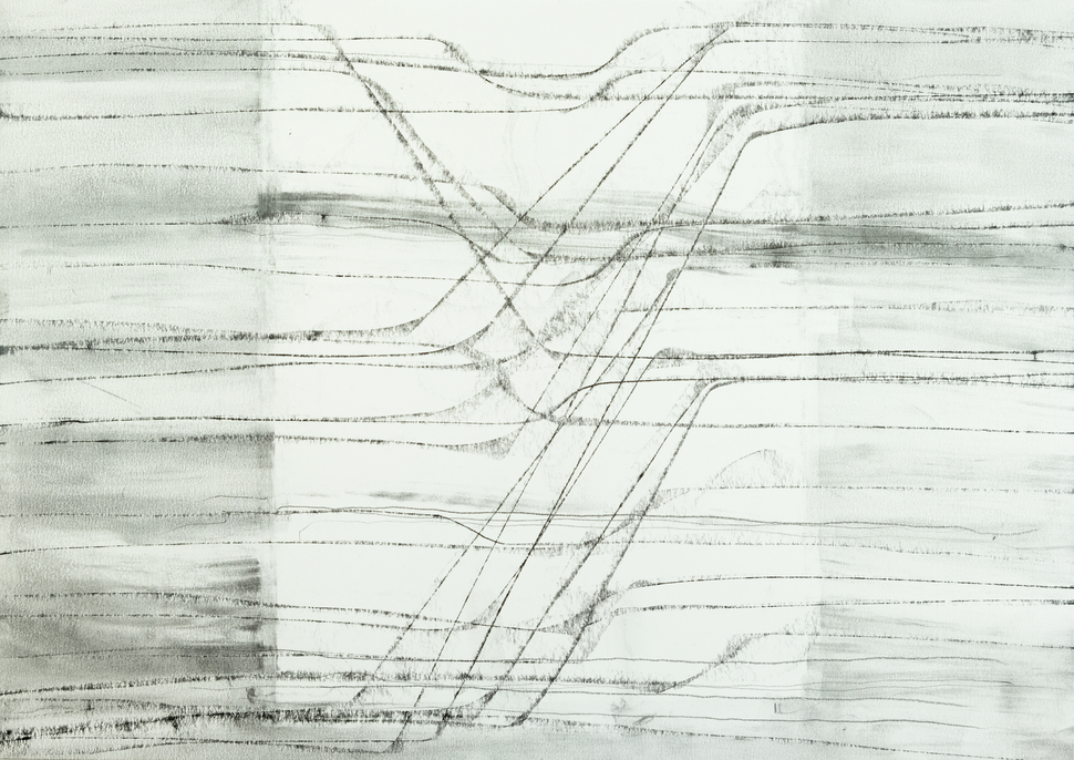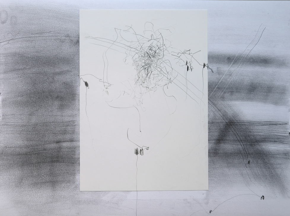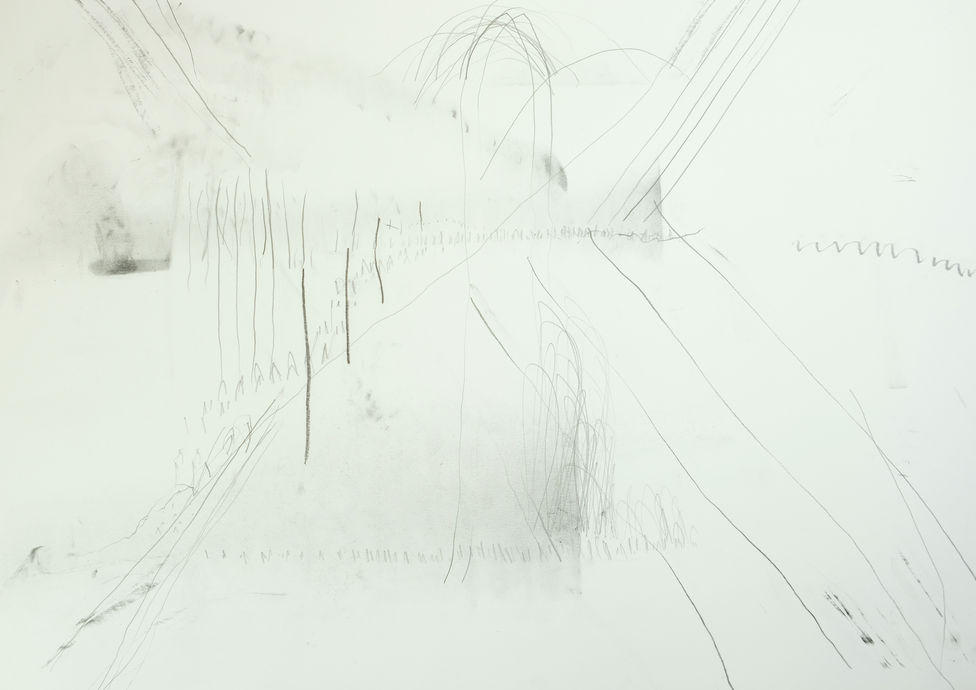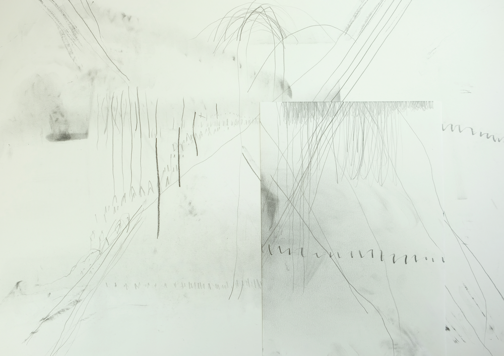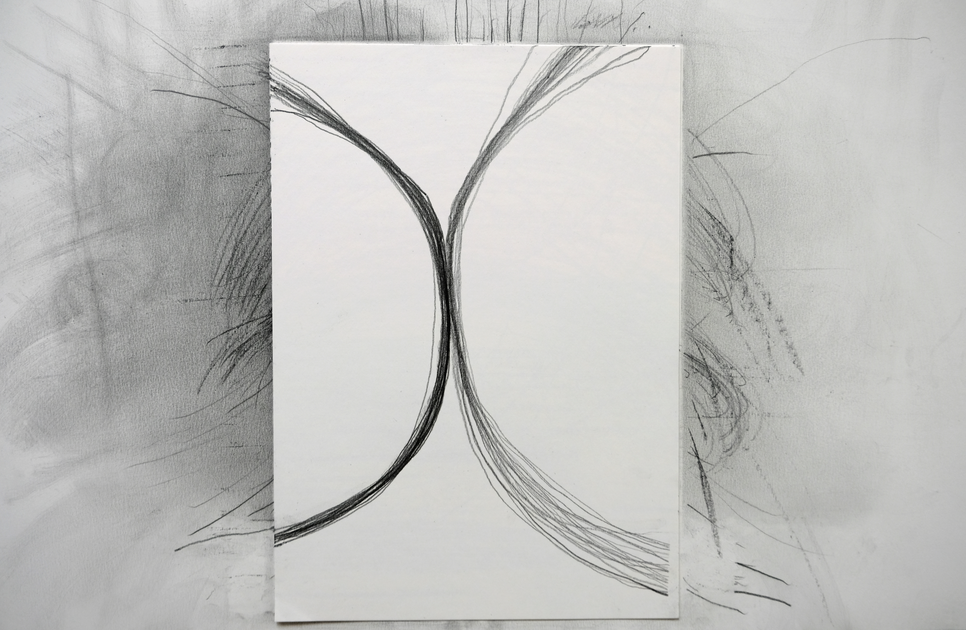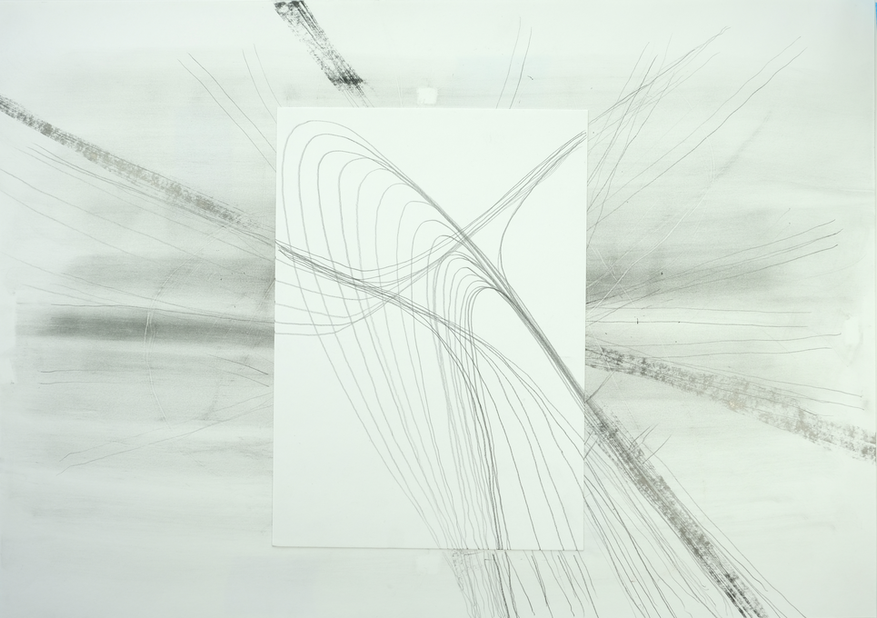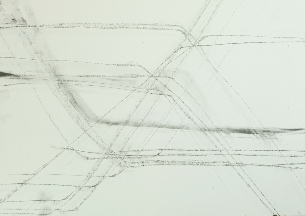 IV. Possible crystallisations of meaning. An extension of the non-verbal, expanding. No hurry. Not yet. Not yet. Inhaling, exhaling. Drawing into and drawing out. A remembered experience – there it has to develop. A decision in multiple touch, in touch with multiple surfaces. A sense of recognising. This play of momentums. Realising resonance. Sinking. Sensible boundaries, or rather changes in curvature. Constantly breathing in and out. Concurrency intervening, just appearing. Coming back to time, realising. Letting. Listening. Wondering, intermingling. This bleed of the present, opening and closing, constantly deciding. There is a call there. Drawing in and drawing out. Conditions changing, sensorially open. Edges sharpen, an indeterminate beyond. A line, a line shimmers and falls back. Airing. Trembling. Blurring. Pulsing. Wavering. Pressing. Pulsing. In touch, of surface, of line, of hand, of edge. Soft letting, leaning. Turning elsewhere. A liminal space between seeing and touching. These shifts in register, turning. Changes of angle, of perspective. A reorientation of the page. In the blankness, an opening. Invitation, for some intervention. Crystallisations of meaning, concurrency intervening. Concurrency as a way of proceeding. Trusting, trusting, following the trusting. Drop of expectation, to be surprised again. Changing, yet maintaining slowness. Sensorially open, this shifts of register and perspective. Deactivating the willing, a change in mode might feel necessary. Barely perceptible reorganisation of possibilities. A decision is revealed – yet not cut is made, to de-cision. Fluid, disappearing. The space between sense and the coming to be of sense. Landscapes, edges, curvatures of sense. To stop and observe these edges, shifting. Shifts, observing, not focusing on anything else. Expansion. Blur of form expanding. Trembling. Disorientation, reorientation, reimagining. Reconnection of the lines, breaking. Expanding. A closer connection. Reconnection. The touch of unexpected line or edge. Testing. Nearness. Wavering line, occluding. Revealing, unveiling. Touching, meeting. Departing. Edging. Edging towards. Edging away from. Moving into. Into stillness, a slowness. Disappearance. How to wait for the other? Not about. Disappearing. Seeing. Transfer the focus, the impulse. A small blank space. Extension of the non-verbal, expanding. It has to develop. Letting. Observing. A quality of in-between-ness. Letting as a different kind of decision unfolding, oscillating, not forcing. This sense of movement, this happening.
