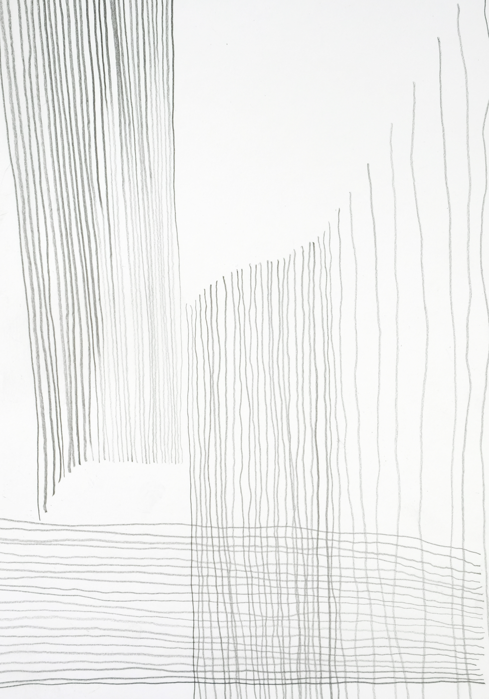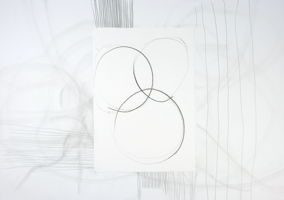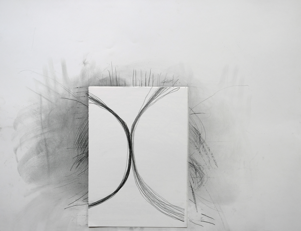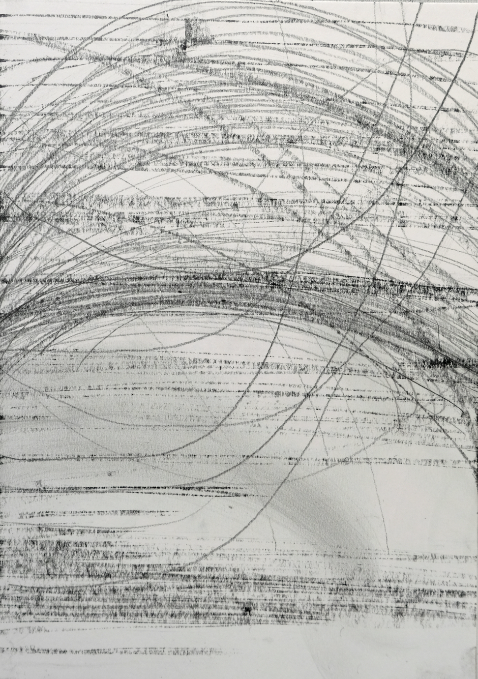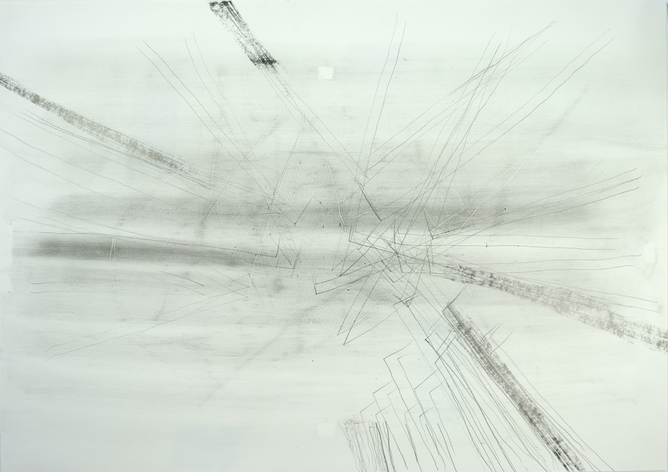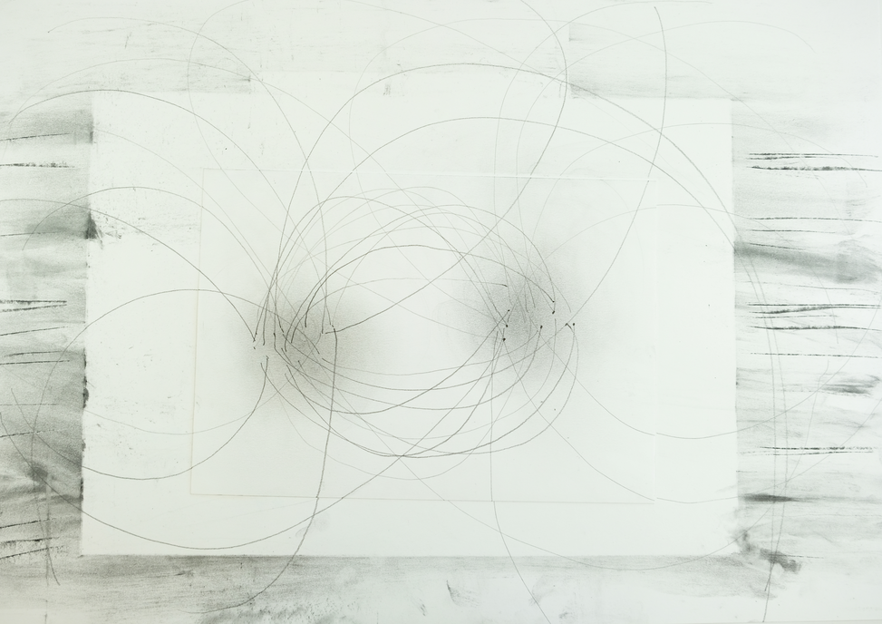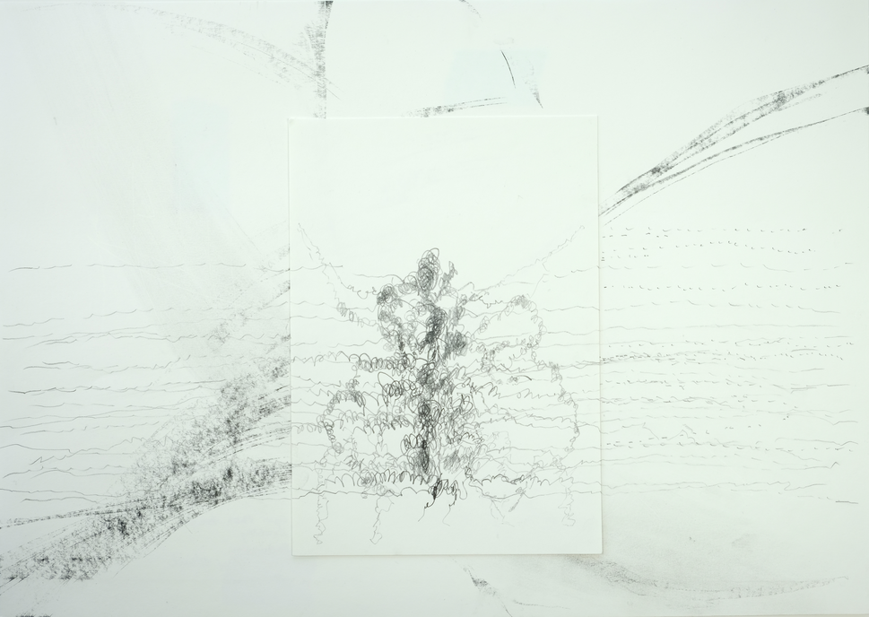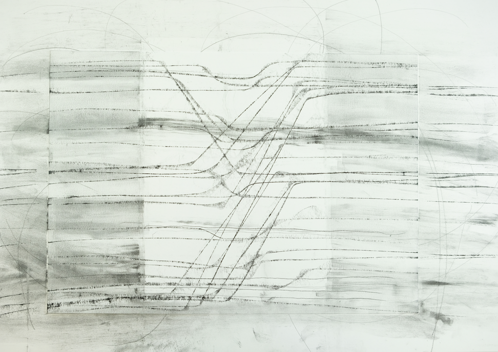 IV. Possible crystallisations of meaning. An extension of the non-verbal, expanding. No hurry. Not yet. Not yet. Inhaling, exhaling. Drawing into and drawing out. A remembered experience – there it has to develop. A decision in multiple touch, in touch with multiple surfaces. A sense of recognising. This play of momentums. Realising resonance. Sinking. Sensible boundaries, or rather changes in curvature. Constantly breathing in and out. Concurrency intervening, just appearing. Coming back to time, realising. Letting. Listening. Wondering, intermingling. This bleed of the present, opening and closing, constantly deciding. There is a call there. Drawing in and drawing out. Conditions changing, sensorially open. Edges sharpen, an indeterminate beyond. A line, a line shimmers and falls back. Airing. Trembling. Blurring. Pulsing. Wavering. Pressing. Pulsing. In touch, of surface, of line, of hand, of edge. Soft letting, leaning. Turning elsewhere. A liminal space between seeing and touching. These shifts in register, turning. Changes of angle, of perspective. A reorientation of the page. In the blankness, an opening. Invitation, for some intervention. Crystallisations of meaning, concurrency intervening. Concurrency as a way of proceeding. Trusting, trusting, following the trusting. Drop of expectation, to be surprised again. Changing, yet maintaining slowness. Sensorially open, this shifts of register and perspective. Deactivating the willing, a change in mode might feel necessary. Barely perceptible reorganisation of possibilities. A decision is revealed – yet not cut is made, to de-cision. Fluid, disappearing. The space between sense and the coming to be of sense. Landscapes, edges, curvatures of sense. To stop and observe these edges, shifting. Shifts, observing, not focusing on anything else. Expansion. Blur of form expanding. Trembling. Disorientation, reorientation, reimagining. Reconnection of the lines, breaking. Expanding. A closer connection. Reconnection. The touch of unexpected line or edge. Testing. Nearness. Wavering line, occluding. Revealing, unveiling. Touching, meeting. Departing. Edging. Edging towards. Edging away from. Moving into. Into stillness, a slowness. Disappearance. How to wait for the other? Not about. Disappearing. Seeing. Transfer the focus, the impulse. A small blank space. Extension of the non-verbal, expanding. It has to develop. Letting. Observing. A quality of in-between-ness. Letting as a different kind of decision unfolding, oscillating, not forcing. This sense of movement, this happening.