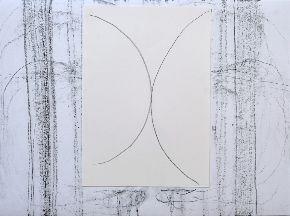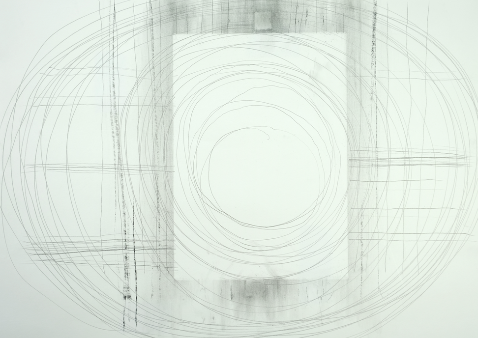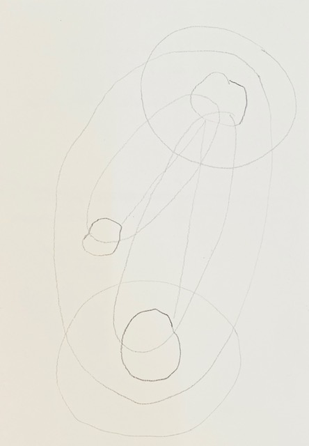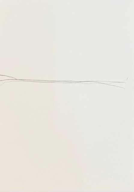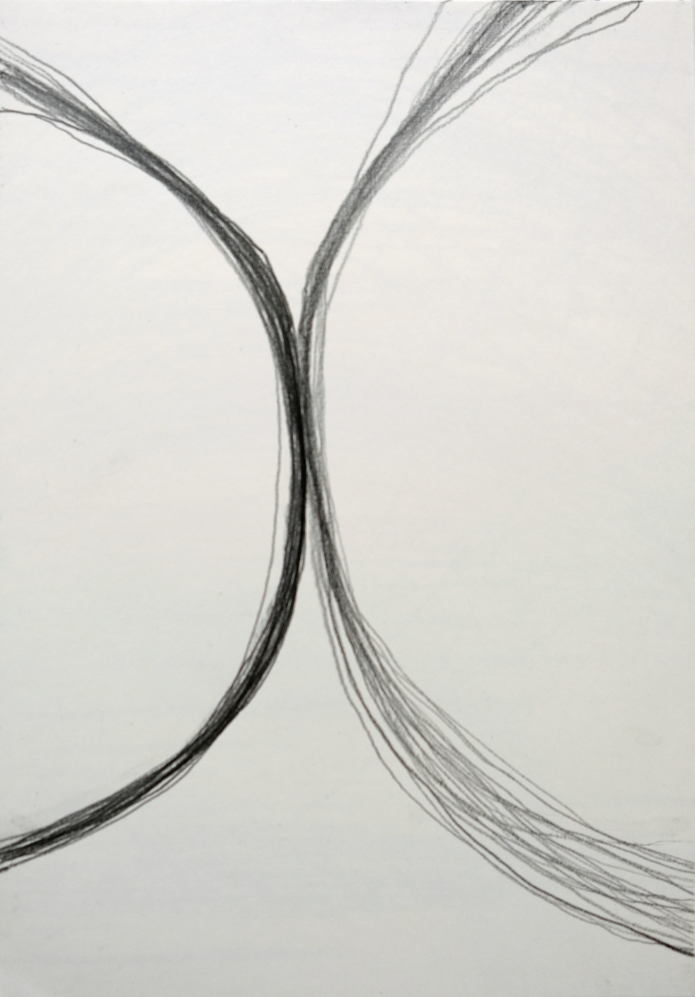 Interstices that appear creating differences. Differences embracing interstices - liminalities. These different directions. A blankness brings a sense of continuity. Now only a gap in the line. An opening, expectant. Filled or followed. Continuity re-established. Crossing of the line. Turning. How to activate a space yet leave it open, this liminal space of possibility. Structure can return quickly. Unexpected tangents. Turns. A curve of the line. Turning - creating a change of curvature. To turn to bend or swerve in direction. Bending. When to stay with and when to turn. Bending - in more than one dimension. Pliancy - this pli of folding, this folding of the line, folding of focus. Folding. Compliant - as in folded with. Folding - in one dimension. Blur of dimensions, this folding of inside and outside, of figure and ground. Drilling concepts - without intending. Again an inversion. Folding or swerving. Versioning. Reversing. Conversing - this versing together. This folding together, this being in conversation. Again an inversion: concepts around the emptiness appearing somewhere in the space. Tending inwards. A tendency towards folding or bending, inclination. Curvature as inclination. The volume? This bending of the line. The sphere? They demarcate and occupy. Holding. Waiting. This emptiness appearing somewhere in the space, to the sides. Discontinuity, a line broken. Yet reconnection, again, reconnection. This shadow and the line touch, opening. Waiting - for these empty spaces to close? To be closed? To grow? Opening, then not so much closing, but reconnection, repositioning. To grow and emptying more. Reorganisation. Turning. Seeing afresh. Emptying further conceptual ground. Seeing it from a different angle. Shift. Shift of focus. Turning of attention. Empty focus of reconnection. As if turning oneself on one's head. To see what appears. Dropping. An upwards surge of lines that were once falling. A gap appears. An opening, expectant. What crosses this small field of observation, waiting. Holding the space open, space becoming full and expectant. Saturated with possibilties. A mark sets a direction. Not seeing and yet still waiting. Not having the continuity broken. These sensible boundaries, this flow of sense. Sensible boundaries, or rather changes in curvature. To be apart whilst also remaining in touch. Energetic forces: disruption, intervention. Yet still slowness in the speed. Reaching, crossing. Navigating this opening, this threshold. Coming back. These two zones, these two zones intermingling. Wondering. Concurrency of resonance. This opening of something unexpected, these shifts in register. Pulsing, shimmering. Interests settling. A decision arising or materialising. No 'me' controlling, as a ground for proceeding. Periphery of attention, soft and open. Even if at the centre, this sense of focused core. Receptivity at the edges, to what else might be unfolding. This potentiality of appearance, this 'almost' also has an edge. Letting the meaning appear, the aliveness of bodily movement, it is the same with the voice and the breath. This sense of the 'no I'. This sense of no hurry, no speed or slow as such. These zones intermingling in the inbetweenness of thinking. Observations less tethered to the one or the other. Intrinsically concurrent, intermingling - both in a sense. Inhabiting hesitation: fine thin delicate membrane. Waiting. Waiting to see, actually, not seeing and yet still waiting. Listening. Remaining. Relation as a spacing. Letting things, disappearing. Vibrating: a time frame opening, something appearing. What comes through: it is not obvious, but indirect. Reacting thus in different ways - this pulsing of individual rhythms. This zone having no temporal coordinate. The sense of there being no I. Not audible, yet where am I listening? Following a rhythm. There is a different pace to the appearance of words, to the inhaling and exhaling. No temporal coordinates, only liveness, an aliveness, this concurrence of the present. This bleed of the present, opening and closing. Turning. Sinking. Deactivating the willing. Soft letting. A coming-into. This happening, and this felt in the body, unfolding. Indeterminate. Suddenly a change, expansion. There is a call here. Something shifts and new possibilities become tangible or felt. Continuity, constantly. Cohabitation. Changes of scale. Curvatures. Concurrency. Crystallisations of meaning. No cut is made, no de-cision. Fluid the sense of coming-to-be. This quality of inbetween-ness - not forcing. Transfering the focus of impulse, resonating. Re- again. Becoming indistinguishable. These shifts, these edges. Parallel spaces and parallel times.