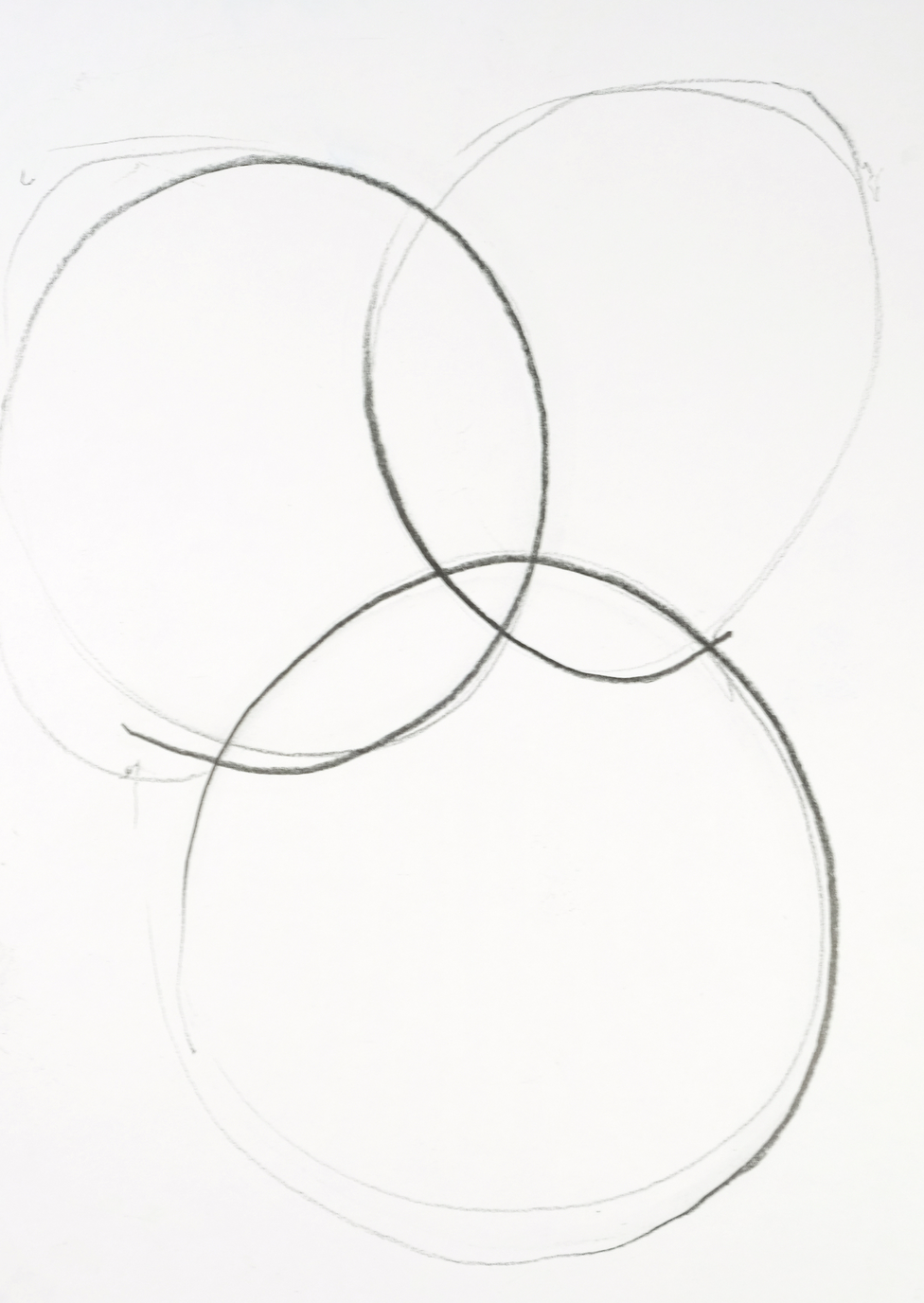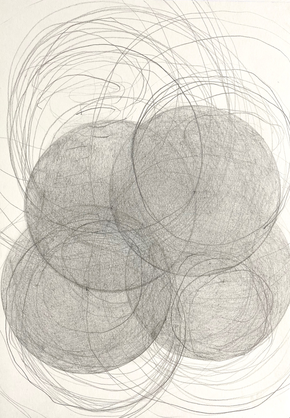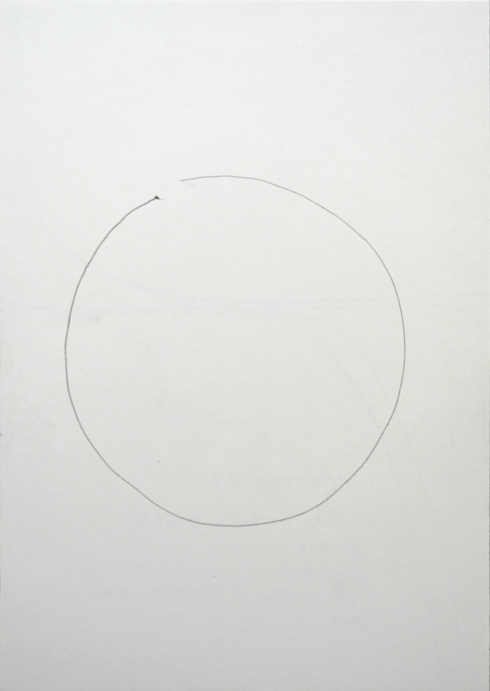 Interstices that appear creating differences. Differences embracing interstices - liminalities. These different directions. A blankness brings a sense of continuity. Now only a gap in the line. An opening, expectant. Filled or followed. Continuity re-established. Crossing of the line. Turning. How to activate a space yet leave it open, this liminal space of possibility. Structure can return quickly. Unexpected tangents. Turns. A curve of the line. Turning - creating a change of curvature. To turn to bend or swerve in direction. Bending. When to stay with and when to turn. Bending - in more than one dimension. Pliancy - this pli of folding, this folding of the line, folding of focus. Folding. Compliant - as in folded with. Folding - in one dimension. Blur of dimensions, this folding of inside and outside, of figure and ground. Drilling concepts - without intending. Again an inversion. Folding or swerving. Versioning. Reversing. Conversing - this versing together. This folding together, this being in conversation. Again an inversion: concepts around the emptiness appearing somewhere in the space. Tending inwards. A tendency towards folding or bending, inclination. Curvature as inclination. The volume? This bending of the line. The sphere? They demarcate and occupy. Holding. Waiting. This emptiness appearing somewhere in the space, to the sides. Discontinuity, a line broken. Yet reconnection, again, reconnection. This shadow and the line touch, opening. Waiting - for these empty spaces to close? To be closed? To grow? Opening, then not so much closing, but reconnection, repositioning. To grow and emptying more. Reorganisation. Turning. Seeing afresh. Emptying further conceptual ground. Seeing it from a different angle. Shift. Shift of focus. Turning of attention. Empty focus of reconnection. As if turning oneself on one's head. To see what appears. Dropping. An upwards surge of lines that were once falling. A gap appears. An opening, expectant. What crosses this small field of observation, waiting. Holding the space open, space becoming full and expectant. Saturated with possibilties. A mark sets a direction. Not seeing and yet still waiting. Not having the continuity broken. These sensible boundaries, this flow of sense. Sensible boundaries, or rather changes in curvature. To be apart whilst also remaining in touch. Energetic forces: disruption, intervention. Yet still slowness in the speed. Reaching, crossing. Navigating this opening, this threshold. Coming back. These two zones, these two zones intermingling. Wondering. Concurrency of resonance. This opening of something unexpected, these shifts in register. Pulsing, shimmering. Interests settling. A decision arising or materialising. No 'me' controlling, as a ground for proceeding. Periphery of attention, soft and open. Even if at the centre, this sense of focused core. Receptivity at the edges, to what else might be unfolding. This potentiality of appearance, this 'almost' also has an edge. Letting the meaning appear, the aliveness of bodily movement, it is the same with the voice and the breath. This sense of the 'no I'. This sense of no hurry, no speed or slow as such. These zones intermingling in the inbetweenness of thinking. Observations less tethered to the one or the other. Intrinsically concurrent, intermingling - both in a sense. Inhabiting hesitation: fine thin delicate membrane. Waiting. Waiting to see, actually, not seeing and yet still waiting. Listening. Remaining. Relation as a spacing. Letting things, disappearing. Vibrating: a time frame opening, something appearing. What comes through: it is not obvious, but indirect. Reacting thus in different ways - this pulsing of individual rhythms. This zone having no temporal coordinate. The sense of there being no I. Not audible, yet where am I listening? Following a rhythm. There is a different pace to the appearance of words, to the inhaling and exhaling. No temporal coordinates, only liveness, an aliveness, this concurrence of the present. This bleed of the present, opening and closing. Turning. Sinking. Deactivating the willing. Soft letting. A coming-into. This happening, and this felt in the body, unfolding. Indeterminate. Suddenly a change, expansion. There is a call here. Something shifts and new possibilities become tangible or felt. Continuity, constantly. Cohabitation. Changes of scale. Curvatures. Concurrency. Crystallisations of meaning. No cut is made, no de-cision. Fluid the sense of coming-to-be. This quality of inbetween-ness - not forcing. Transfering the focus of impulse, resonating. Re- again. Becoming indistinguishable. These shifts, these edges. Parallel spaces and parallel times.