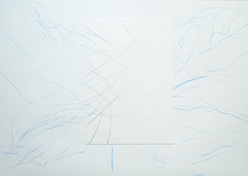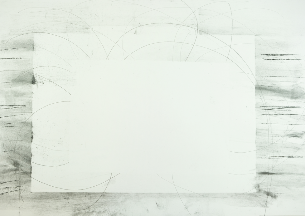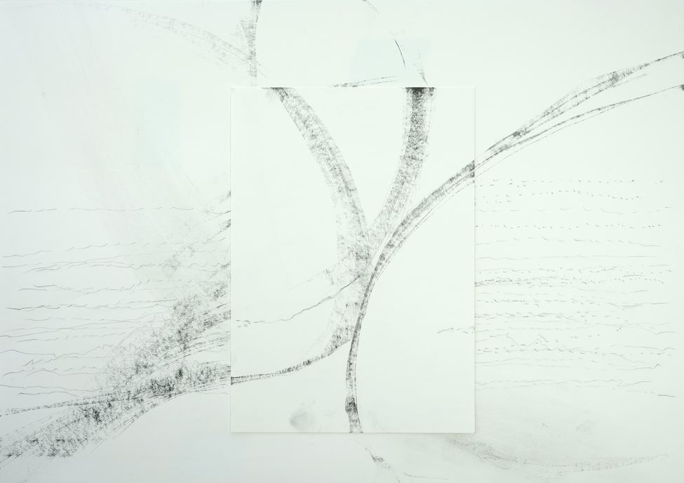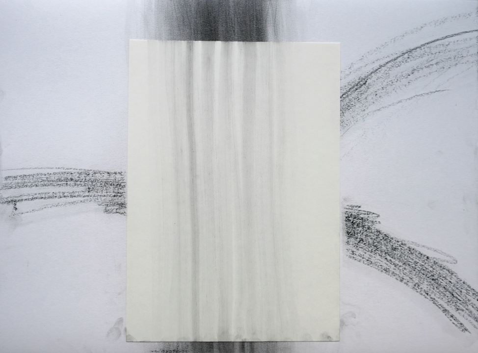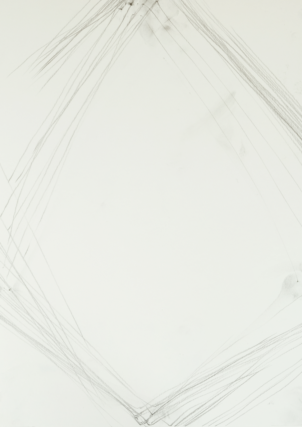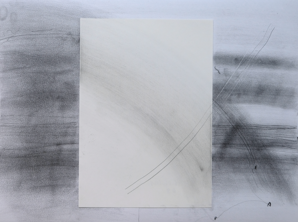 Sounding rather than touching. Letting a different kind of decision making enter this other time. Indentation. Register of contact. Of pressure, of force. Coming from beyond the frame, the frame remains. A line bends. This process makes evident the exclusivity of the frame, its agency of excluding as well as including. Trembling sense of force, of exertion. Releasing. Letting. Material exerts its own force. The paper too has bends and curvature, lines separating this from that, one part from another. Becoming horizon. Highlighting the corners, the space of shadow appearing. This blurring of the edge. Mirroring. Moving in relation. Delicate dance of connection. Both continuity and discontinuity between the frames. This parallelity of space, parallel spaces and parallel times. Cohabitation. Dissolving. Meeting. Breathing. Meeting. Continuity and discontinuity. Translation, meeting. Mirroring affect. Finding of a level, like water settling, oily. Surfaces settling, rising. Lightening.