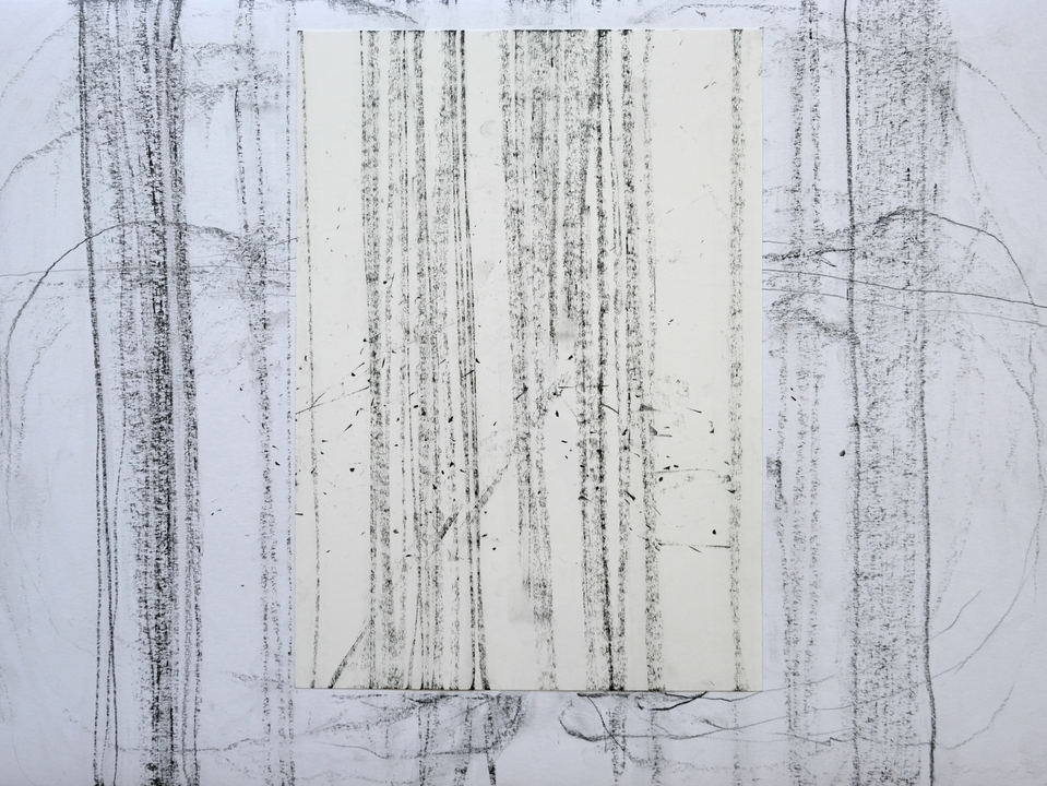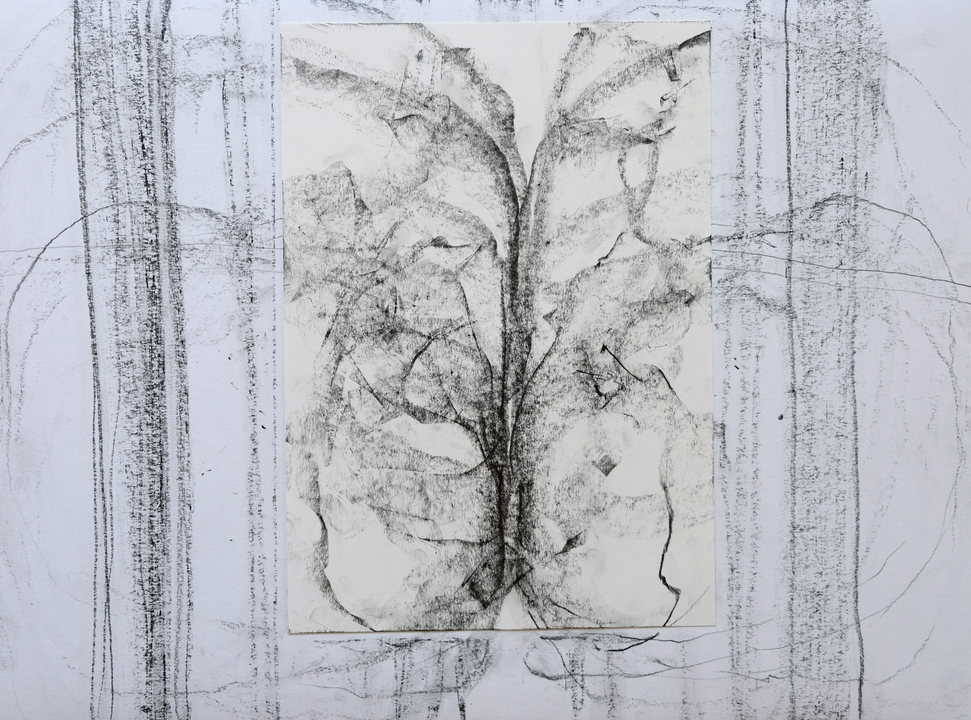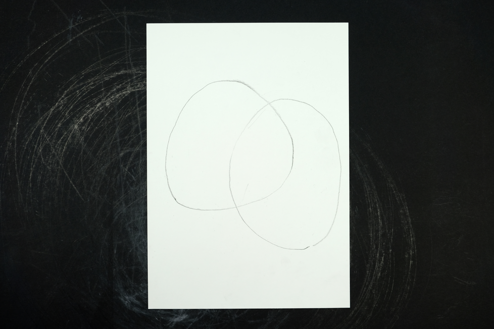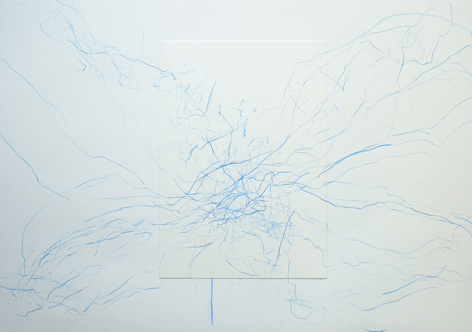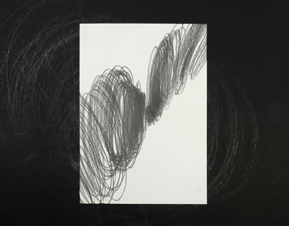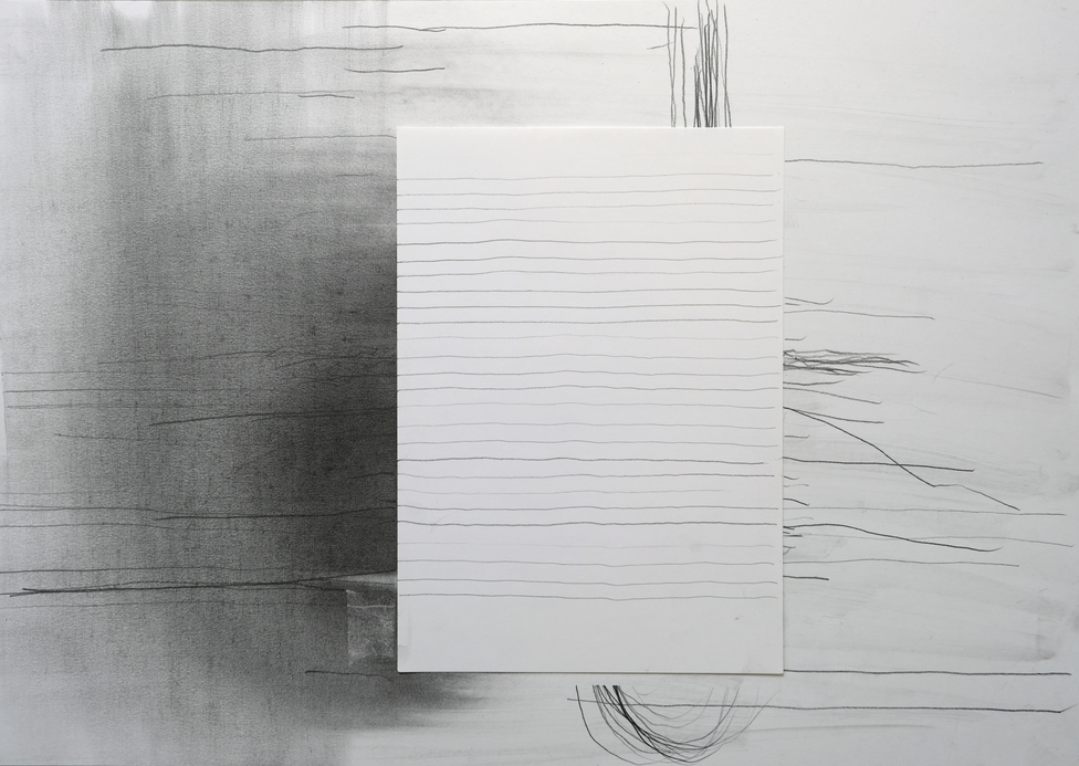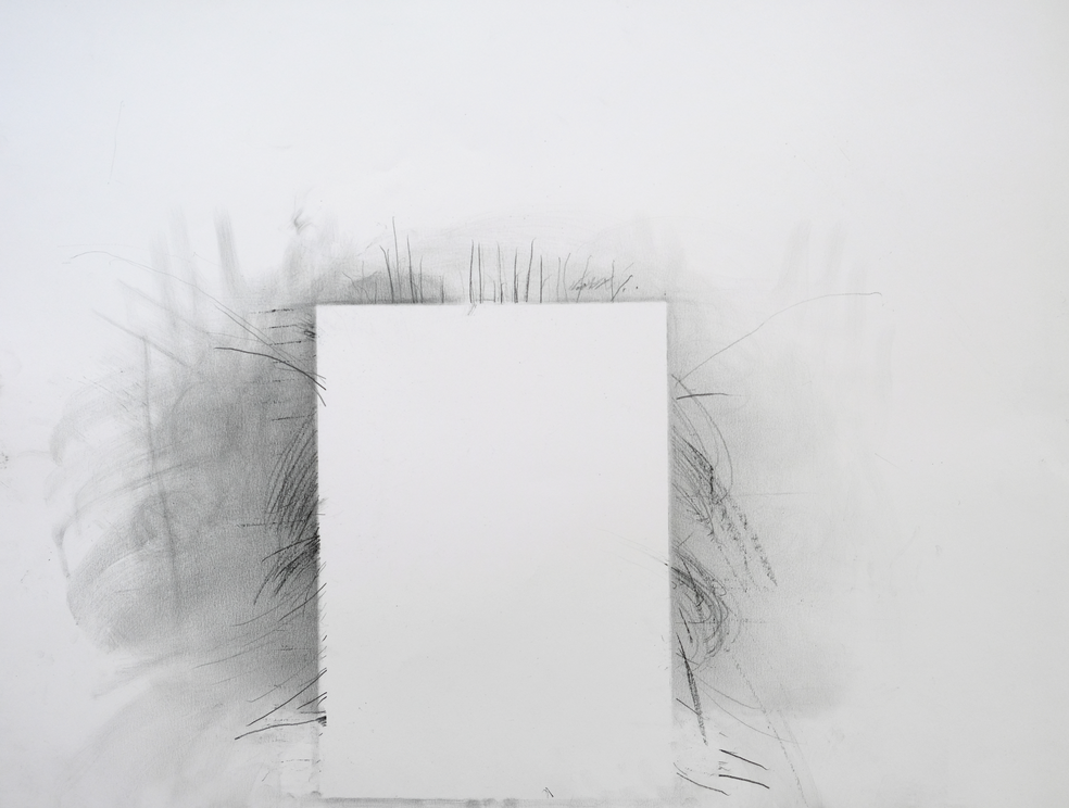 Sounding rather than touching. Letting a different kind of decision making enter this other time. Indentation. Register of contact. Of pressure, of force. Coming from beyond the frame, the frame remains. A line bends. This process makes evident the exclusivity of the frame, its agency of excluding as well as including. Trembling sense of force, of exertion. Releasing. Letting. Material exerts its own force. The paper too has bends and curvature, lines separating this from that, one part from another. Becoming horizon. Highlighting the corners, the space of shadow appearing. This blurring of the edge. Mirroring. Moving in relation. Delicate dance of connection. Both continuity and discontinuity between the frames. This parallelity of space, parallel spaces and parallel times. Cohabitation. Dissolving. Meeting. Breathing. Meeting. Continuity and discontinuity. Translation, meeting. Mirroring affect. Finding of a level, like water settling, oily. Surfaces settling, rising. Lightening.