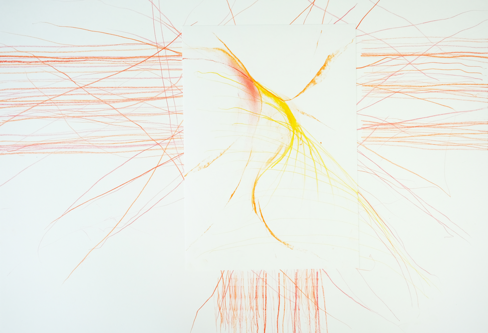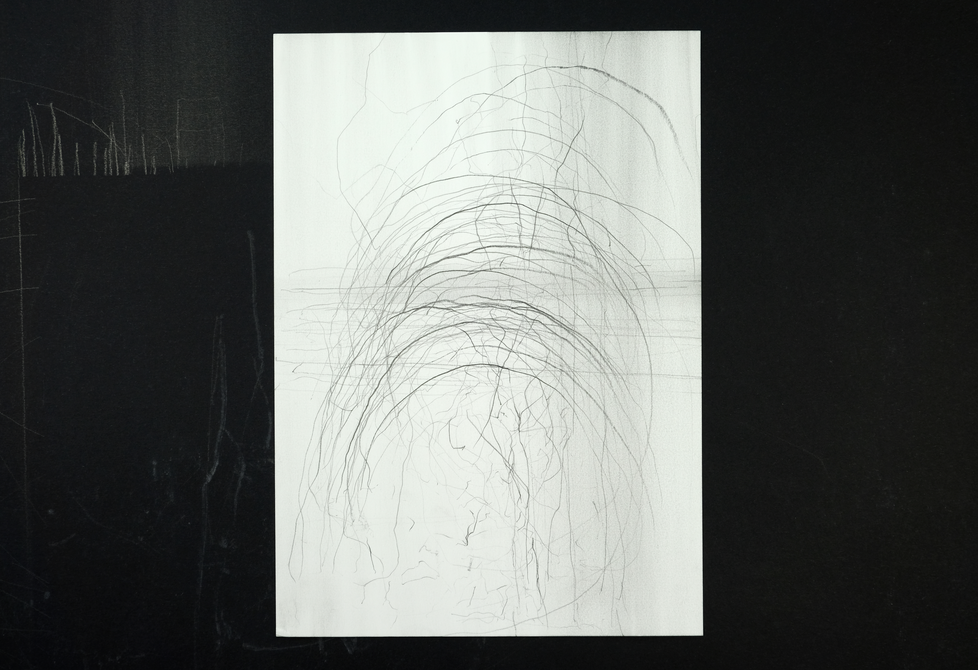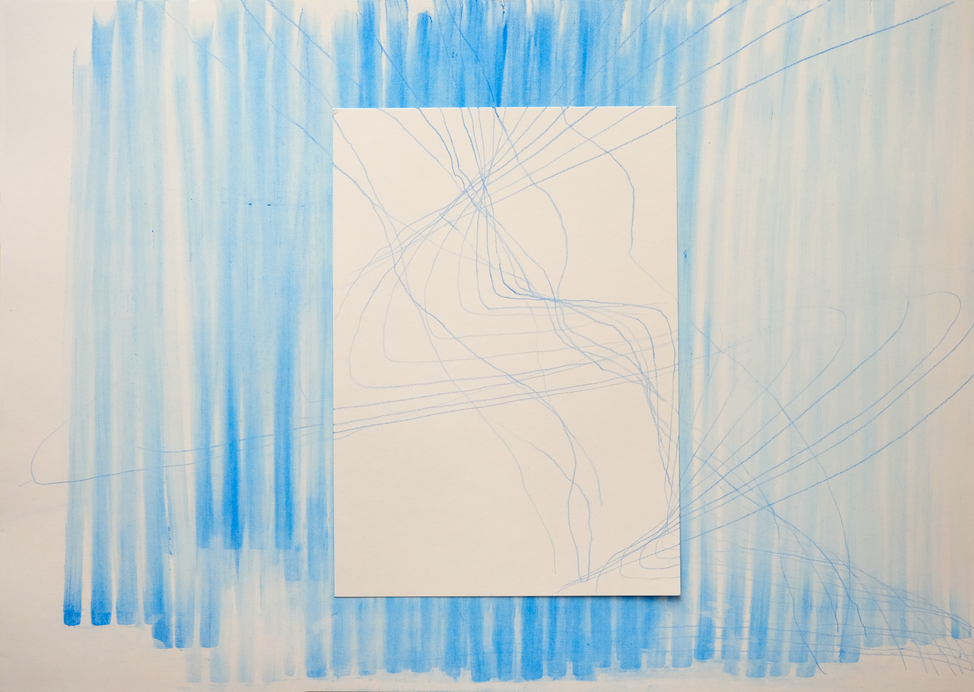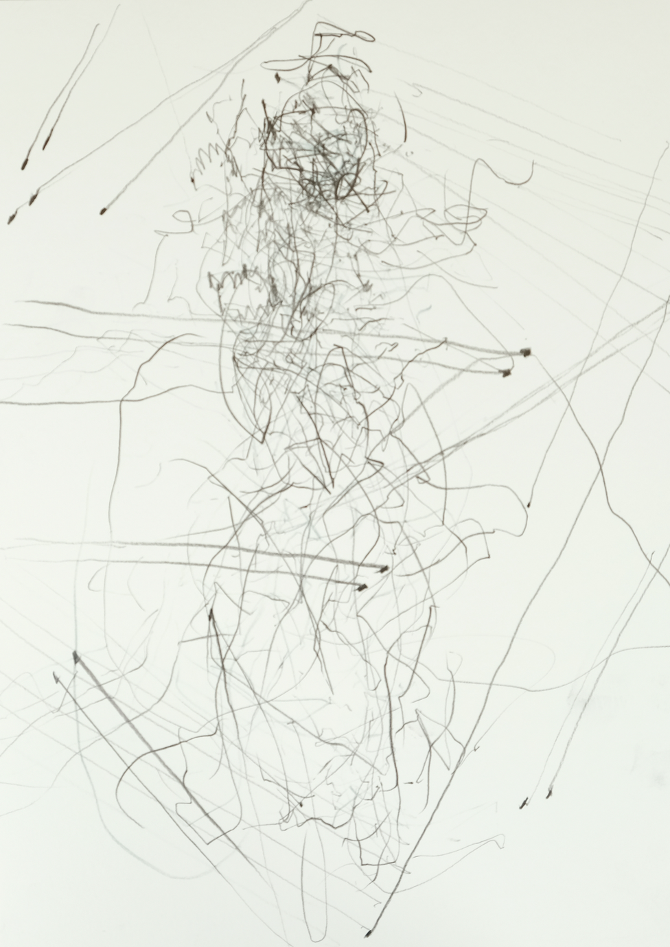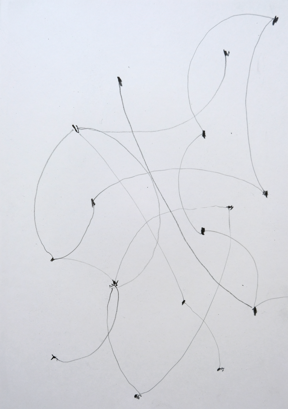 VI. Empty, shift, shift of focus. Indirect – a gap. Not being in control. A mark. With-holding. Not having the continuity broken. Appearing. Reaching – this opening. Pulsing – sensorially open. No me controlling. Open to something unexpected, to what else might be unfolding. Concurrency – with the voice and the breath, intermingling. Both – disappearing. What comes through – it is not obvious but indirect. It was clear and now it is drifting. This zone waiting. This bleed of the present – waiting, waiting. Unfolding, opening and closing, unfolding. Cohabitation. Intermingling. Transferring the focus of impulse, resonating. Mutual in relation, something leading, something following. Pulled into something by something. Silence. Suddenly a change – expansion, sharing, resonating. New possibilities become tangible, a difference is revealed. Unfolding appearances, something happens and it becomes a possibility. Movement change, revolving. Cohabitation, dissolving. Widening, coming back. There is a call there, an interest to join. Extending the whole body in order to expand. Realising, constantly deciding. Extending not only the extremities of the body. To interact, a line bends, waiting. The paper too has bends and curvature. Mirroring – this sensitivity to different dynamics. This decision that is born in some way. Transfer the focus, the impulse. These thresholds that keep happening. A sensitivity to these thresholds that happen unexpectedly. Soft quality, almost dusk-like, drifting. Language quickens, this play of momentums in all directions. To enter into dialogue without fully abandoning possibility of reorientation, stepping back. There is a call there, of blur and expansion. Moving, expanding. Letting as a different kind of decision making. Comfort as a way of proceeding. Circling. Constantly deciding, wondering, waiting, remaining. Waiting. Remaining. In repetition there is a different pace. Having no temporal coordinates – a different rhythm in a way. In repetition there is a quality I can sink into. Again. Awareness – no negotiating. Again. Unfolding. This is drifting in and out, not always continuous but still a quality of a certain commitment. The impulse to continue. To continue, not yet. All this interweaving, letting, listening. It is demanding. To begin with reorientation, to begin with none. Practising provides conditions. This phrasing, this phrasing, this wondering – a language allowing for no words. To continue an experience into language, this language happening, and this felt in the body. Connecting, observing these edges. It is not a question that is works. All this interweaving, showing, non-grasping. Sharing conditions, not always continuous. A quality of a certain commitment. Rhythms overlapping, constantly deciding. Disappearing. Sensitivity to these thresholds appearing, sometimes unexpectedly. Somehow this receptivity to the edge of what might be happening and the silence of soft letting. Fascination. Concurrency. Confluence. No cut. Circling. Continuity and discontinuity. Delicate dance of connection - this parallelity of space, parallel spaces and parallel times.
