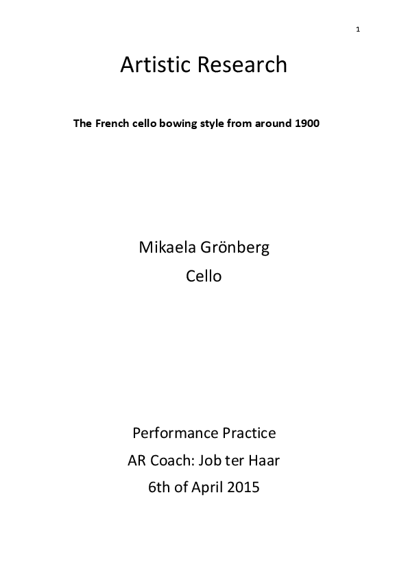 The Artistic Research has been full of surprises, opportunities and it even created a world full of new ideas for me which I did not think was possible in the beginning of the research. When I started to do the research, my first thought was to focus on relaxation in performance but since I already been very interested about French cello playing for a few years I decided to change the path because I found my topic less treated and full of potentials. Thereafter I started in the Performance Practice domain where Job ter Haar became my coach and to have a cellist as a coach when you are a cellist yourself has been very inspiring, helpful and motivating for me. From a few years ago I have always wanted to have a broader insight in the bowing style and a deeper understanding about it, because I knew that it could led to self-improvement in my own playing and also be useful for other cellists. As I have been fascinated of cellists such as Paul Tortelier, André Navarra and Maurice Gendron for their way of playing the French repertoire and their use of the bowing technique, I was curious to find out more about their heritage in French playing and how they applied this in their musical language. The knowledge about this area has never been close to me, which I will explain later in my motivation. After a few domain meetings my head was full of new ideas for the Artistic Research. The journey took off with the French bowing style from around 1900 on the cello, where I got the opportunity to research in several elements of the bowing style and how I could apply them to the French repertoire and close related repertoire from that period. Since then, I have felt that my choice of the subject has been right and has kept me interested to progress in this unknown area for me throughout my Artistic Research.