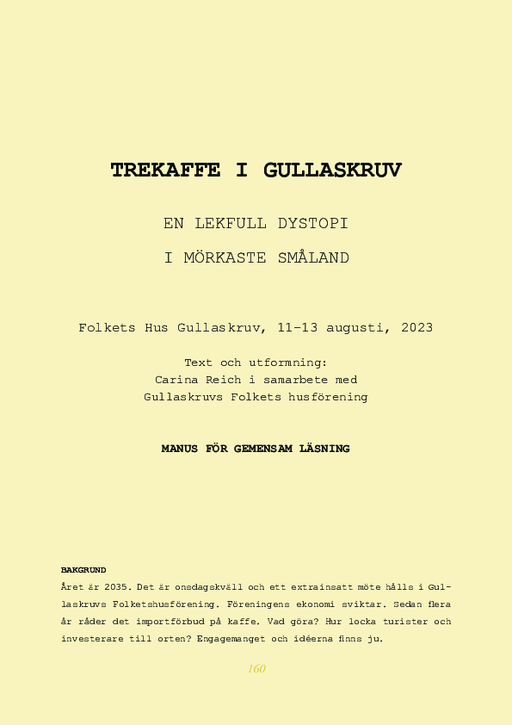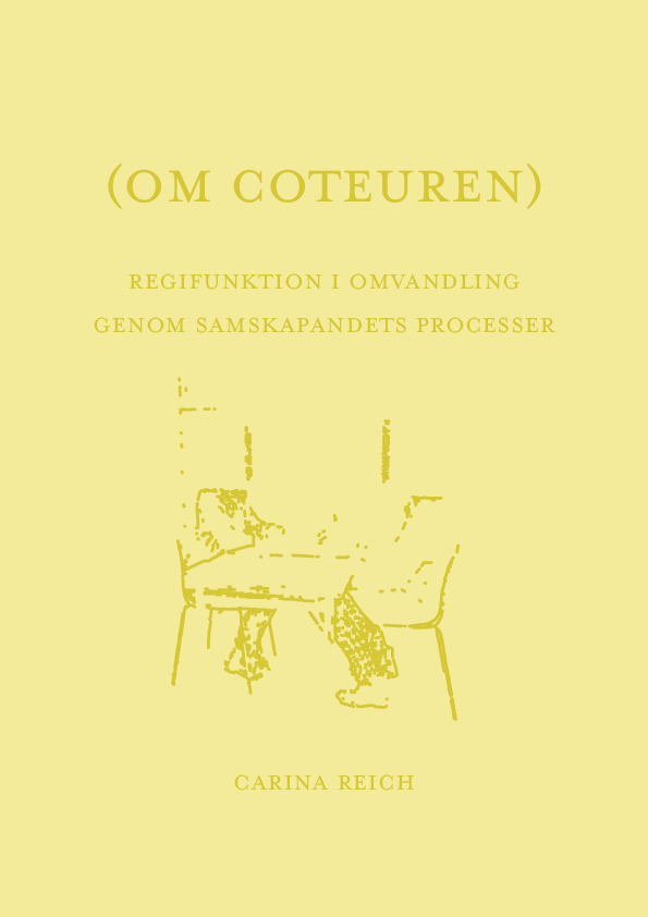 The aim of this documented artistic research project is to investigate functions of directing within an expanded understanding of co-created performing arts. My main question concerns the following. What practices and principles of directing in co-created performing arts are revealed in the sample narratives, expositions and final productions of the thesis, and what do these say about transformations within different spatial and social contexts? The project process consists of four documented stagings and a final performance. It is this way I develop the concept “The Coteur” which stands for a directorial function combining a unique, biographical director function (The Auteur) with the openness of a co-created process formed around place, collaborators and contexts, where the development of an original work start without a script. Here I am interested in what I call ”staged absence” which I consider to be an artistic principle based on the removal of “the expected”. What happens, for example when the lead vocalist and the music are taken out of a popular song to leave behind a group of beat counting back-up singers, looking for their cue and a rhythm. Or when boxers are taken out of the ring and only the choreography of the referee remains. In my artistic research project I want to challenge the premises of co-creative performing art, and the director function, by also using forms for seminars and association meetings, to stage collective readings aloud, from manuscripts. This is combined with autobiographical and reflective writing, influenced by the principles for knowledge in practice, to uncover and develop artistic principles for a co-creative director function.