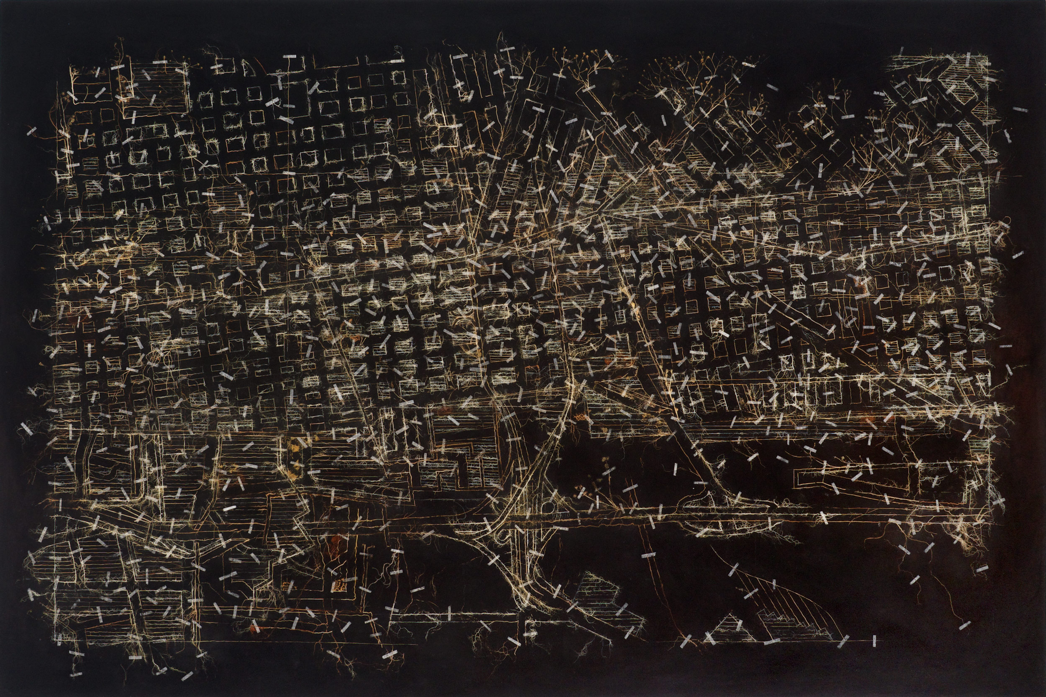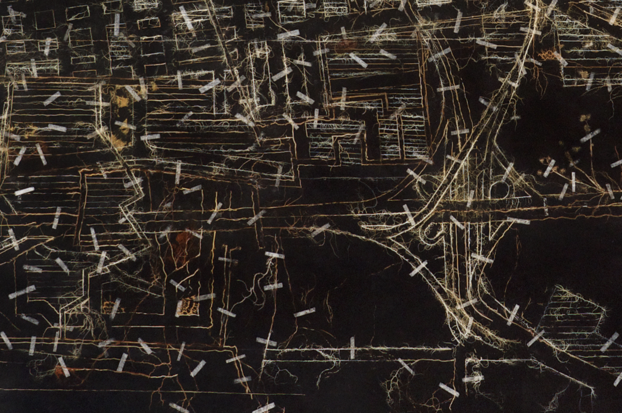 This is a map made by the South African artist, Gerhard Marx. The Garden carpet for Johannesburg series is a set of six large drawings in which the artist uses plant material; mostly roots and weeds to draw text-less road maps of parts of the South African capital, Johannesburg. He first collects the plant materials from spaces around the city, selecting the roots and weeds for their particular “line quality”, before drying and pressing them in an acrylic and glue ground. The whole surface is then sanded to reveal the wooden interior of the plant material. The work was inspired by the Persian Garden Carpets (dating from the 16th century and earlier) which were made with direct reference to the Islamic garden traditions. These carpets depicted the gardens as seen from above and often included idyllic scenes with fruit trees, birds and flowers.