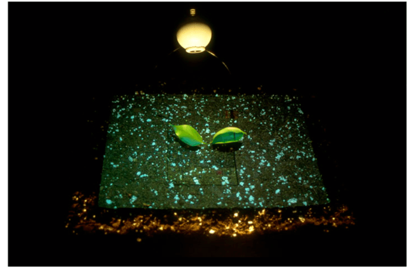 Here’s how it worked: In a dark room, a pedestal with soil acted as a nursery for a single seed. Suspended above the pedestal, was a video projector that allowed remote individuals to send light via the Internet (using their webcams). This light enabled the seed to photosynthesize and grow in complete darkness.