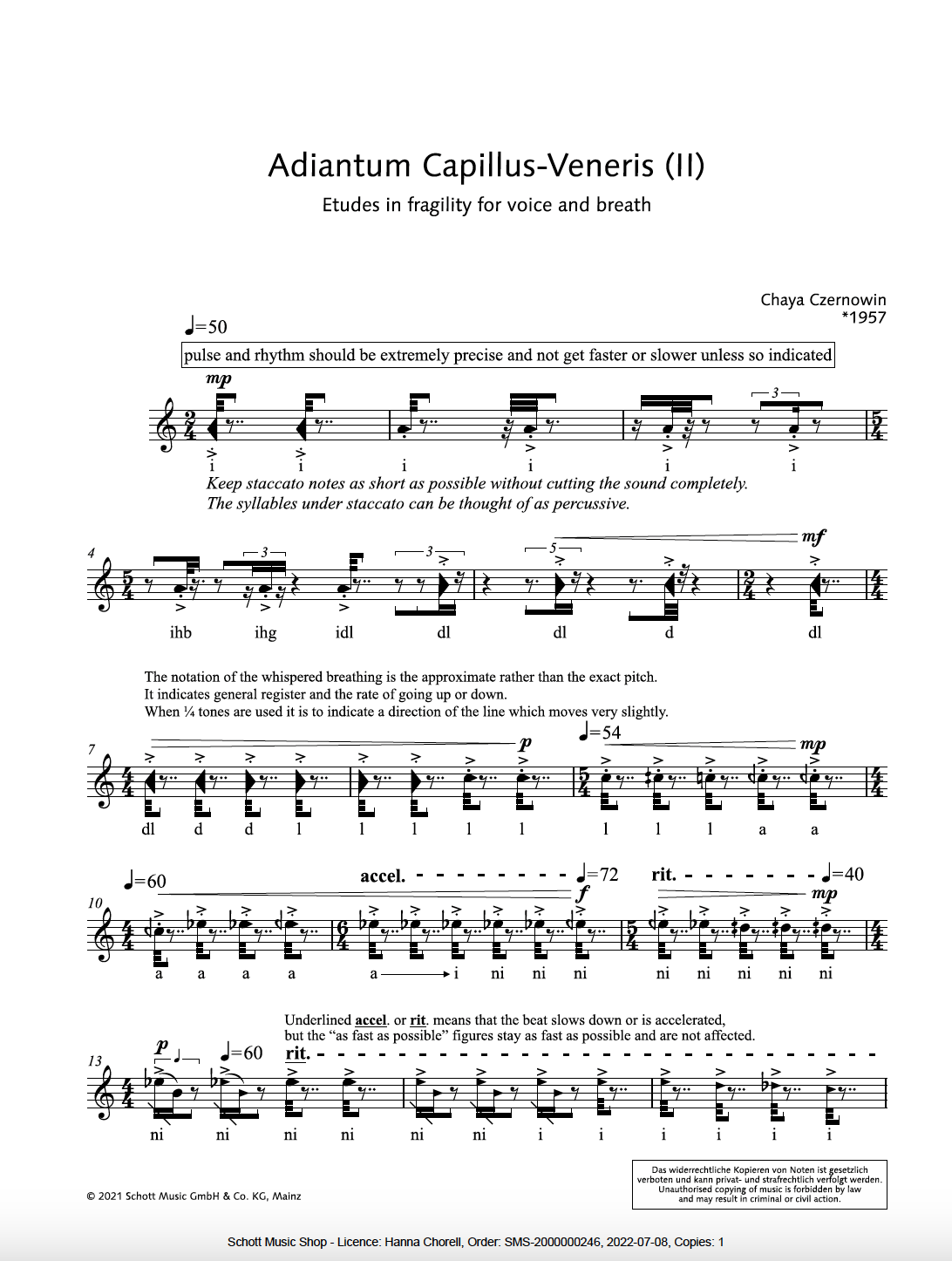 In the musical score of Chaya Czernowin’s Adiantum Capillus-Veneris II, Czernowin borrowed the Latin name for a species of plant – a maidenhair fern - for the title of this bare, and delicately composed study for amplified voice. Subtitled, ‘Etude in fragility’, the voice and breath play an equal role in executing the musical score, as the sounds of breathing are treated as an instrument, independent from the voice. Fragility is present in the piece on many levels; as the fragility of sound, as the plant that inspired the piece, and as the total dependence of oxygen-breathing beings on oxygen-producing plants.